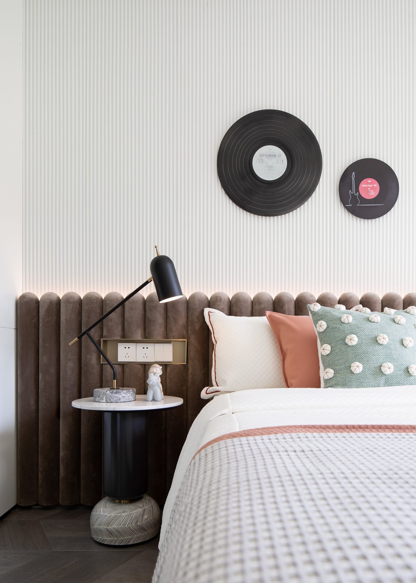 趋近于自然的沉稳色调从主卧空间中展开,同时注入了浓郁的艺术气息,胶片设计的墙面装饰,透露出不拘与灵性。灯饰、柜几等软装陈设在不规则异变中形成新的美学秩序,让音乐与艺术的气息尽情弥漫。