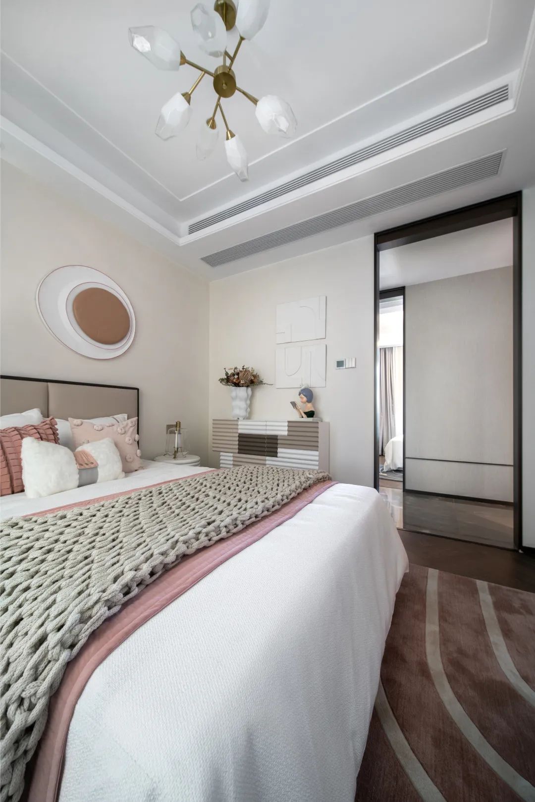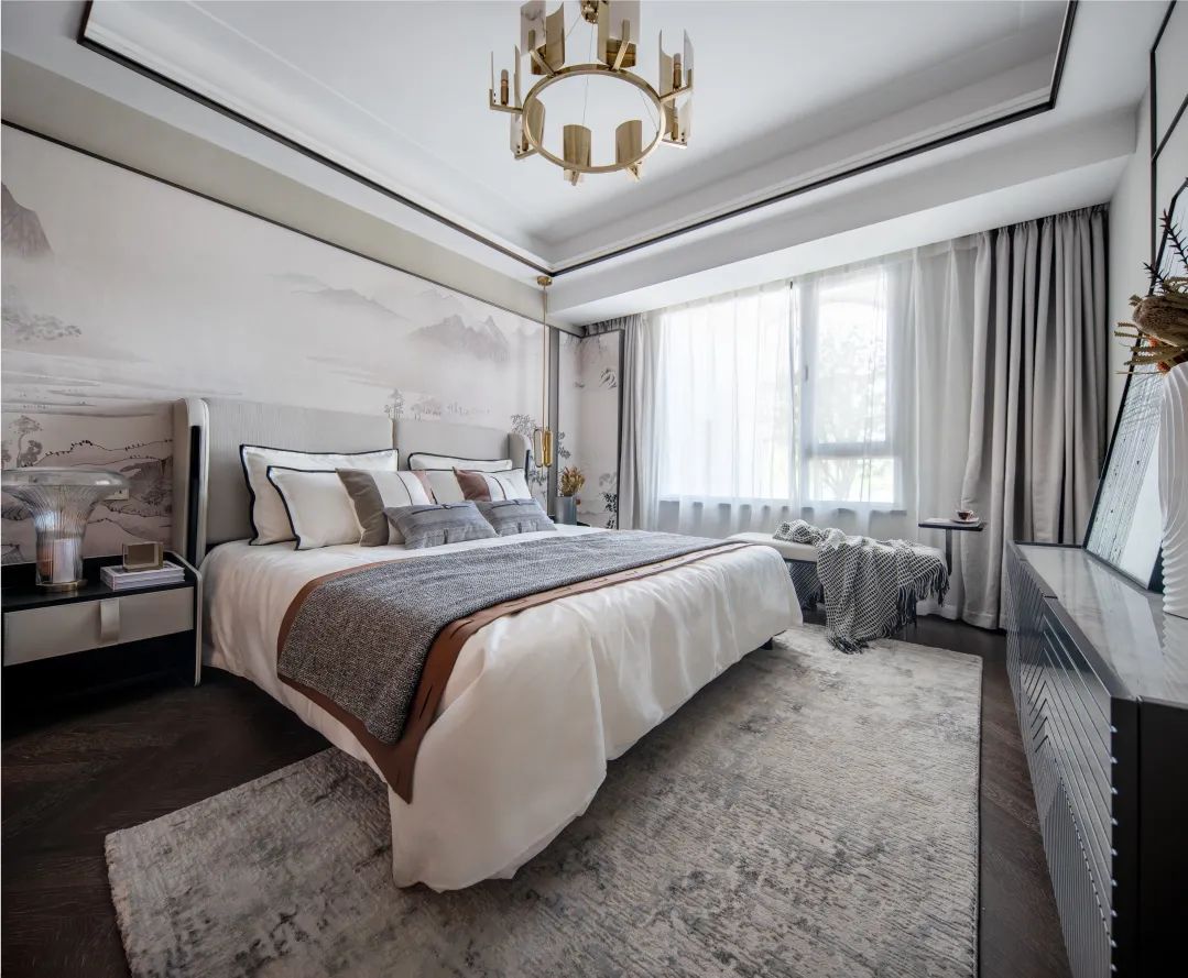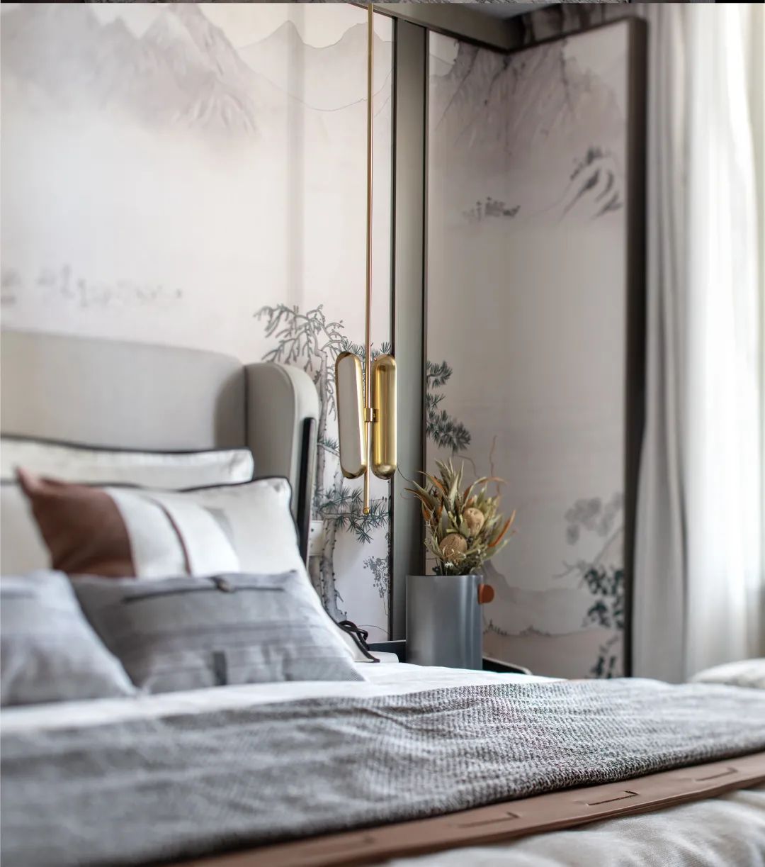 主卧删繁就简,干净利落,回归到居住本身,让各个元素能协调一致,创造出静谧安宁的氛围,卧室以优雅的灰色系为主调,床背景采用简约东方韵味的喷绘壁布,立面辅以金属线条造型,呈现韵律划分,让设计与品质生活完美融合,承载一种大气不失雅致、低调却富内涵的生活方式,实力演绎都市新贵的居住典范。