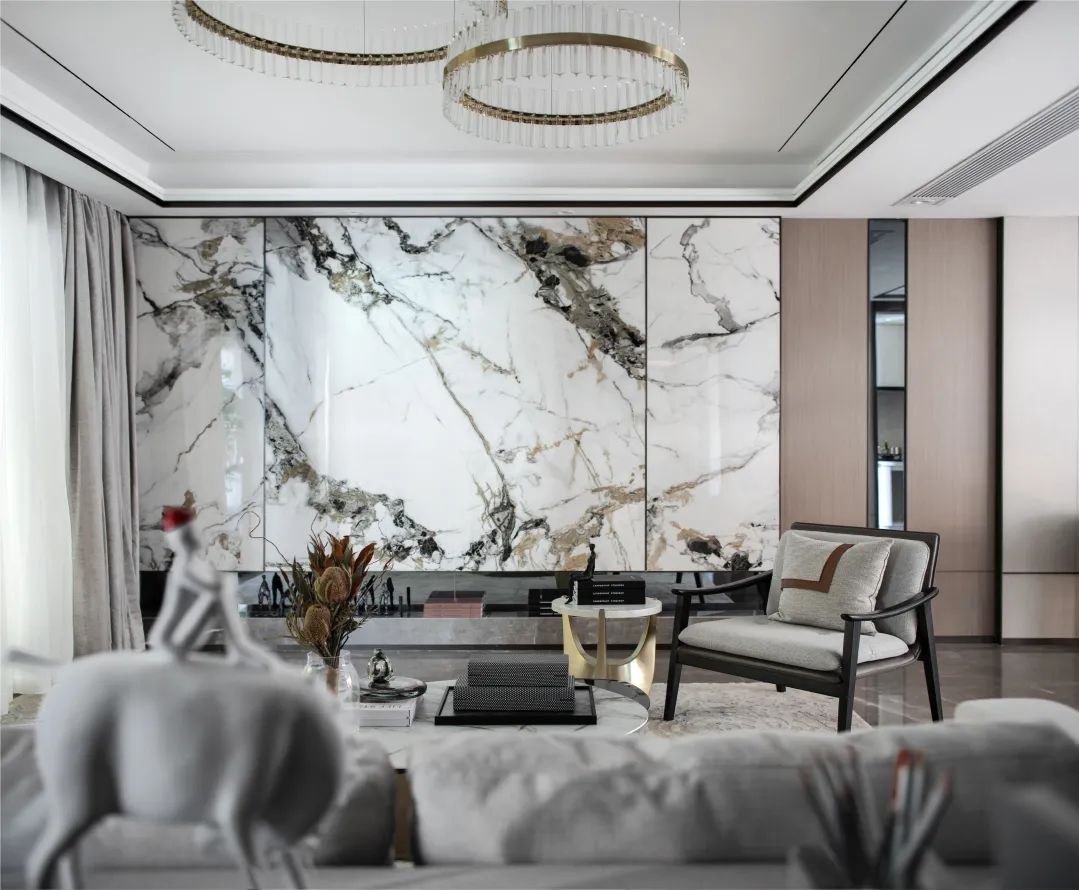 设计选材:大理石地面与墙面硬包、木饰面、岩板、镜面等多种材料结合,低调又不失品质感。