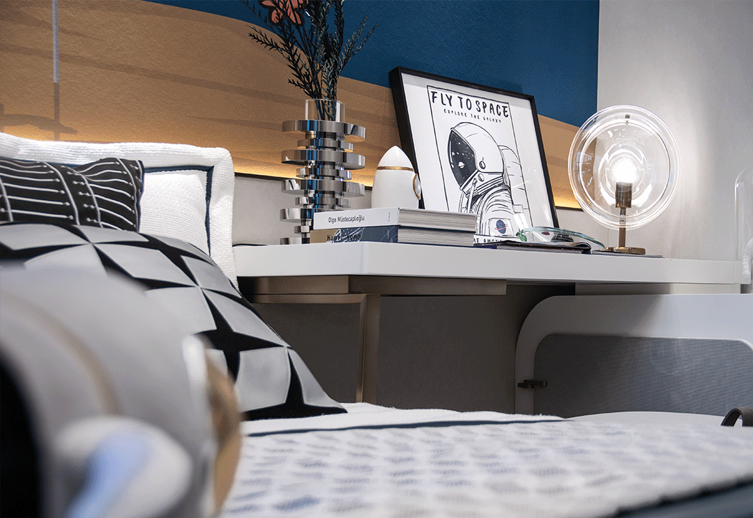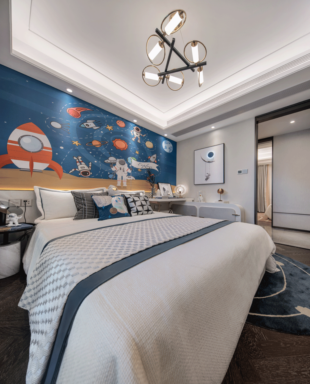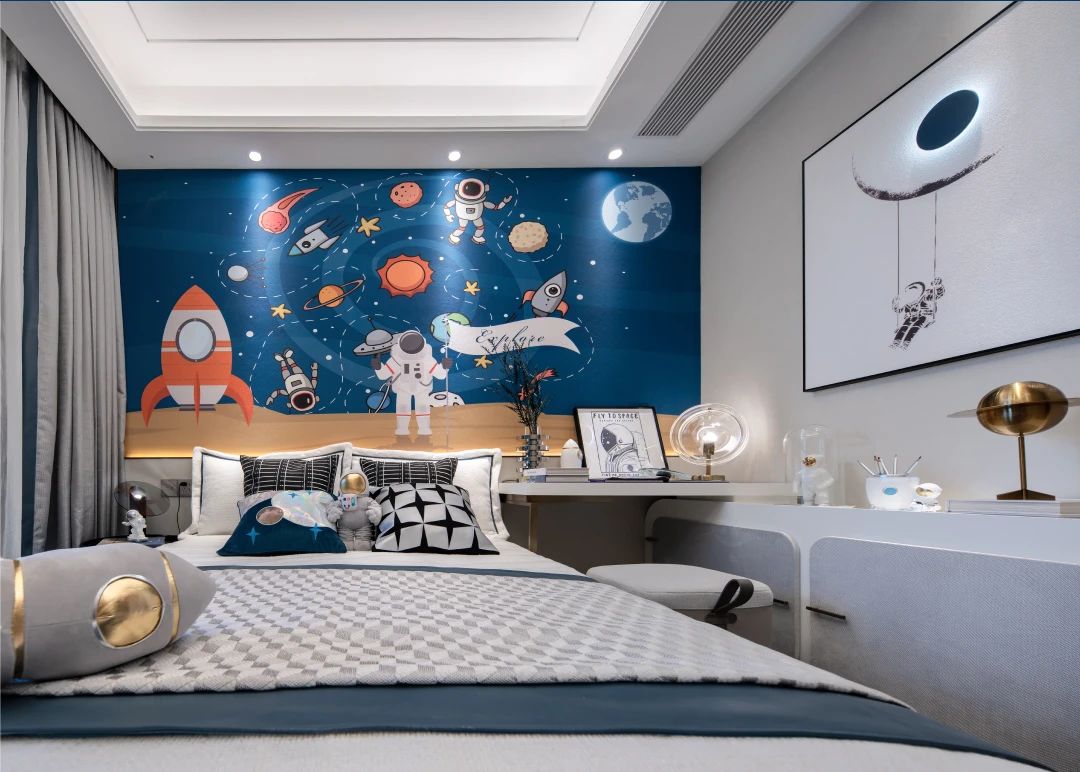 男孩房,巨幅的宇航员墙面绘画、太空元素的抱枕、饰品、文具,充斥着一个男孩对宇宙与未来的美好憧憬。