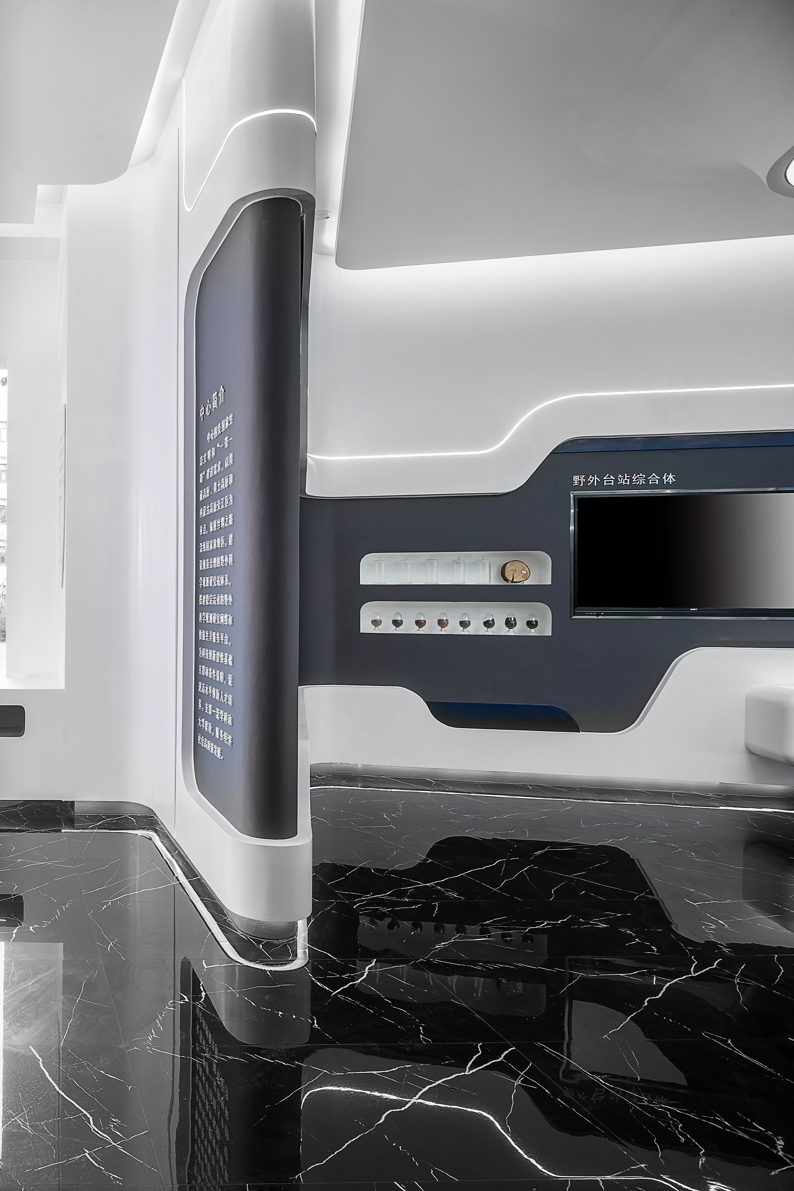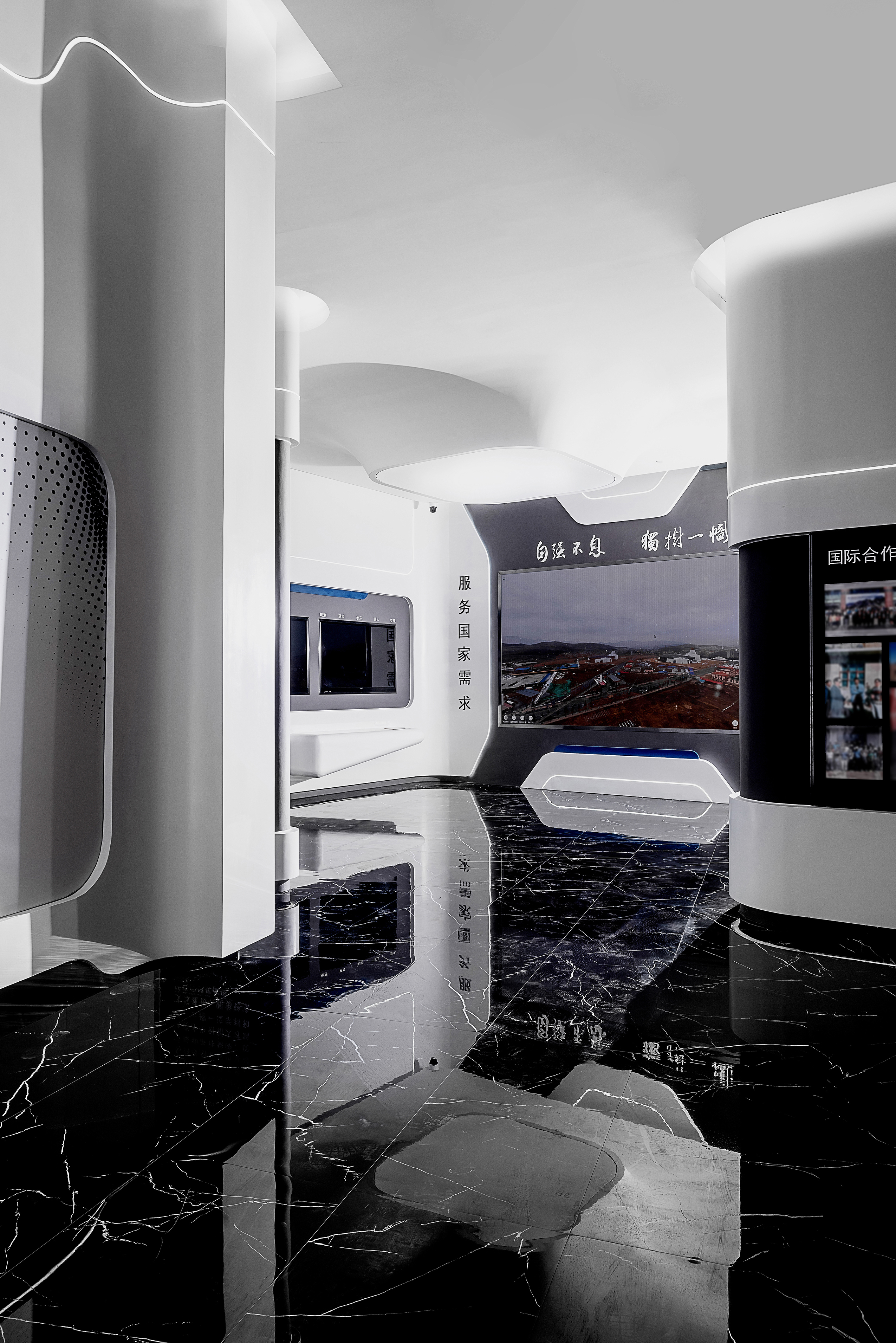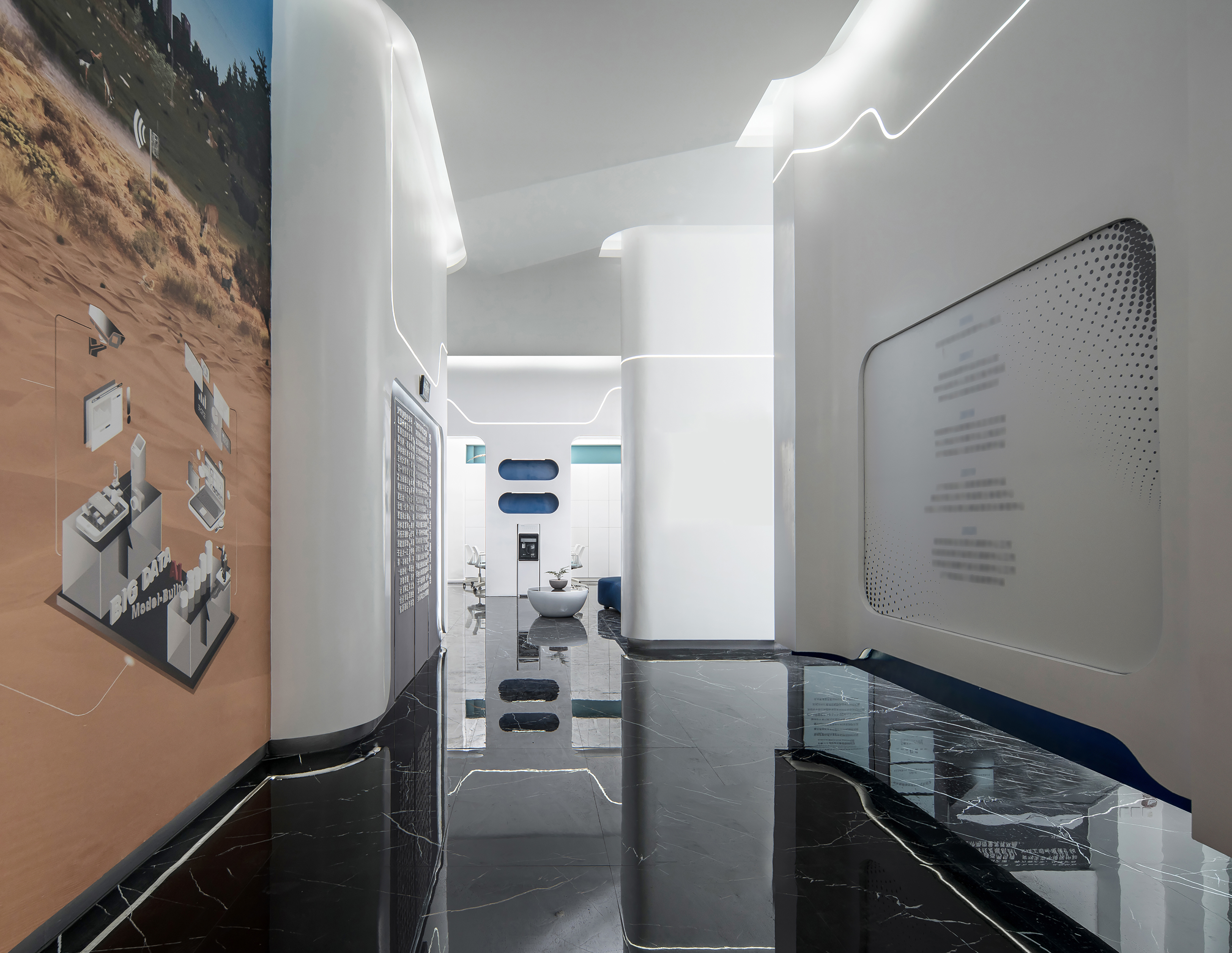 空间意境:整个展厅运用黑白灰色系,以曲线的形态使整个空间更具科技感;镜面地砖反衬出墙面倒影,视觉上拉高了空间;
