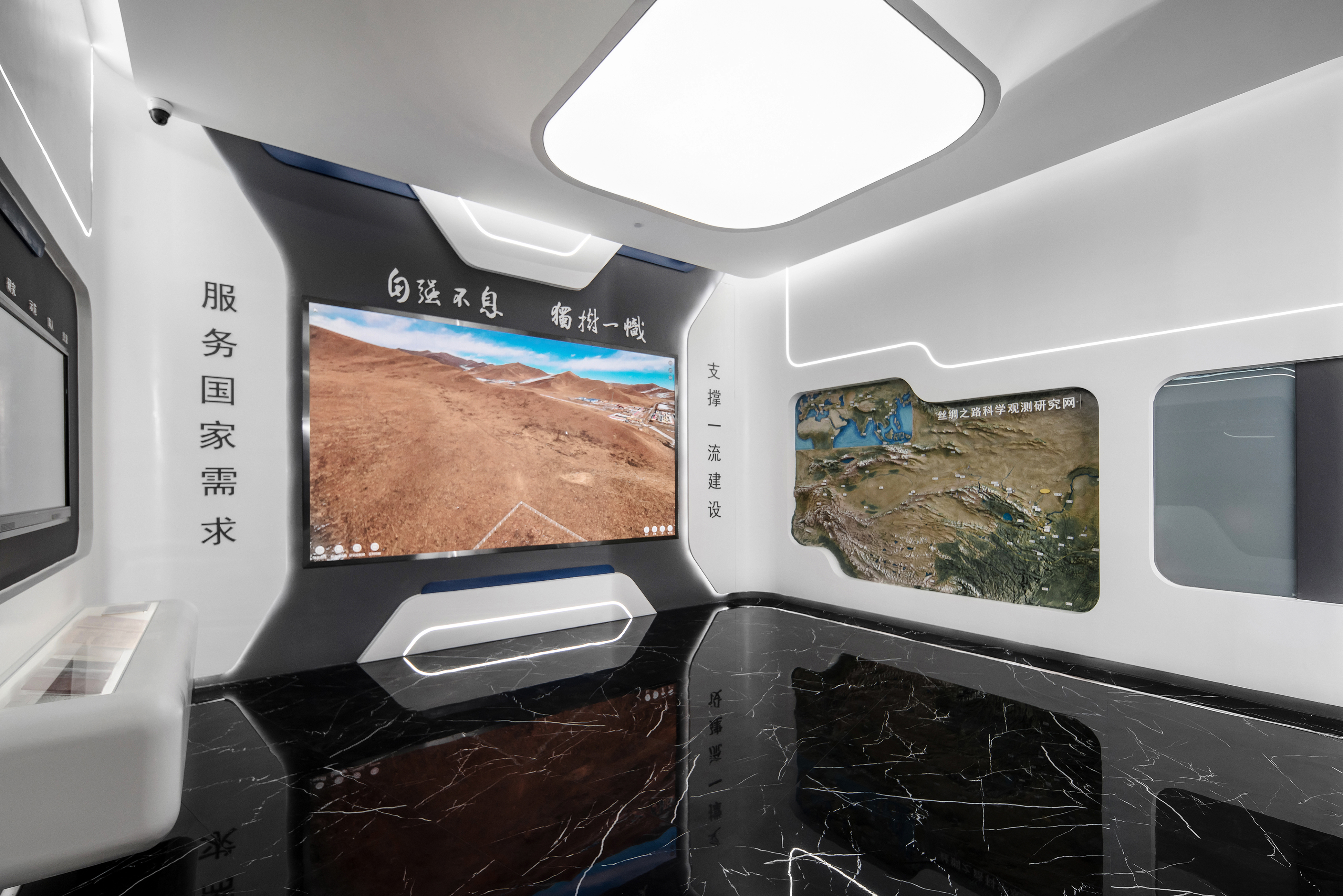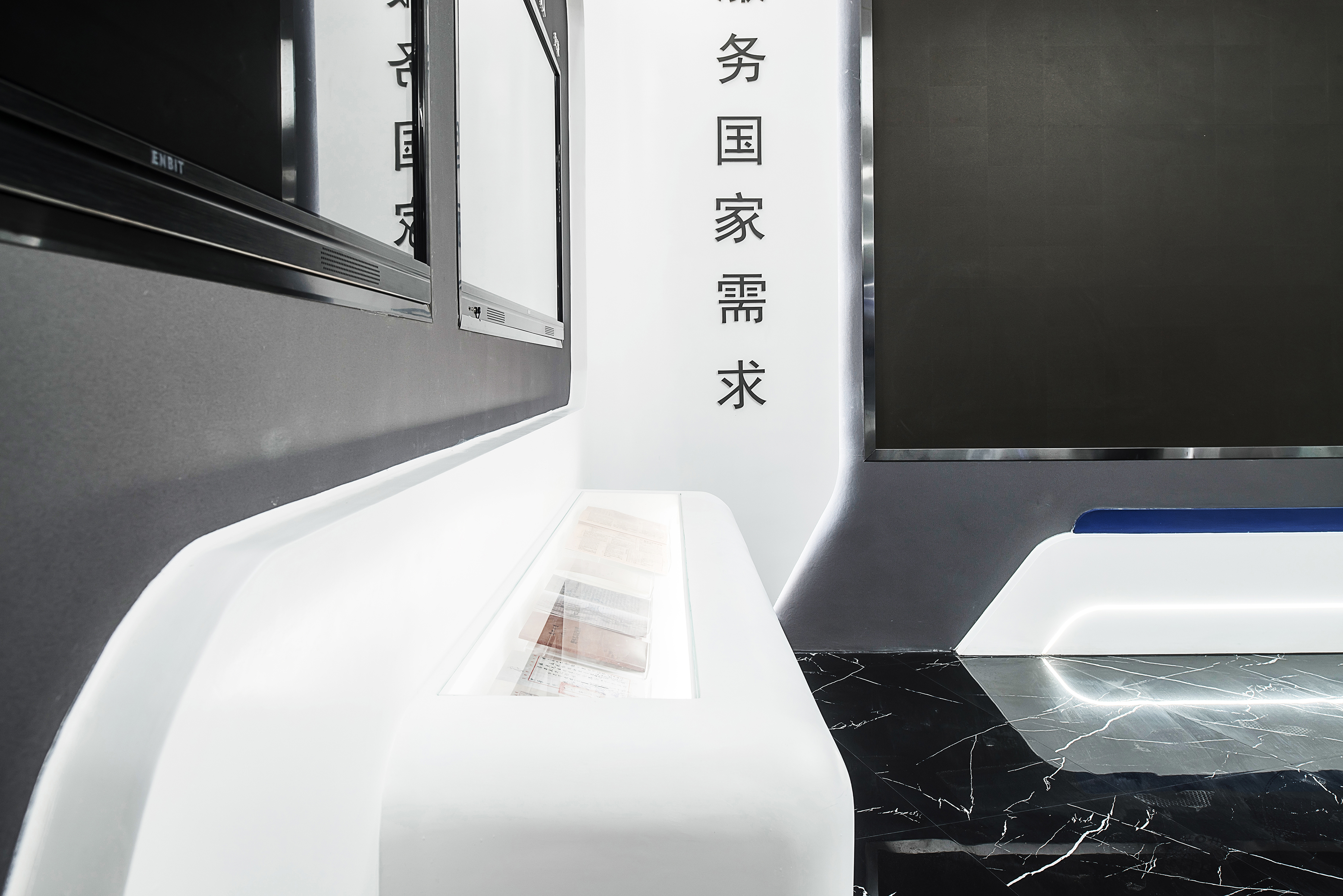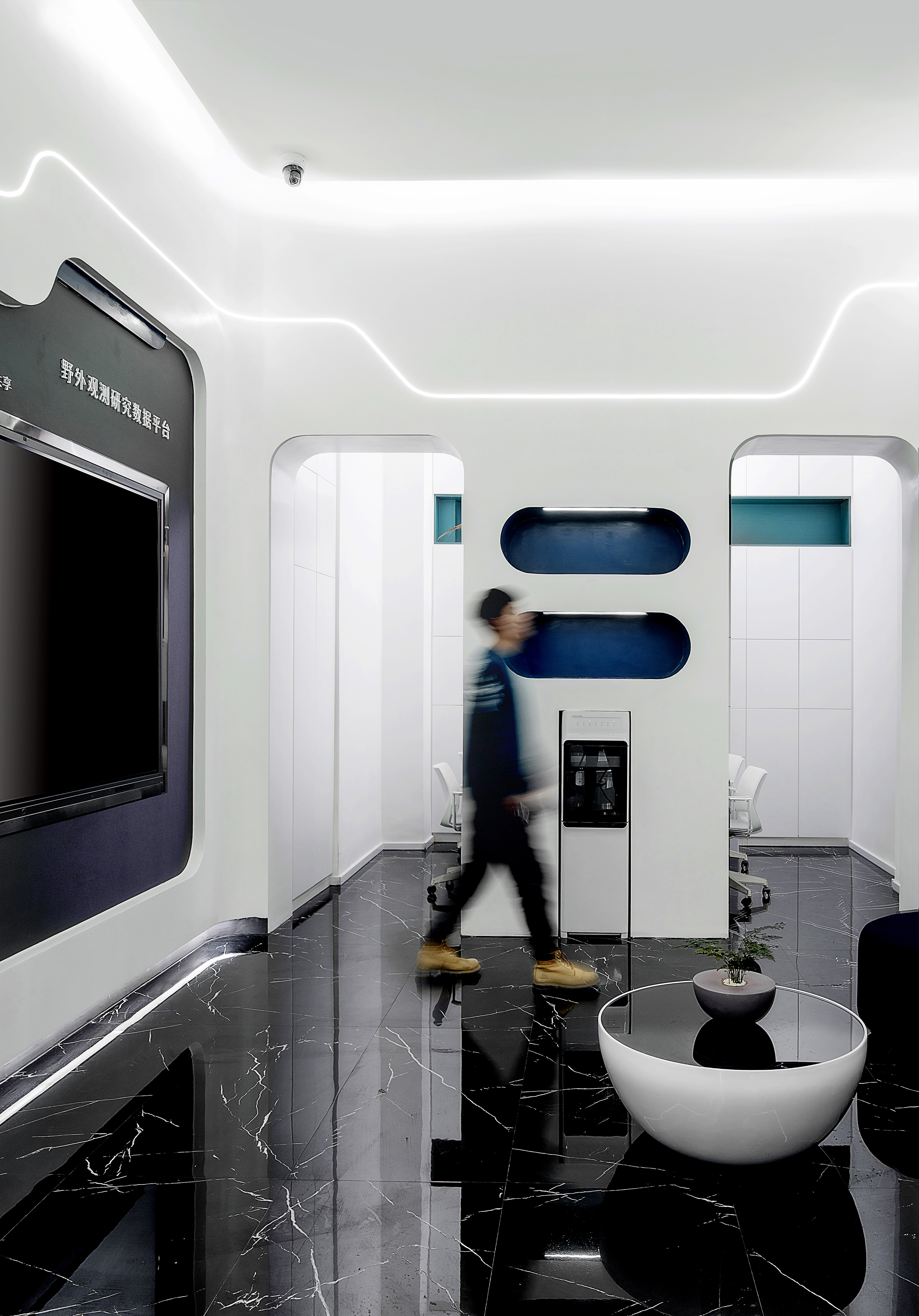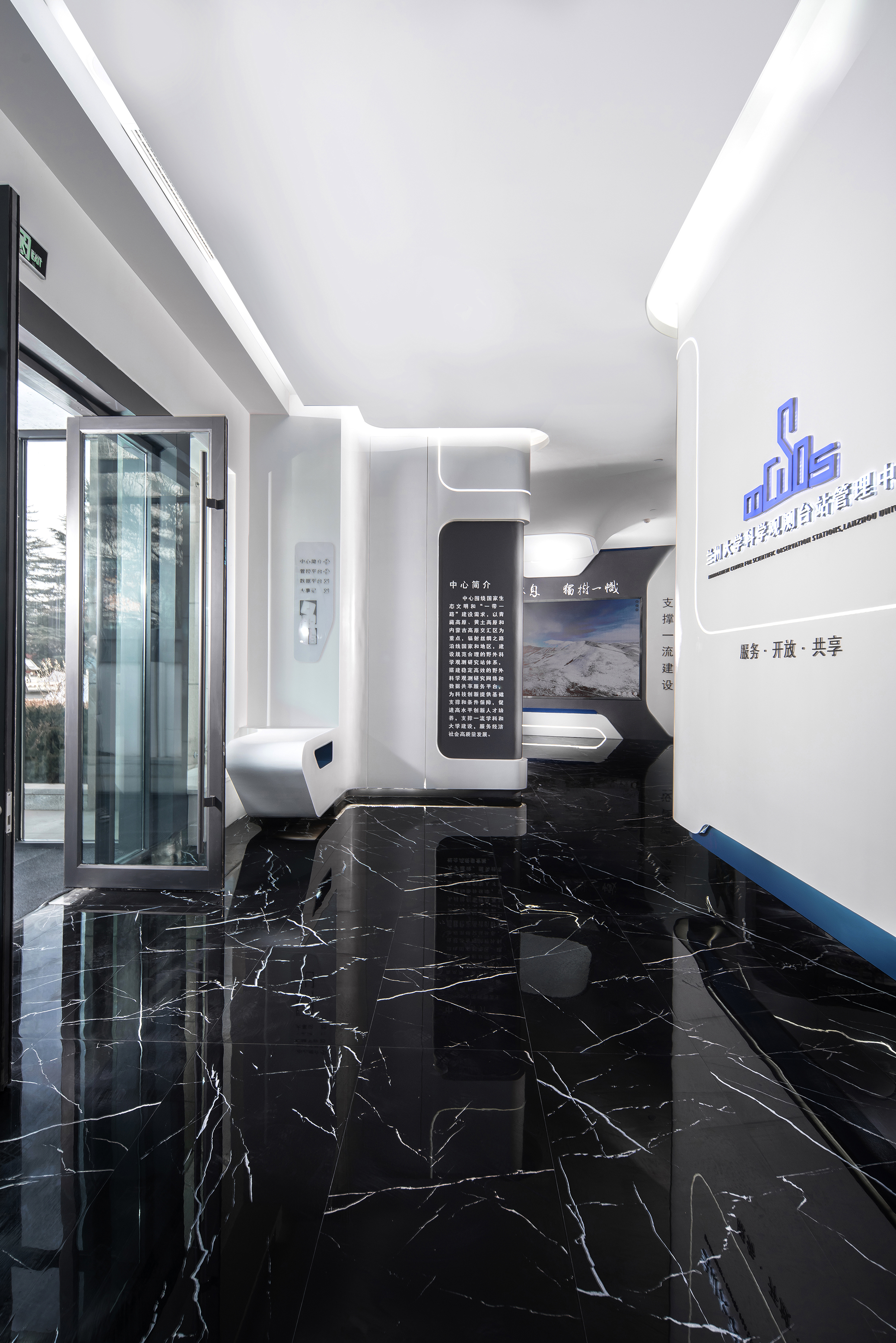 空间意境:整个展厅运用黑白灰色系,以曲线的形态使整个空间更具科技感;镜面地砖反衬出墙面倒影,视觉上拉高了空间;