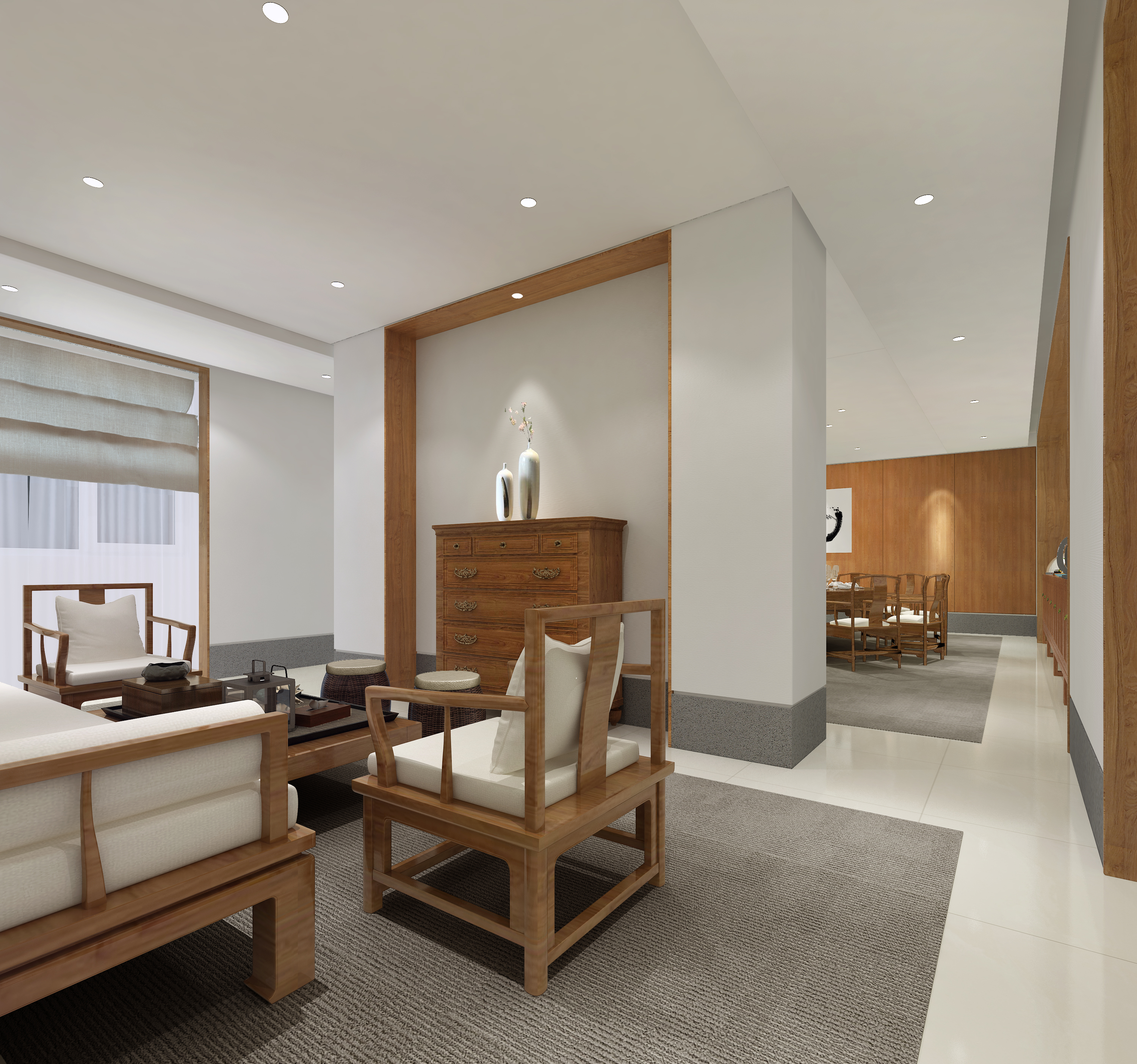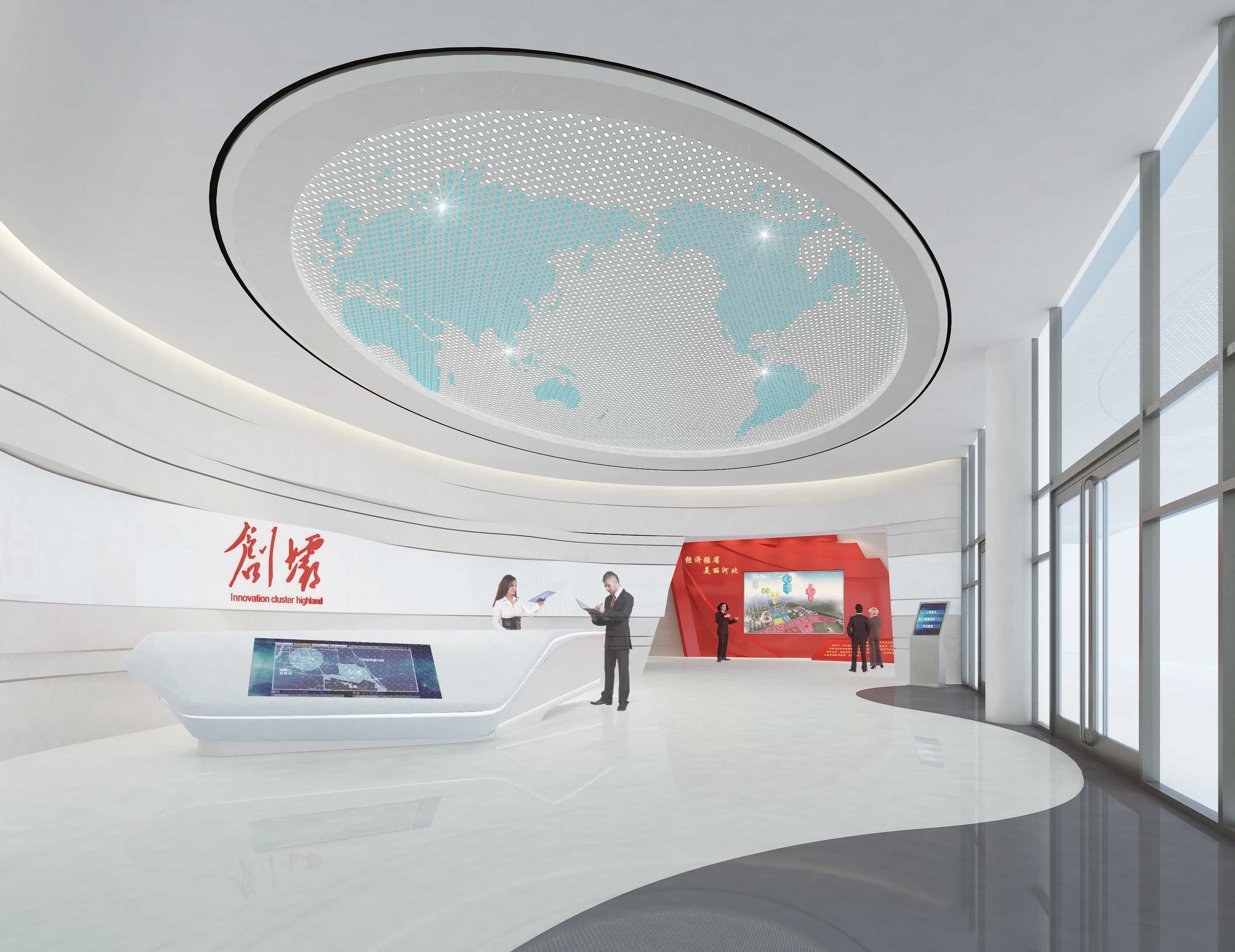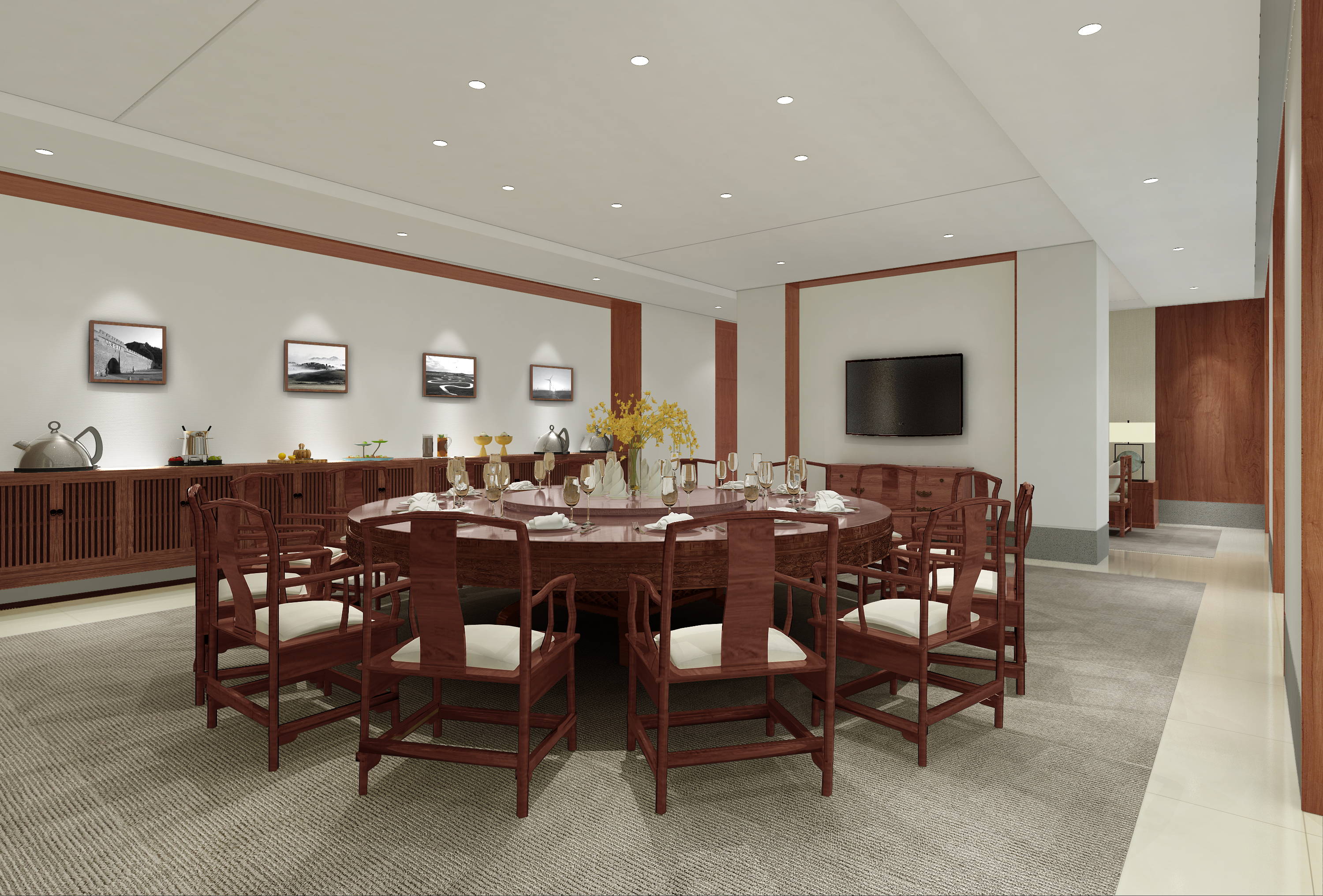 本案的设计理念旨在结合展厅的规划定位创造新科技形式感的空间概念,把空间感、立体感、科技感传递给人们。展厅分为三层,为了更好的满足功能需求,依据空间特性,每层都承载了各自的主要任务。展示区、体验区、交流休息区无一不是中国文化和现代科技的融合展现。交流休息区更是运用了大量的中国古典元素。木质家具颜色内敛,文化品位浓郁,在需要强调空间层次感,隔绝视线的地方,中式的电视背景墙把用餐聊天喝茶的地方进行隔断,让整体空间感觉更加丰富,大而不空、厚而不重,有格调又不显压抑。