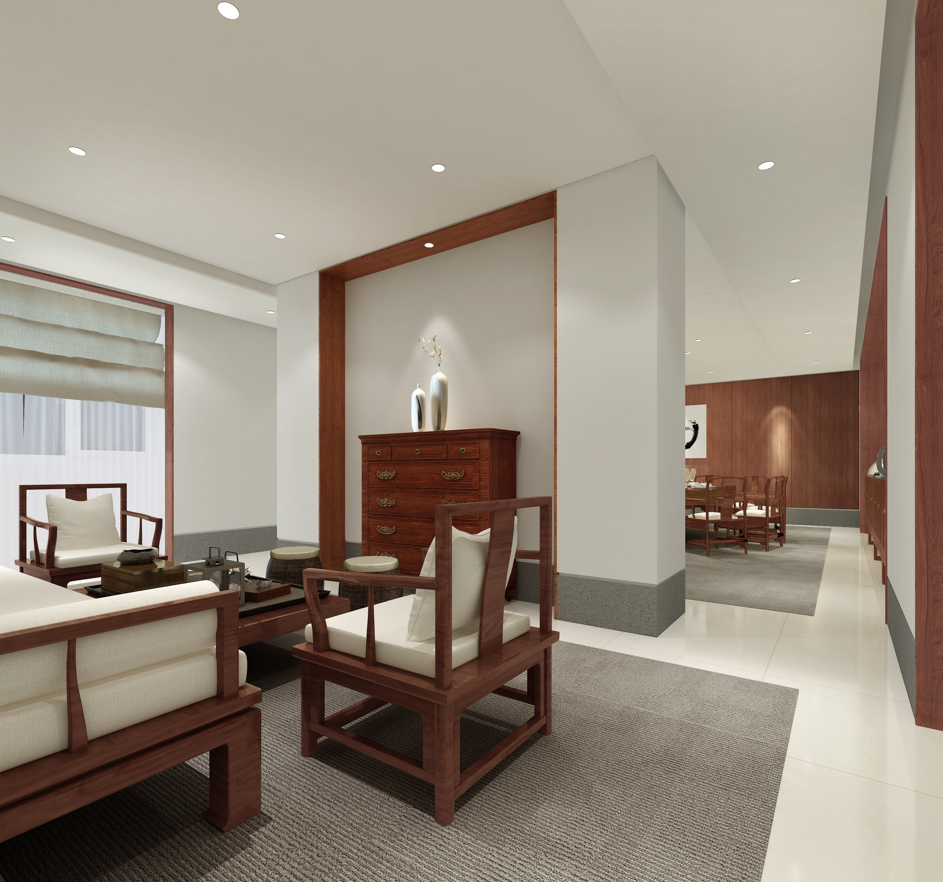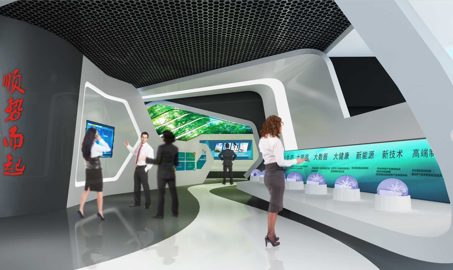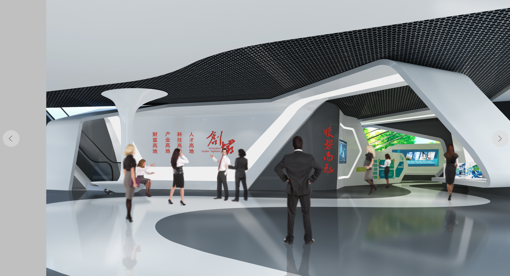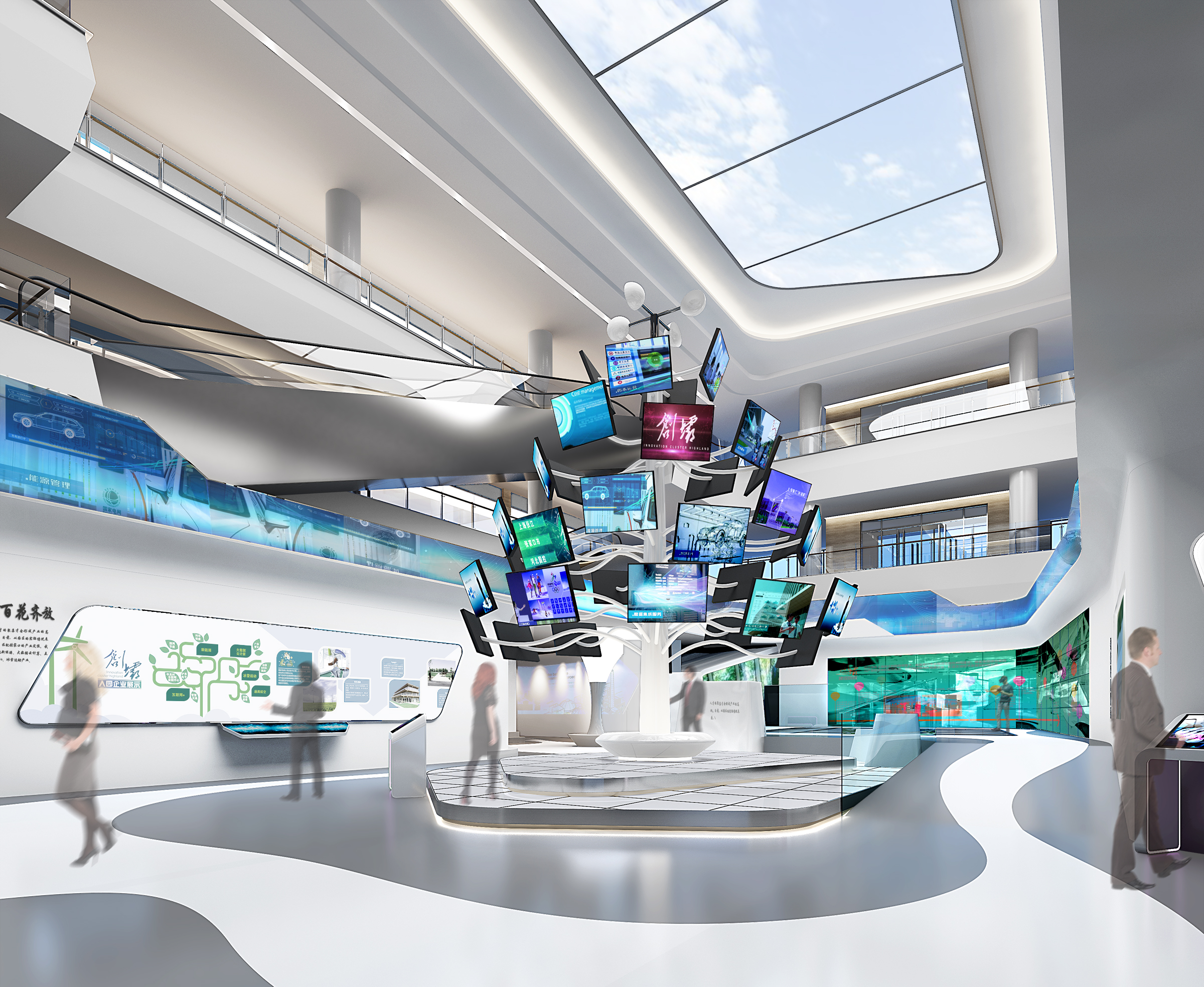 本案的设计理念旨在结合展厅的规划定位创造新科技形式感的空间概念,把空间感、立体感、科技感传递给人们。展厅分为三层,为了更好的满足功能需求,依据空间特性,每层都承载了各自的主要任务。展示区、体验区、交流休息区无一不是中国文化和现代科技的融合展现。交流休息区更是运用了大量的中国古典元素。木质家具颜色内敛,文化品位浓郁,在需要强调空间层次感,隔绝视线的地方,中式的电视背景墙把用餐聊天喝茶的地方进行隔断,让整体空间感觉更加丰富,大而不空、厚而不重,有格调又不显压抑。