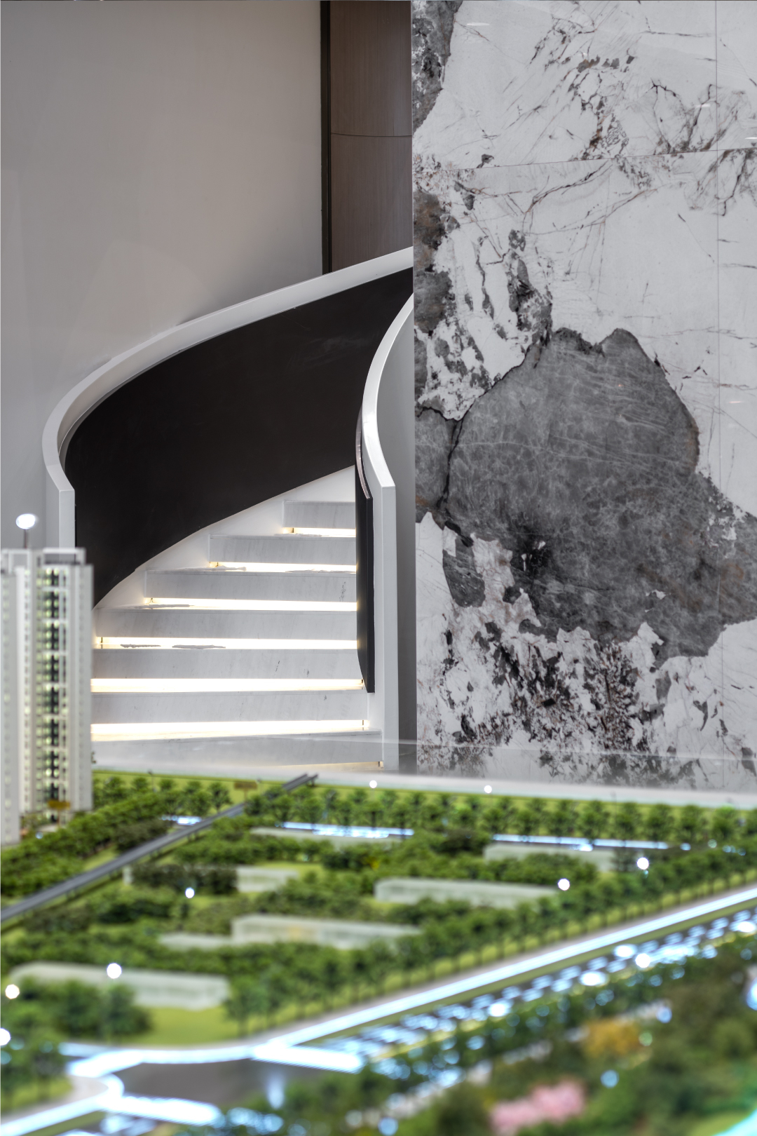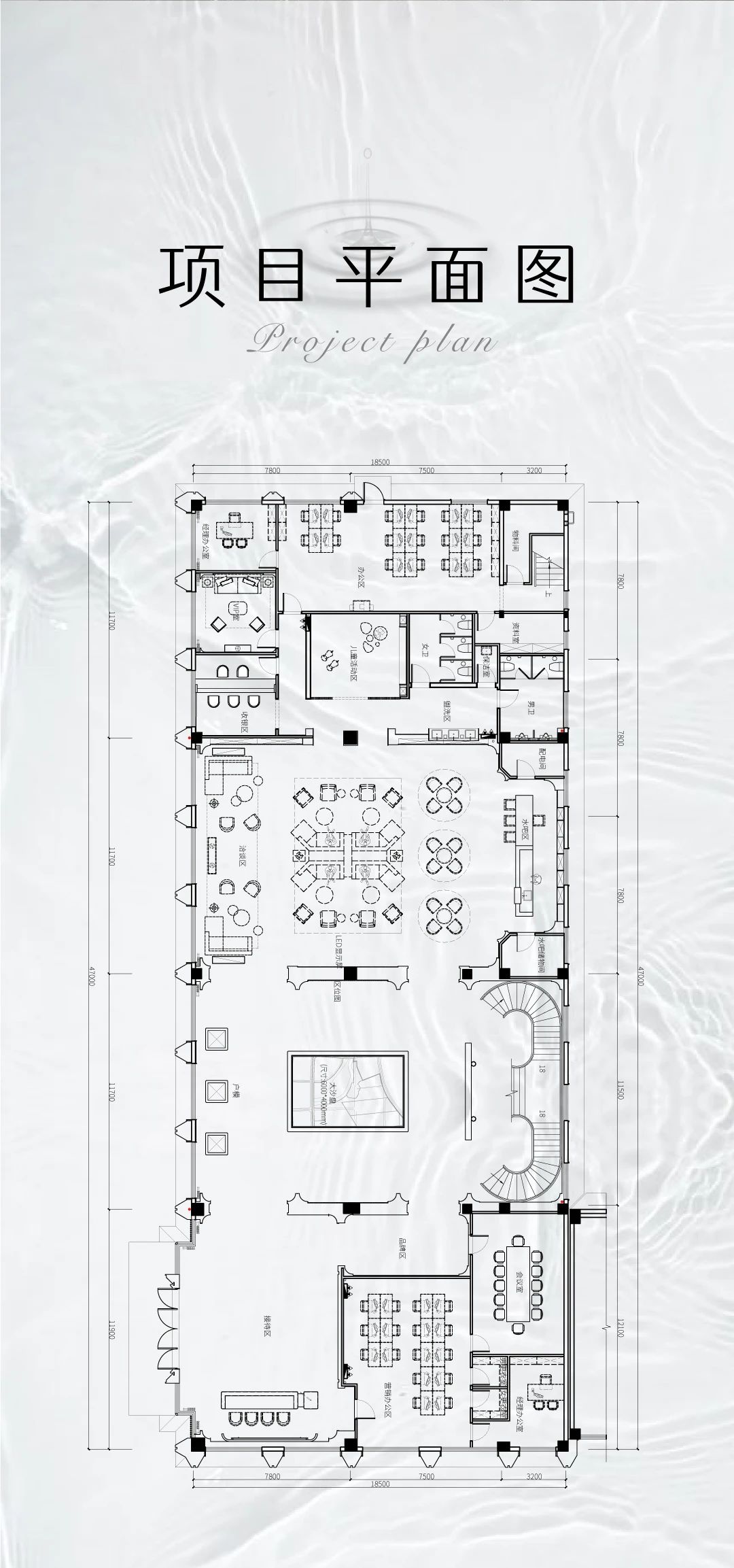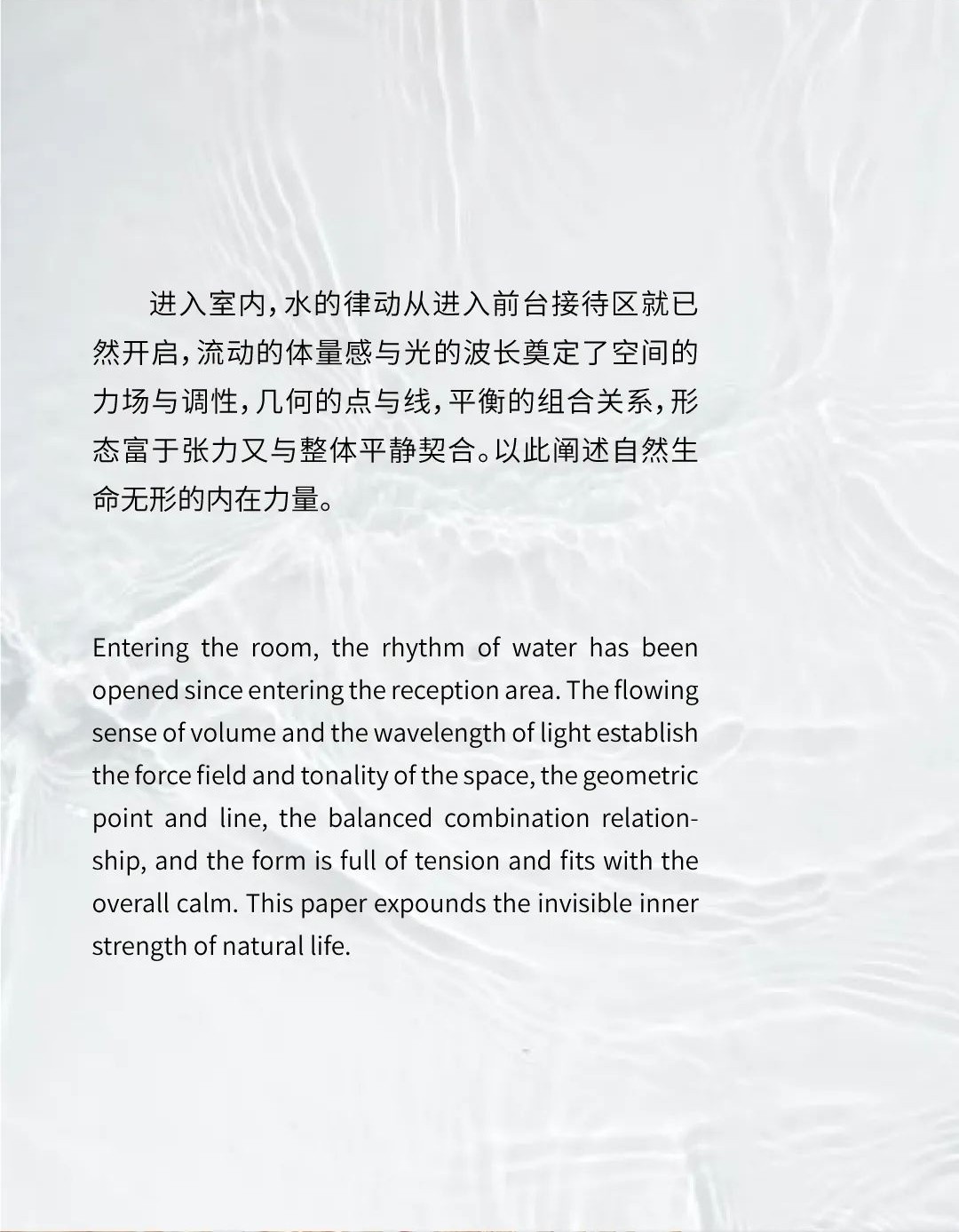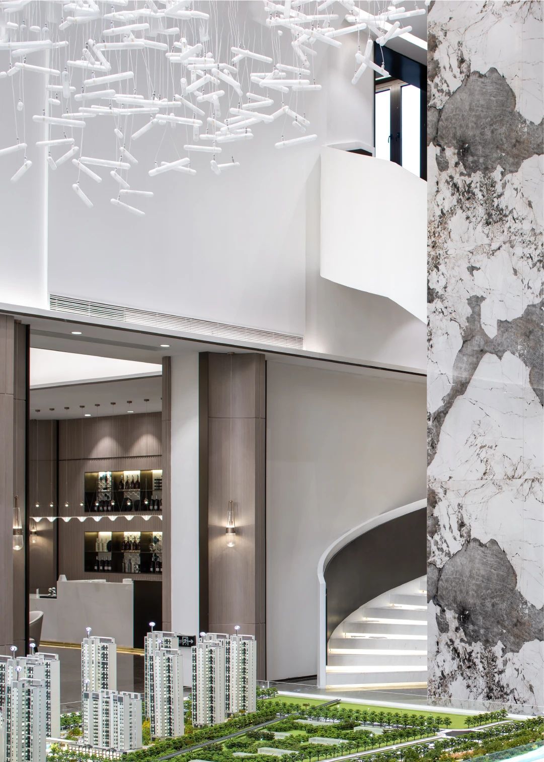 空间布局:开放性的动线布局体系,实现各功能区的穿插交汇,满足了适用人群在空间内的体验感,关于城市的理想和变迁,室内空间的有序转换,收放的递渡有法,传递着一种细水长流的浸入感与时间的流动感。