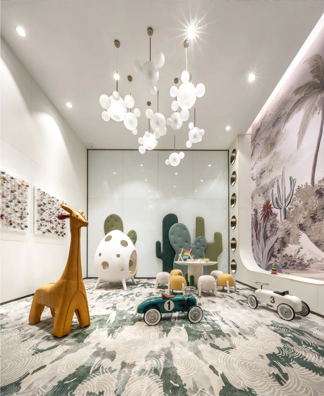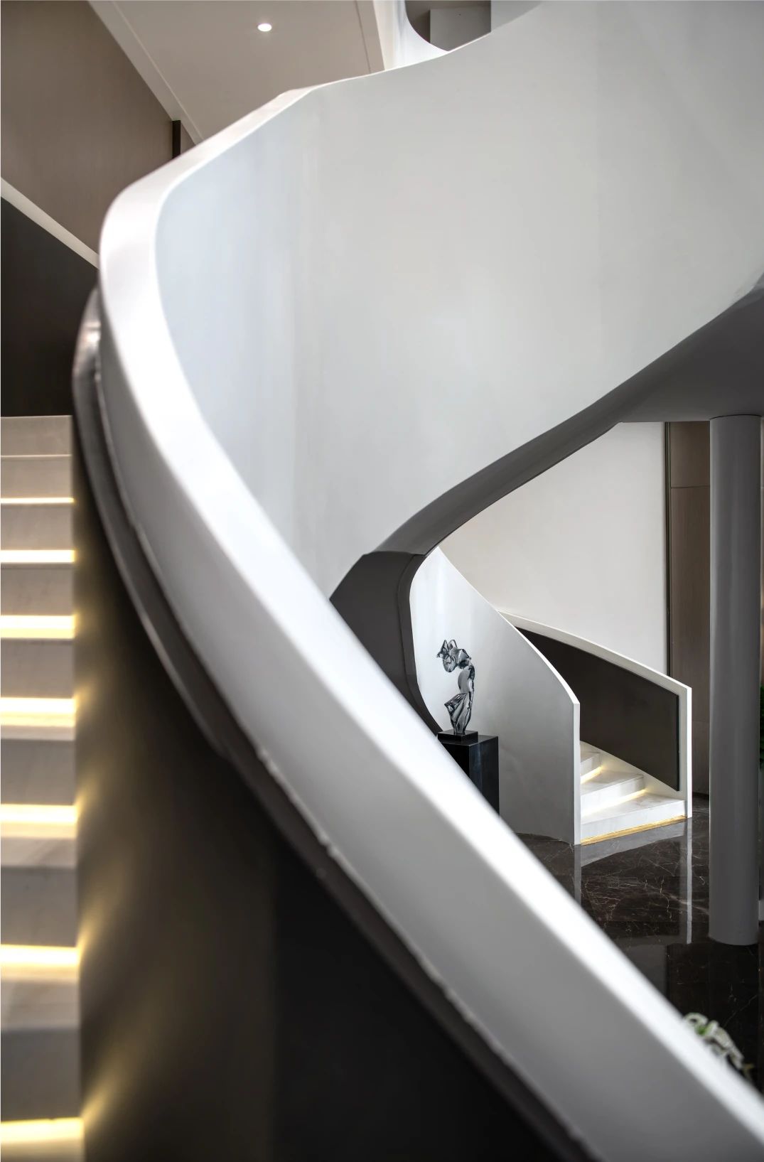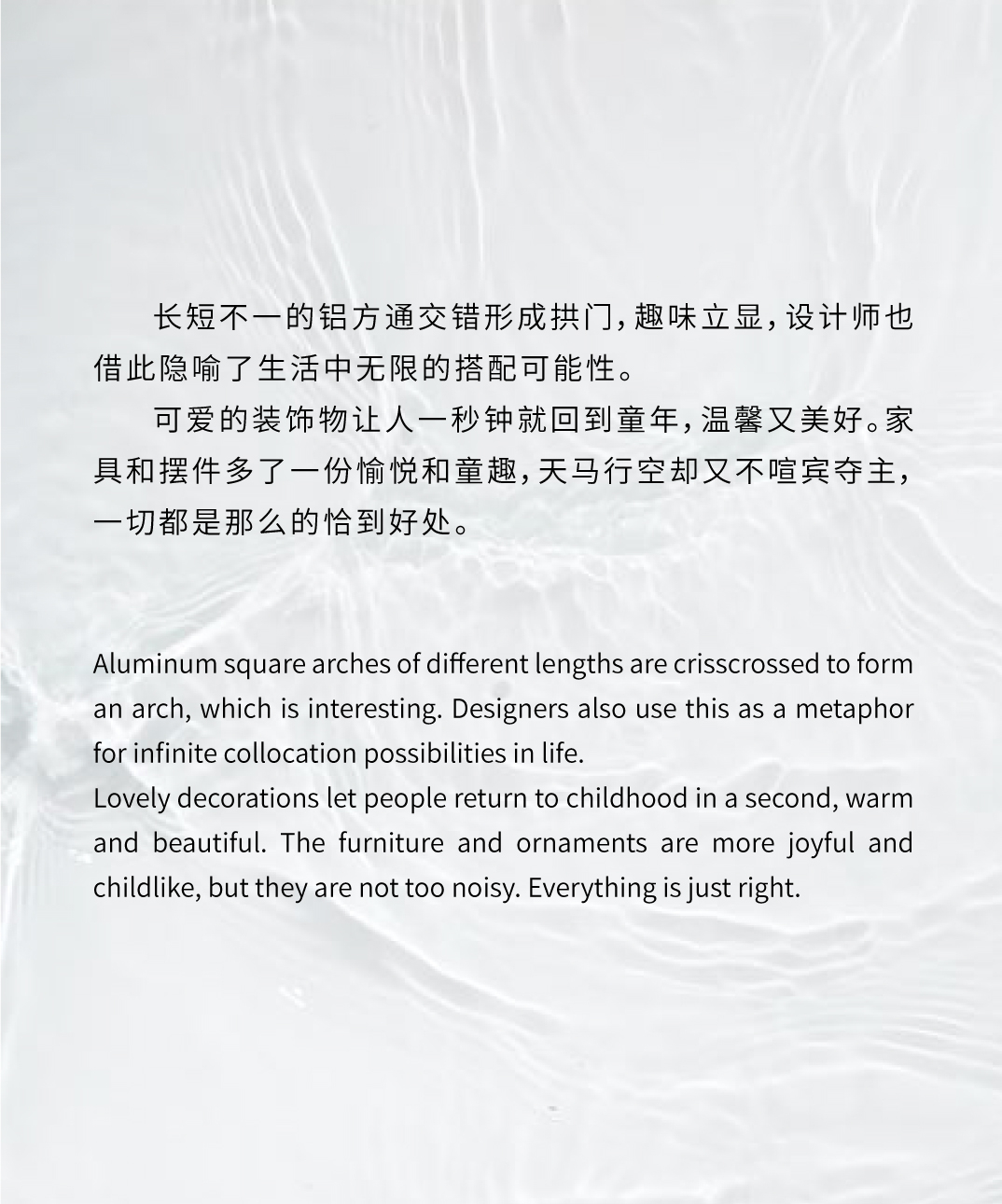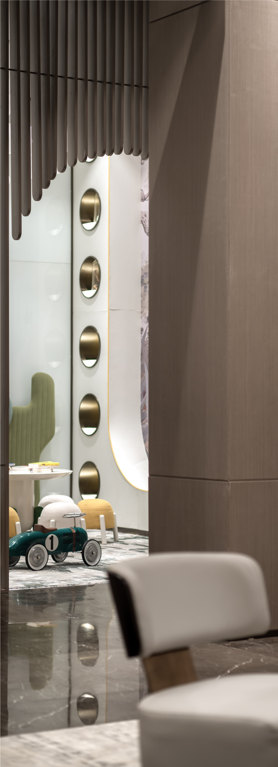 空间布局:开放性的动线布局体系,实现各功能区的穿插交汇,满足了适用人群在空间内的体验感,关于城市的理想和变迁,室内空间的有序转换,收放的递渡有法,传递着一种细水长流的浸入感与时间的流动感。