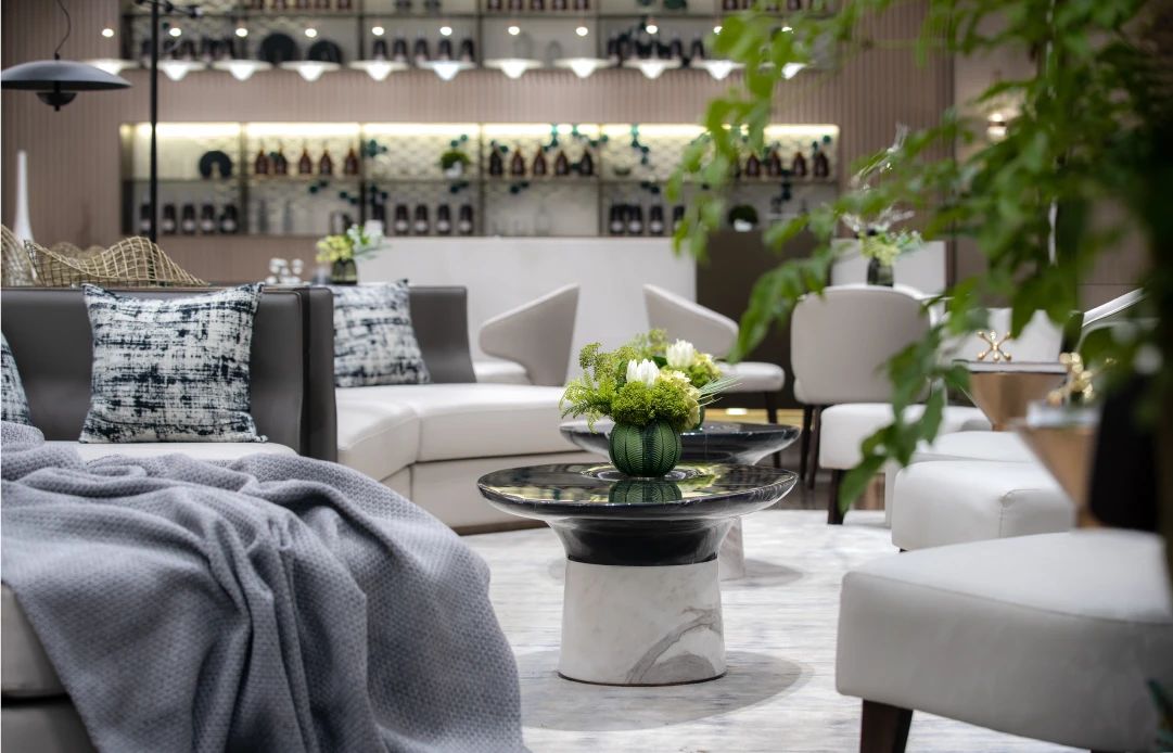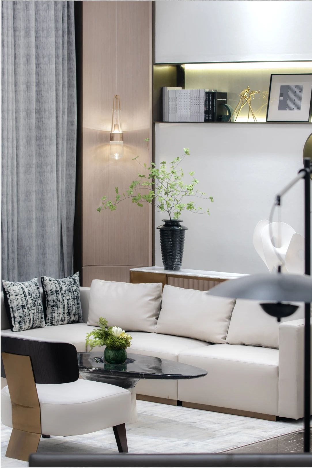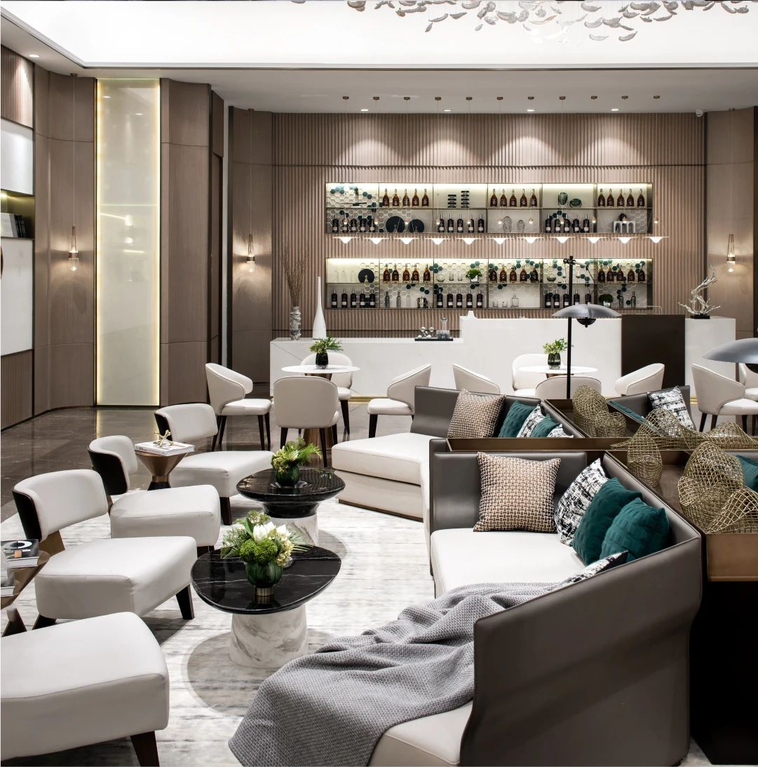 设计选材:雅致的棕色木质墙饰面搭配大面积大理石地面,塑造出空间奢雅的基调。木材与石材的互相交织,深与浅的彼此交融,借助精致的装饰画与落地灯丰富空间的形态。空间一面敞开向外,畅通内外部的联结与置换,明亮可见。