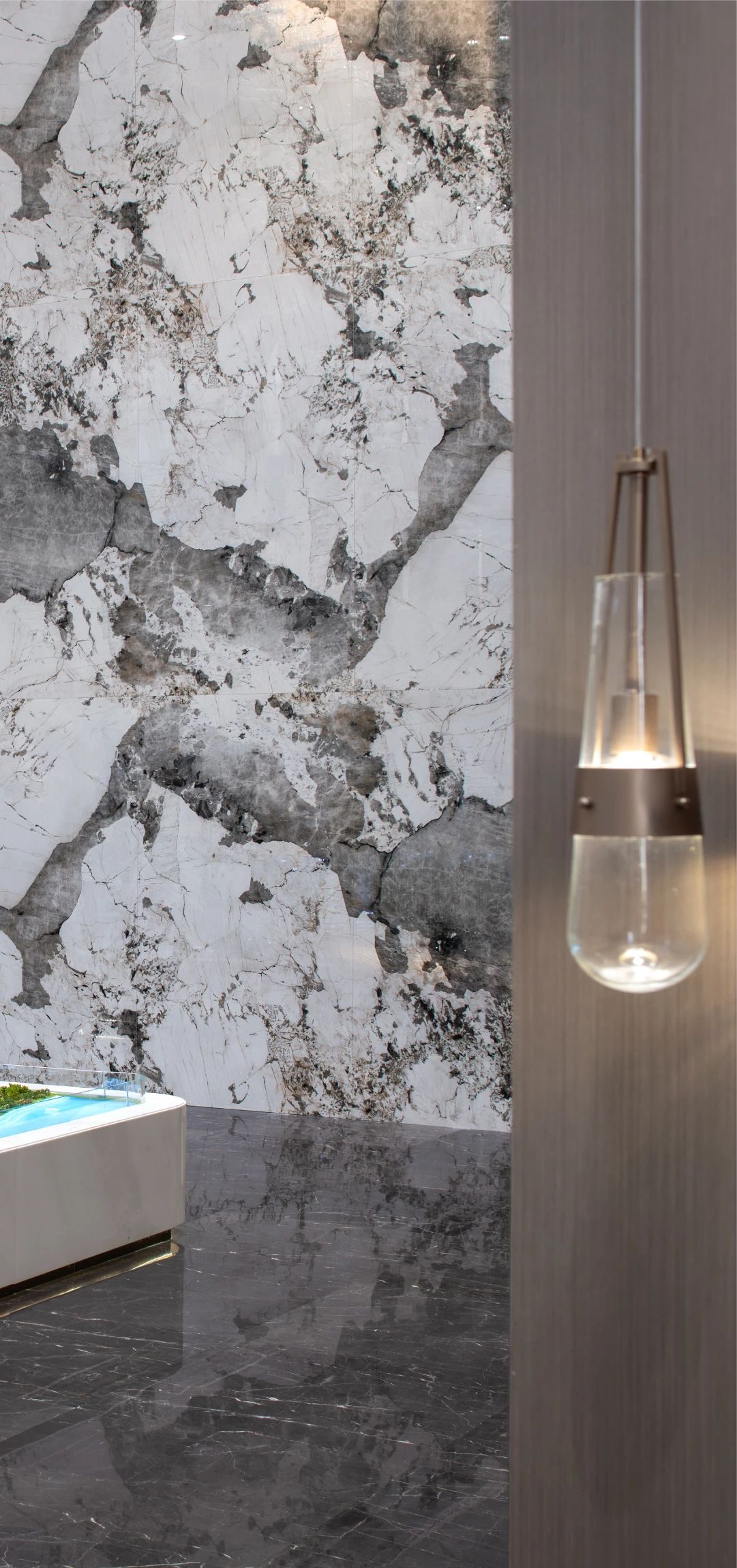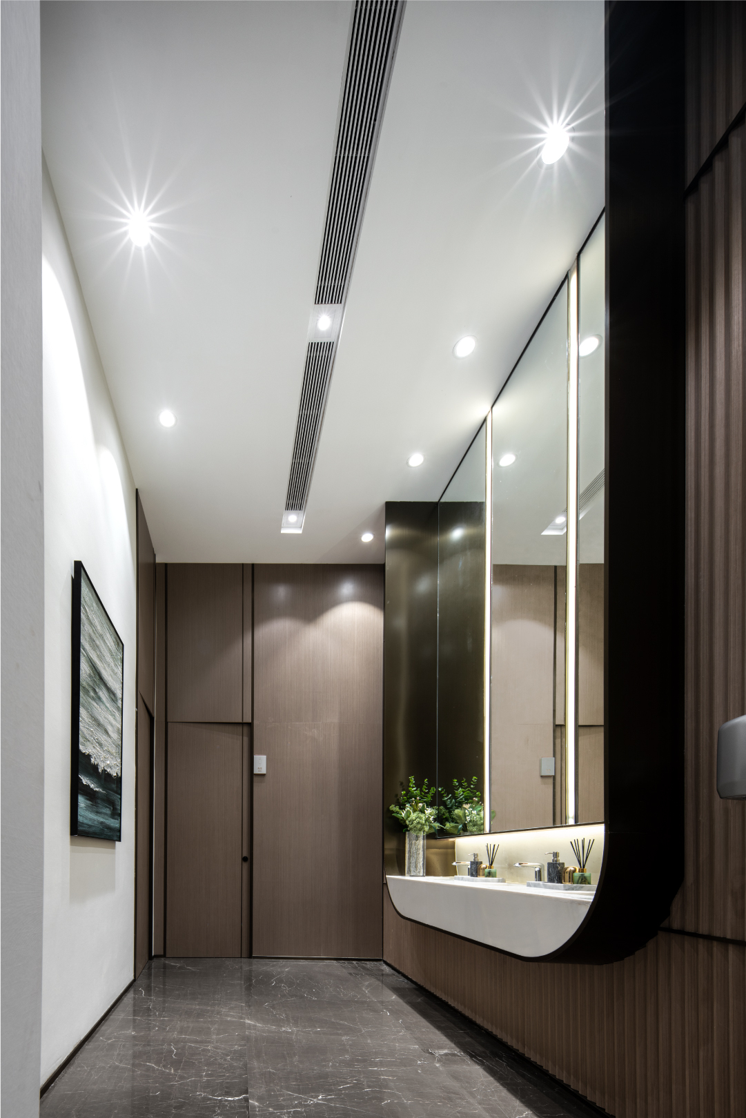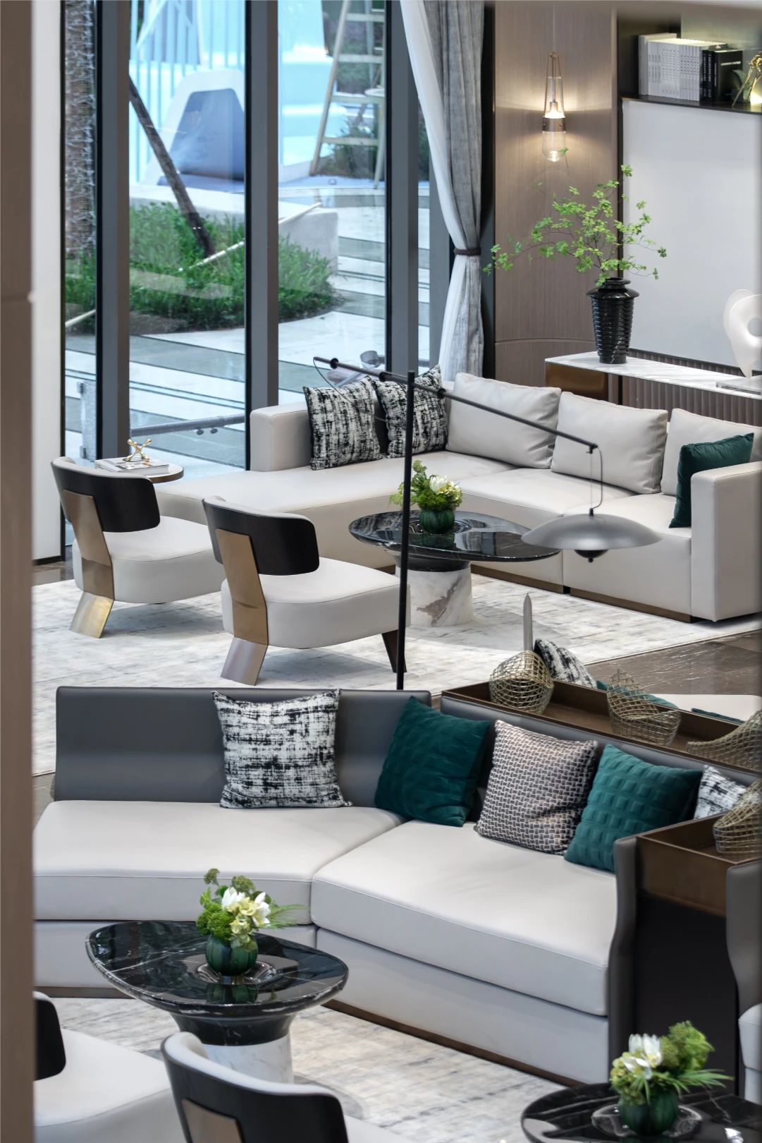 设计选材:雅致的棕色木质墙饰面搭配大面积大理石地面,塑造出空间奢雅的基调。木材与石材的互相交织,深与浅的彼此交融,借助精致的装饰画与落地灯丰富空间的形态。空间一面敞开向外,畅通内外部的联结与置换,明亮可见。