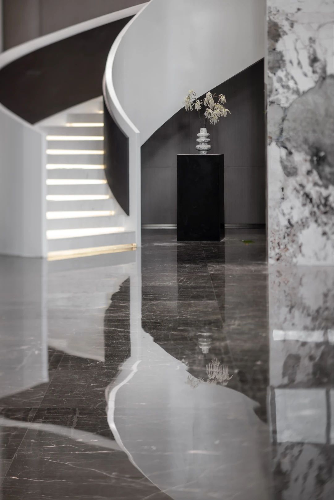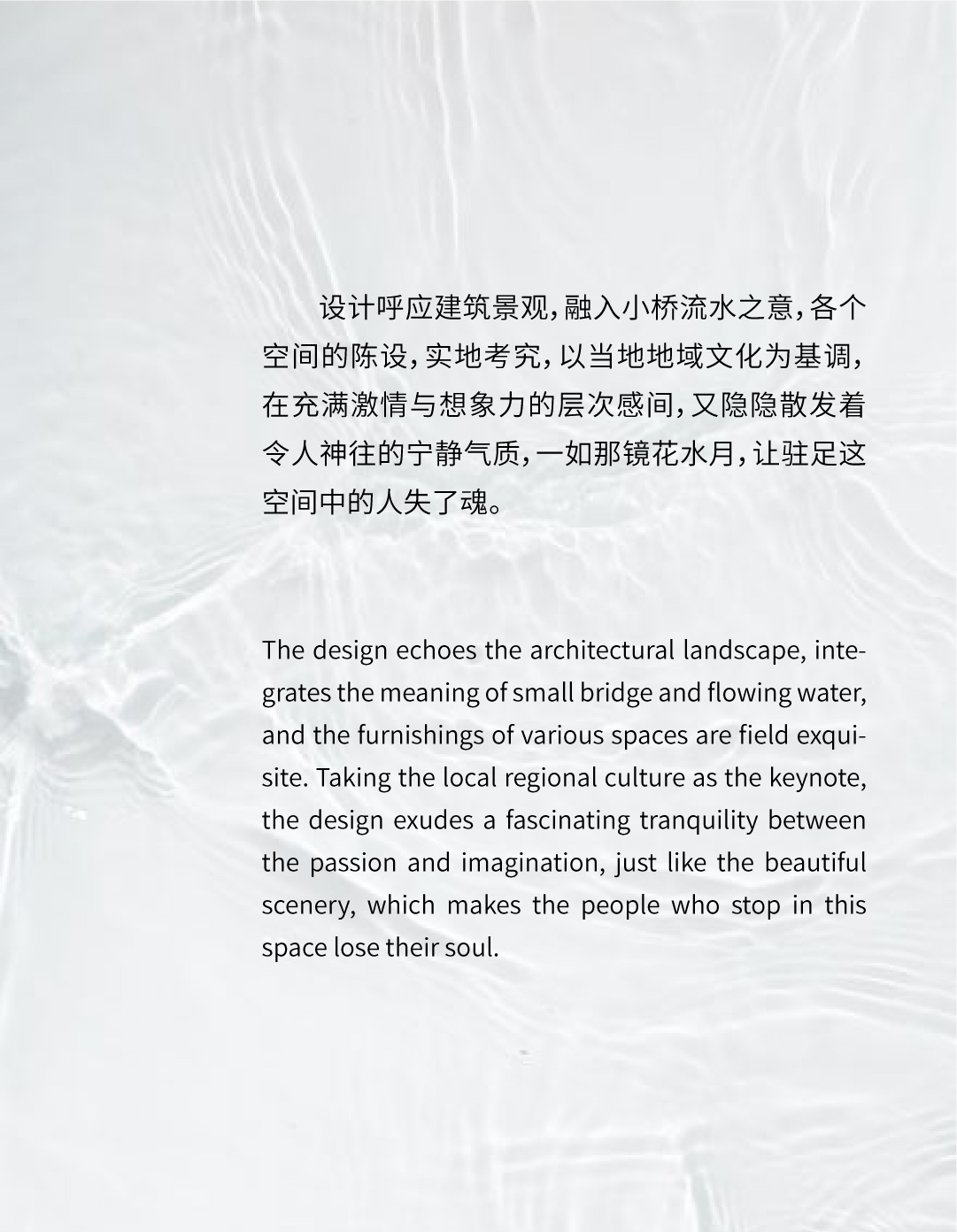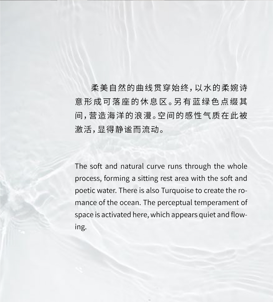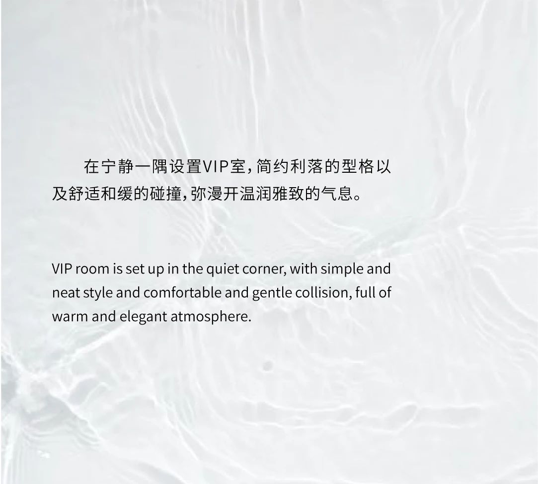 空间意境:简洁的立面与清冷的空间气质交映在温润的木饰面,运用弧线打造行云流水的空间造型,在光影间折射成一片自然之色。以小桥流水之意,流水、青苔、石阶各个空间的陈设,实地考究,以当地地域文化为基调一如那镜花水月,让驻足这空间中的人失了魂。运用光、影、形、色,形成视觉感观空间。