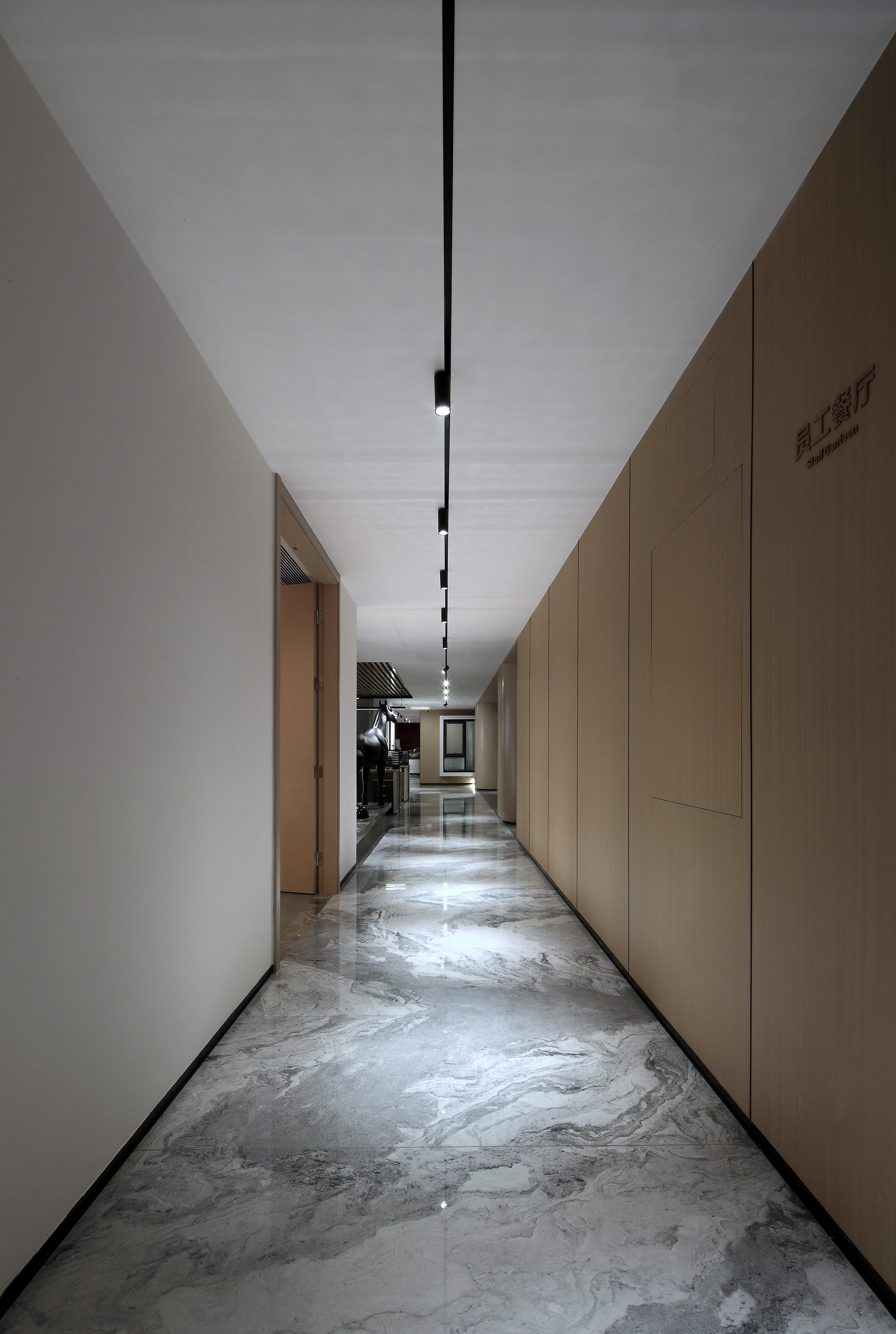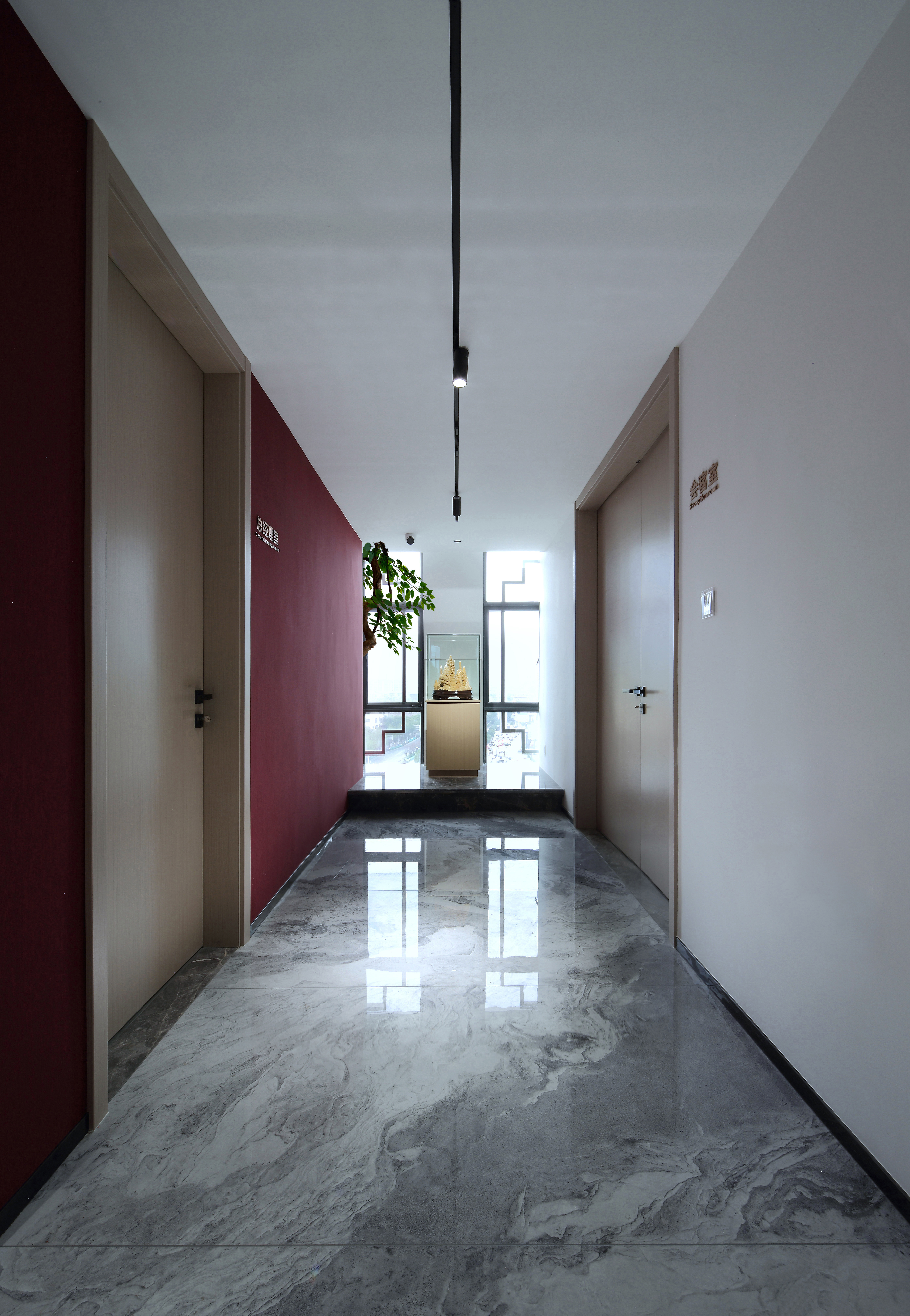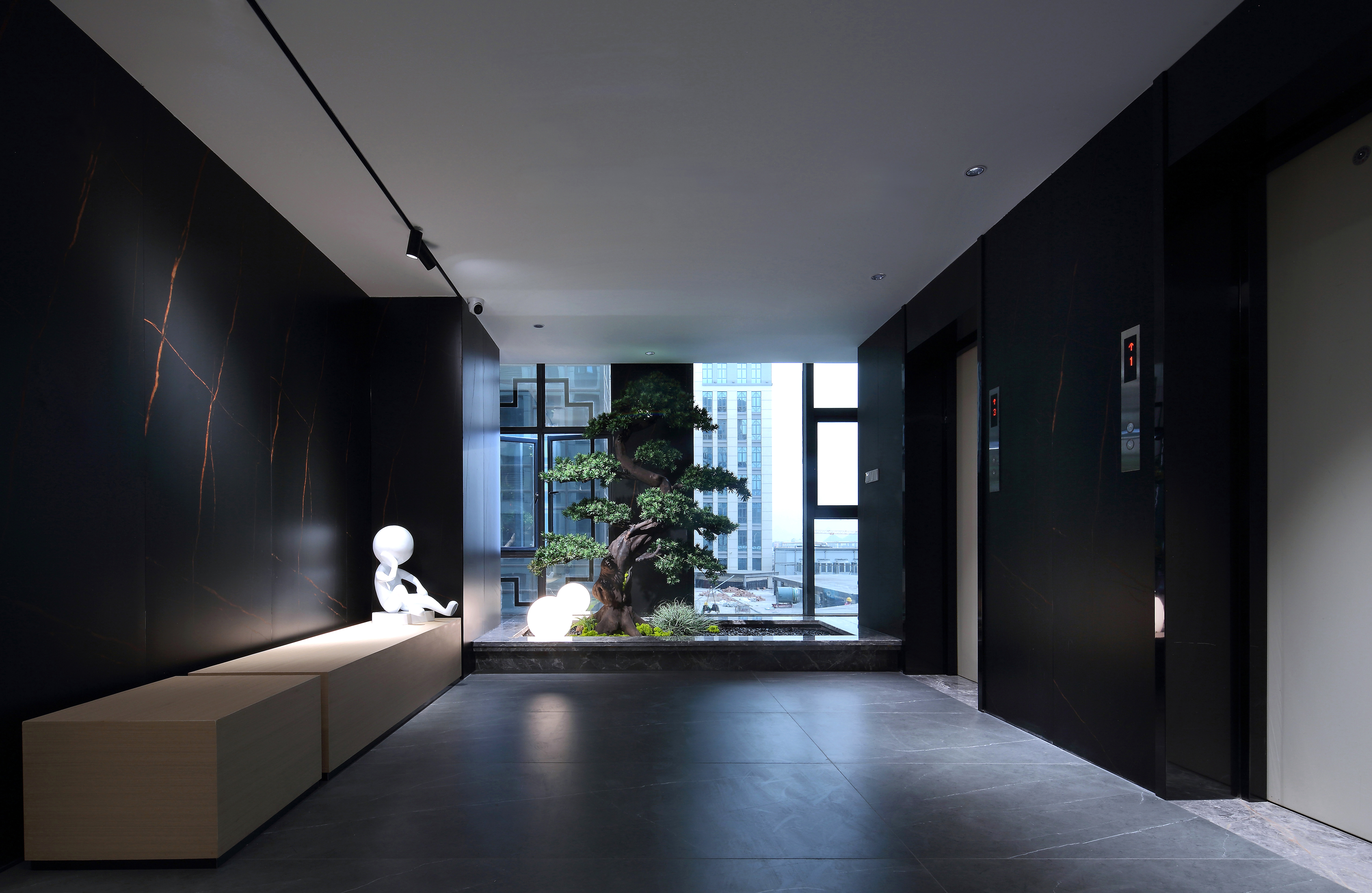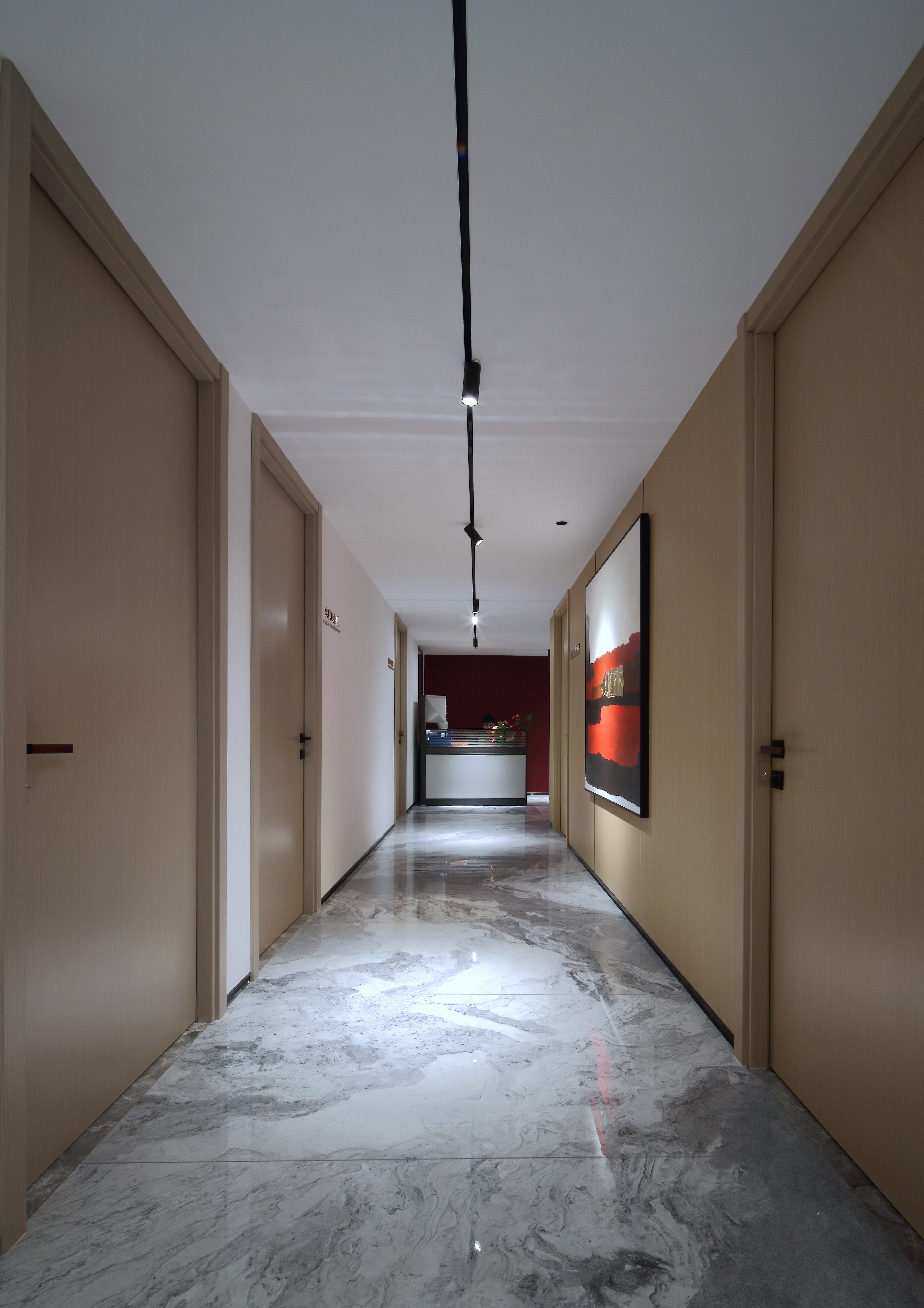 项目定位:设计理念源于陶渊明的《桃花源记》,色调上先抑后扬,豁然开朗。电梯厅墙地面800MM*2400MM的大块面深色岩板墙面,过渡色浅色木饰面墙、顶造型延伸至等候区、走道,庄重而时尚,空间简练而富有内涵。隔而不断的造型是为了保证空间的独立性基础上,增加空间穿透感和映入室外光影,最大限度的减少灯光照明,低碳环保,同时形成一个既相互独立而又相互连贯的空间系统。