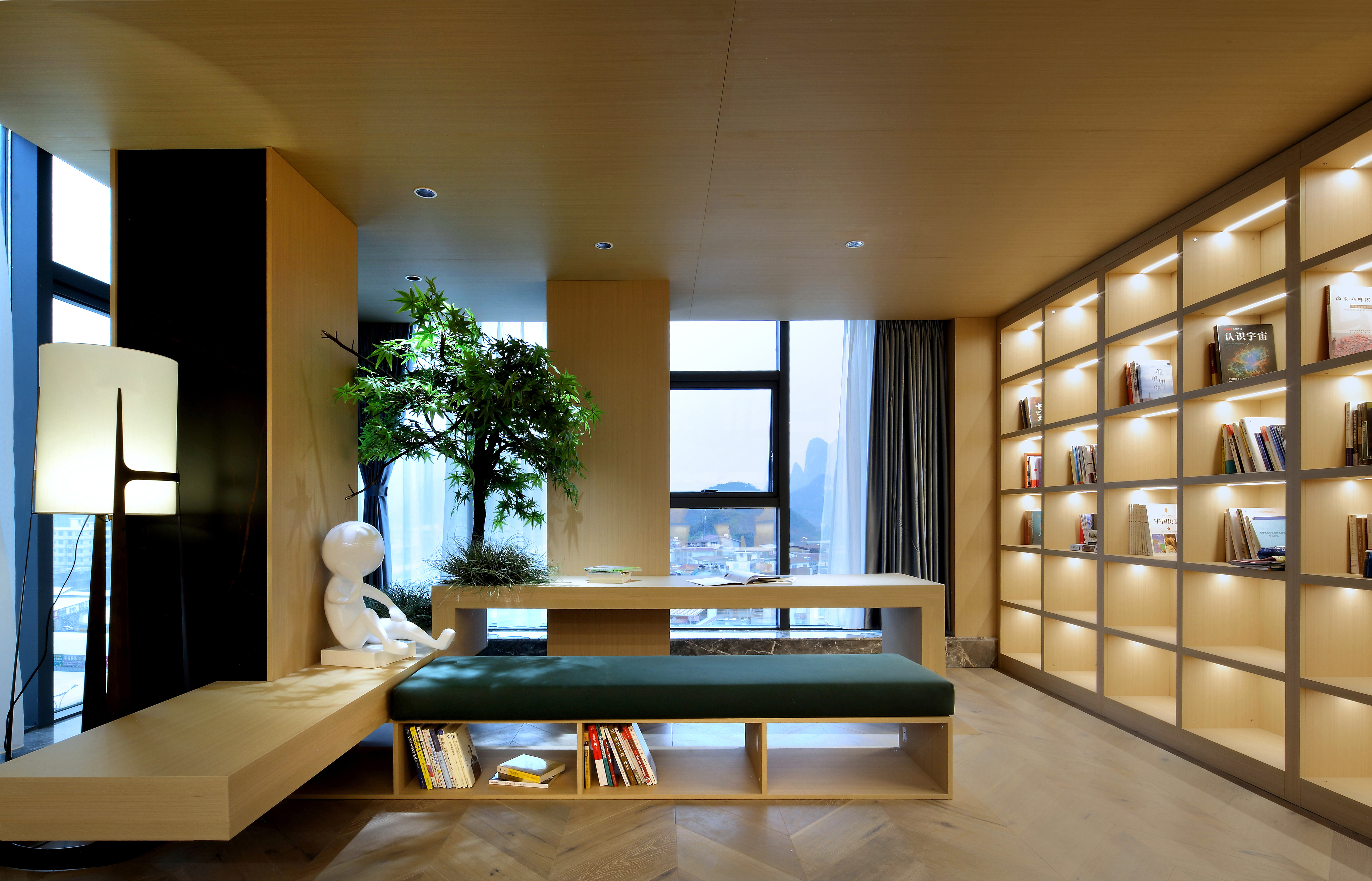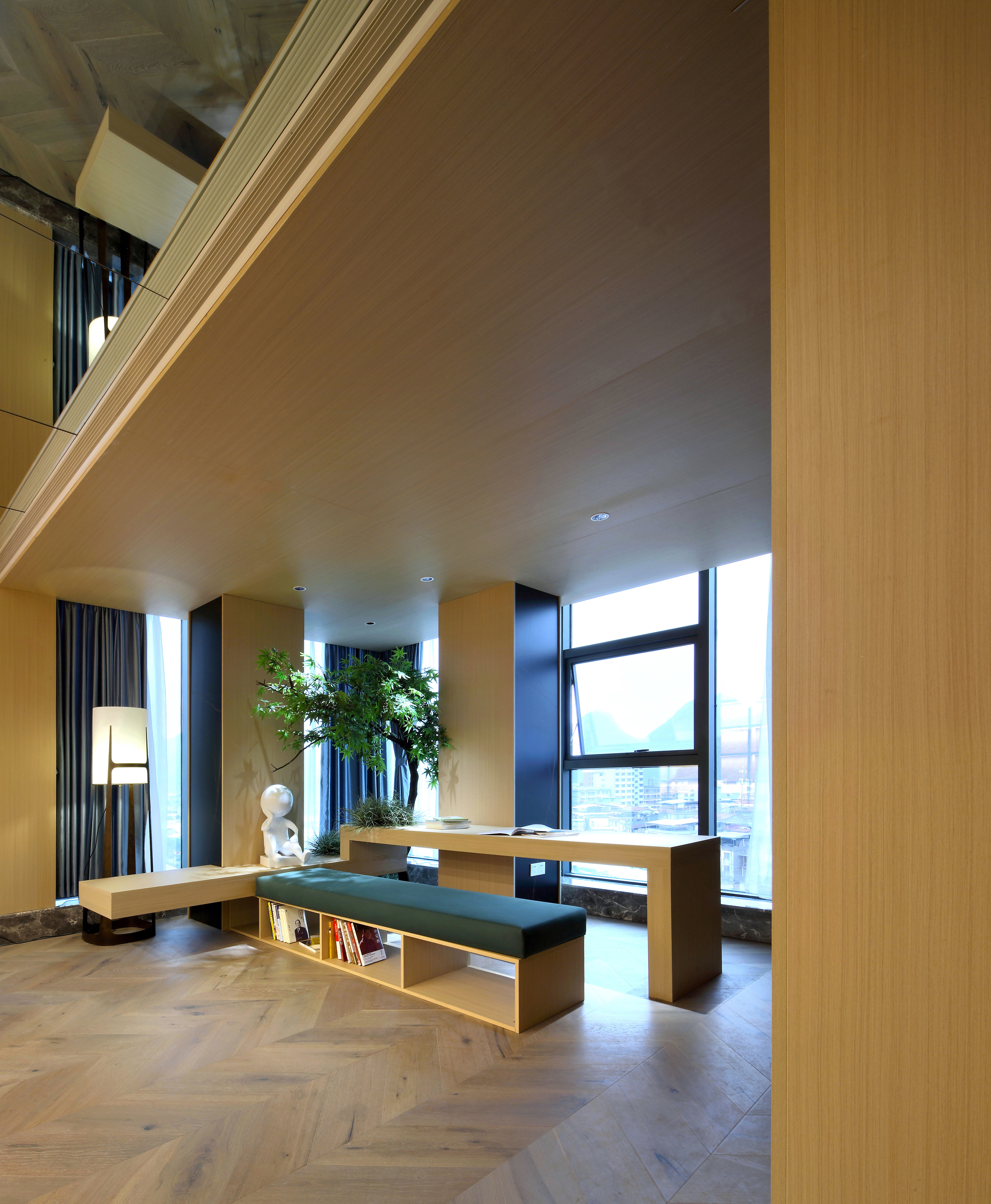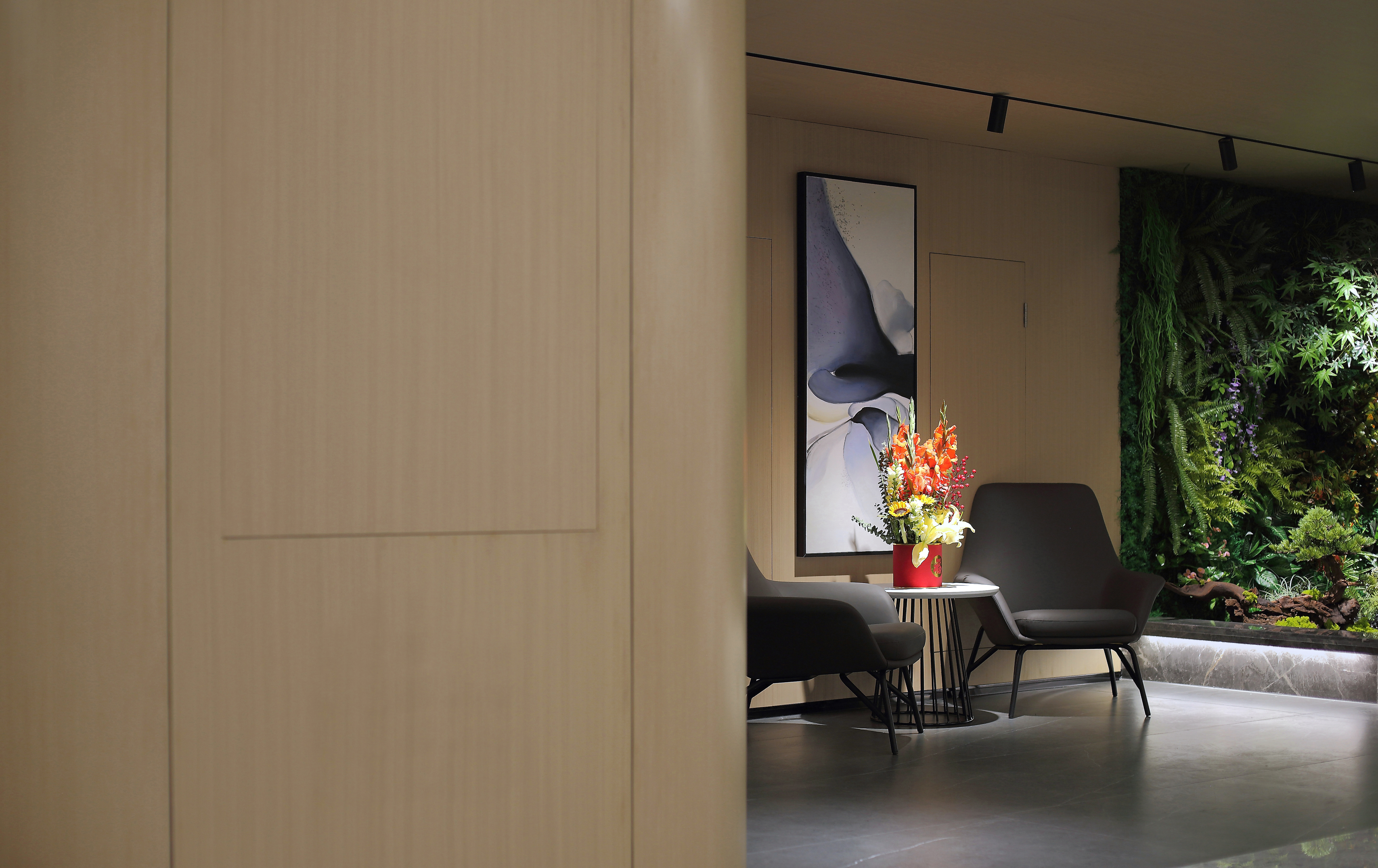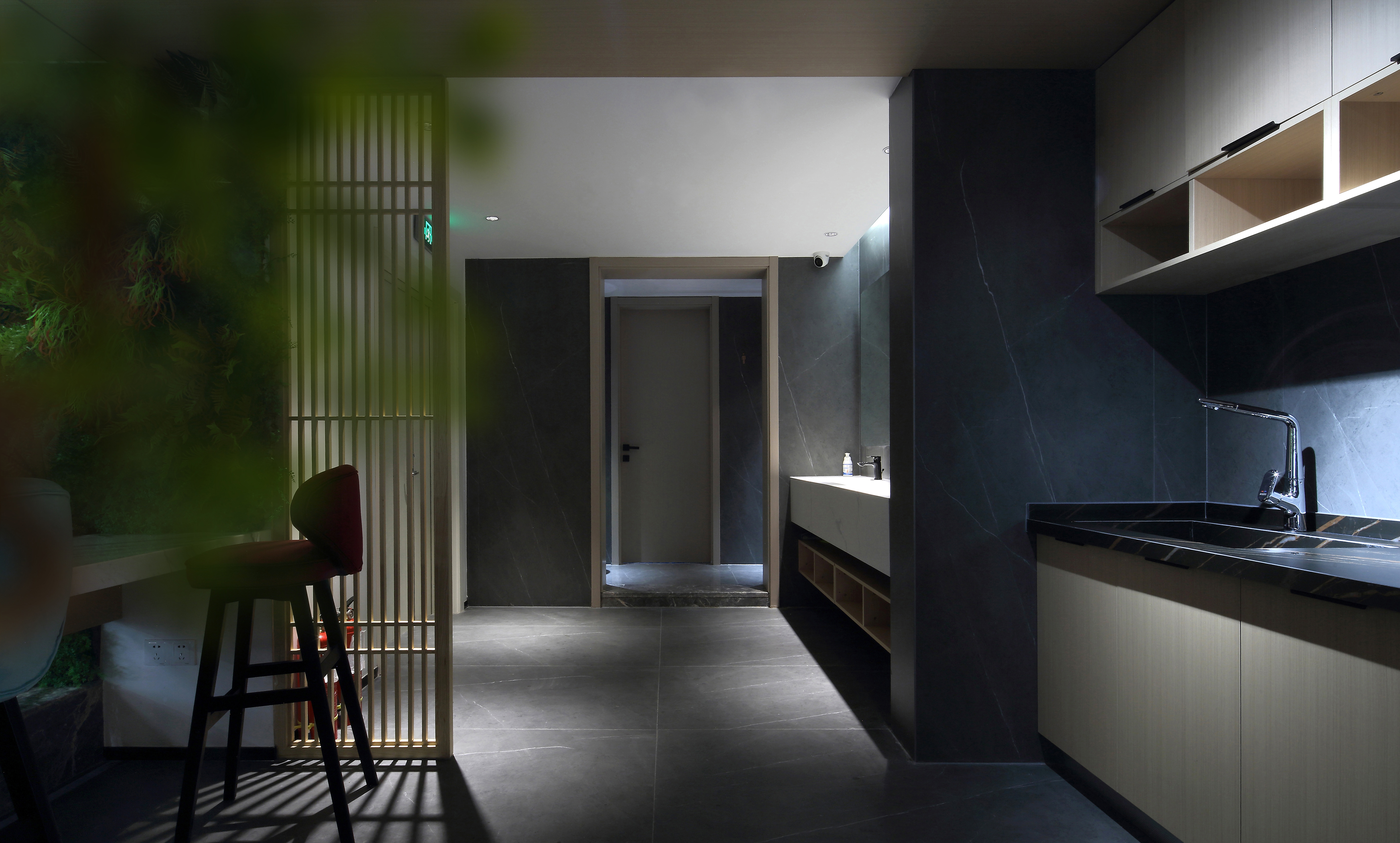 项目定位:设计理念源于陶渊明的《桃花源记》,色调上先抑后扬,豁然开朗。电梯厅墙地面800MM*2400MM的大块面深色岩板墙面,过渡色浅色木饰面墙、顶造型延伸至等候区、走道,庄重而时尚,空间简练而富有内涵。隔而不断的造型是为了保证空间的独立性基础上,增加空间穿透感和映入室外光影,最大限度的减少灯光照明,低碳环保,同时形成一个既相互独立而又相互连贯的空间系统。