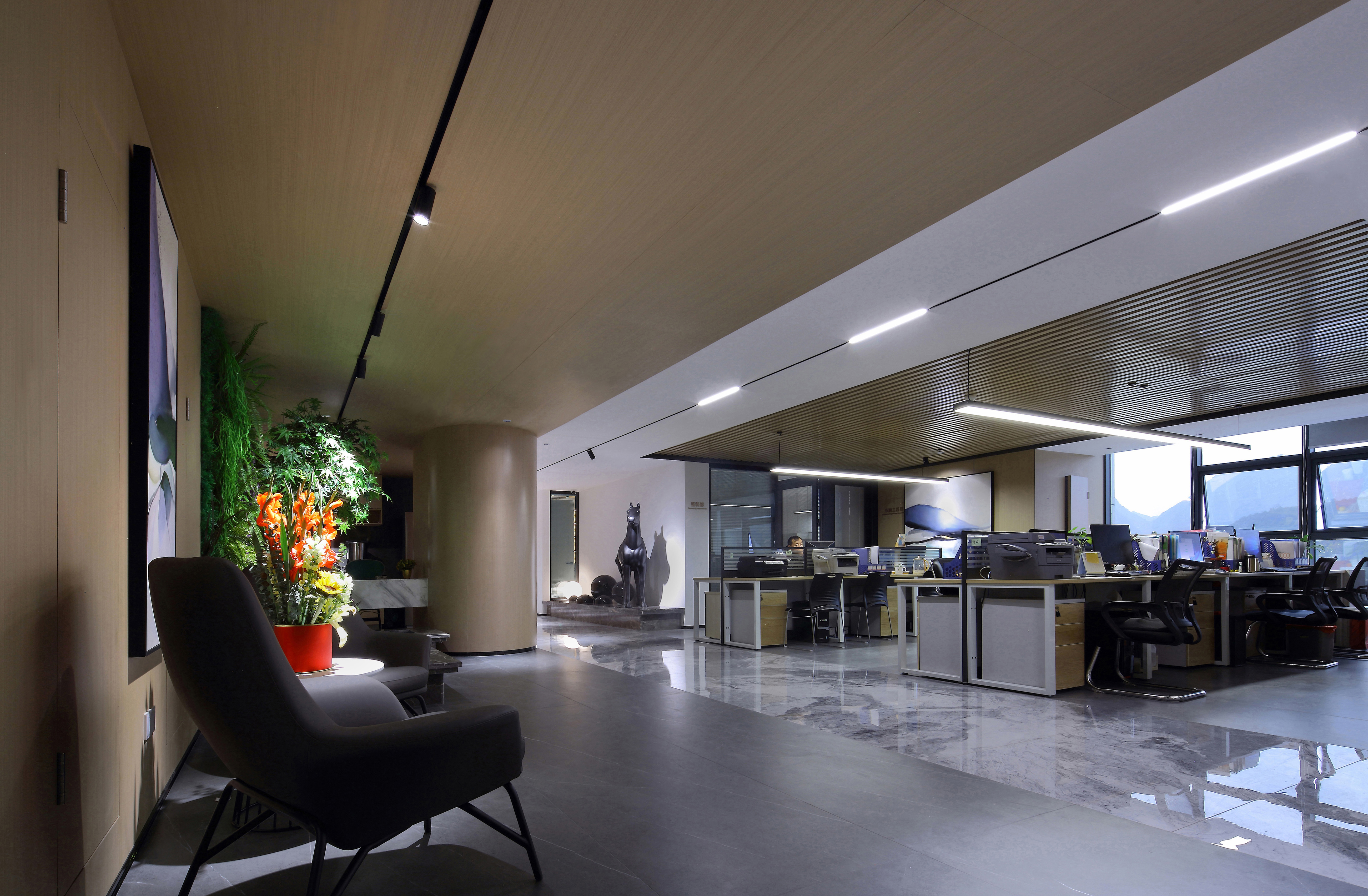 空间布局:通过开放空间视野,极具质感的材料运用,以及极致的照明与多功能系统,将光线、色彩、肌理、线条及室外的景观融合,营造成具有视觉冲击力和感染力的空间场域,并以此传递时尚、活力的企业气质。