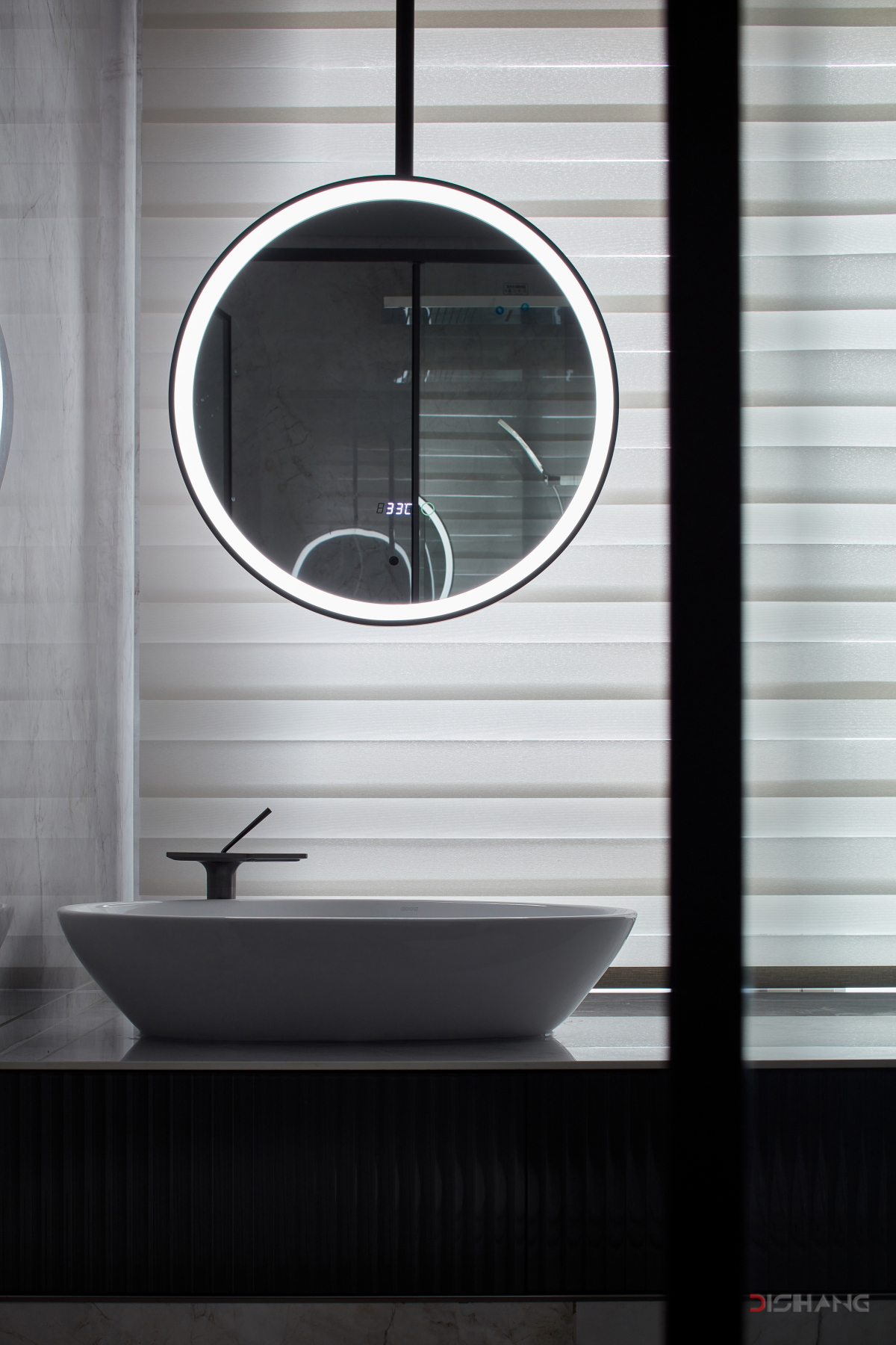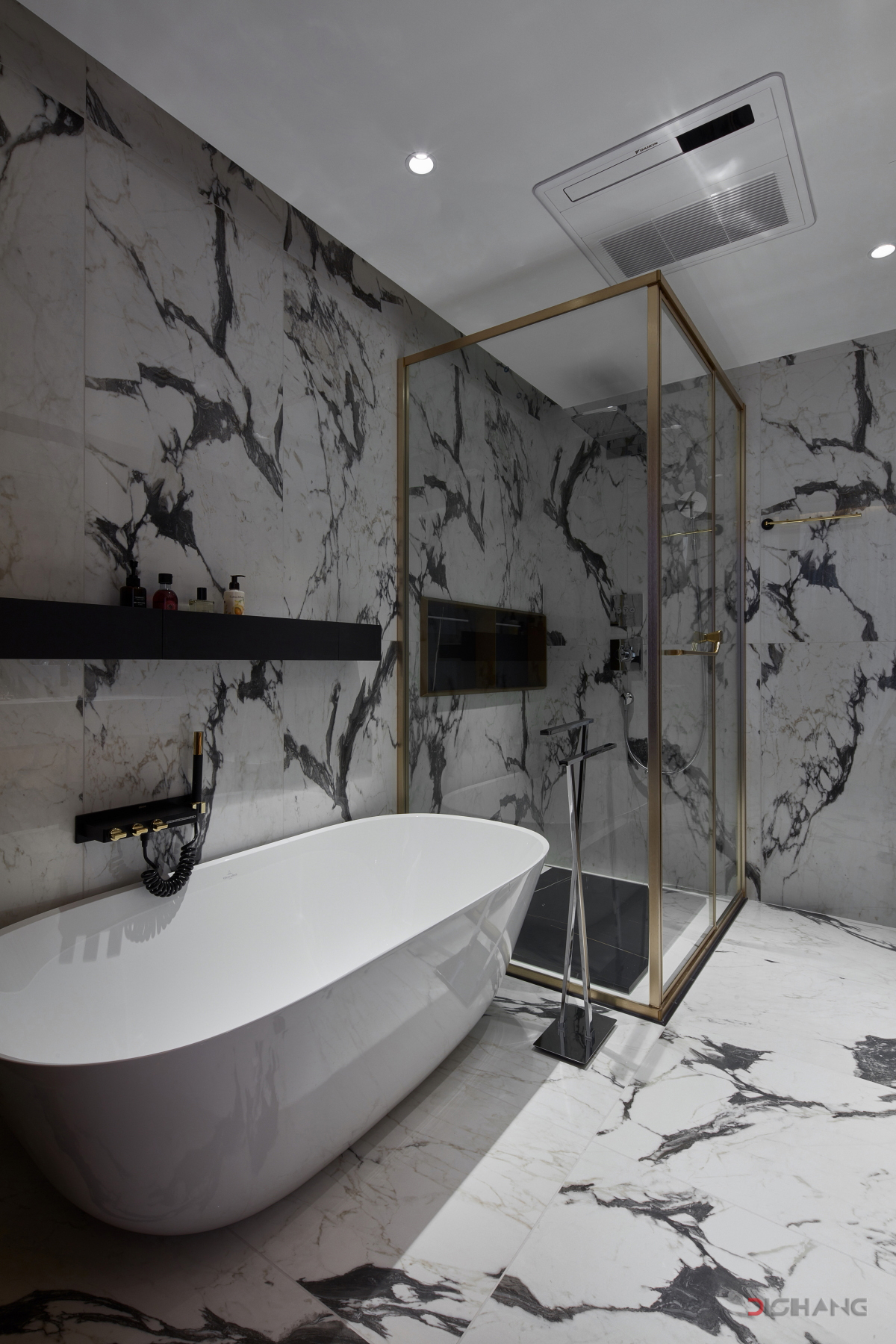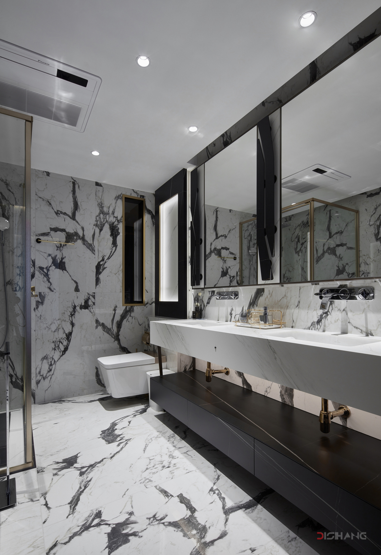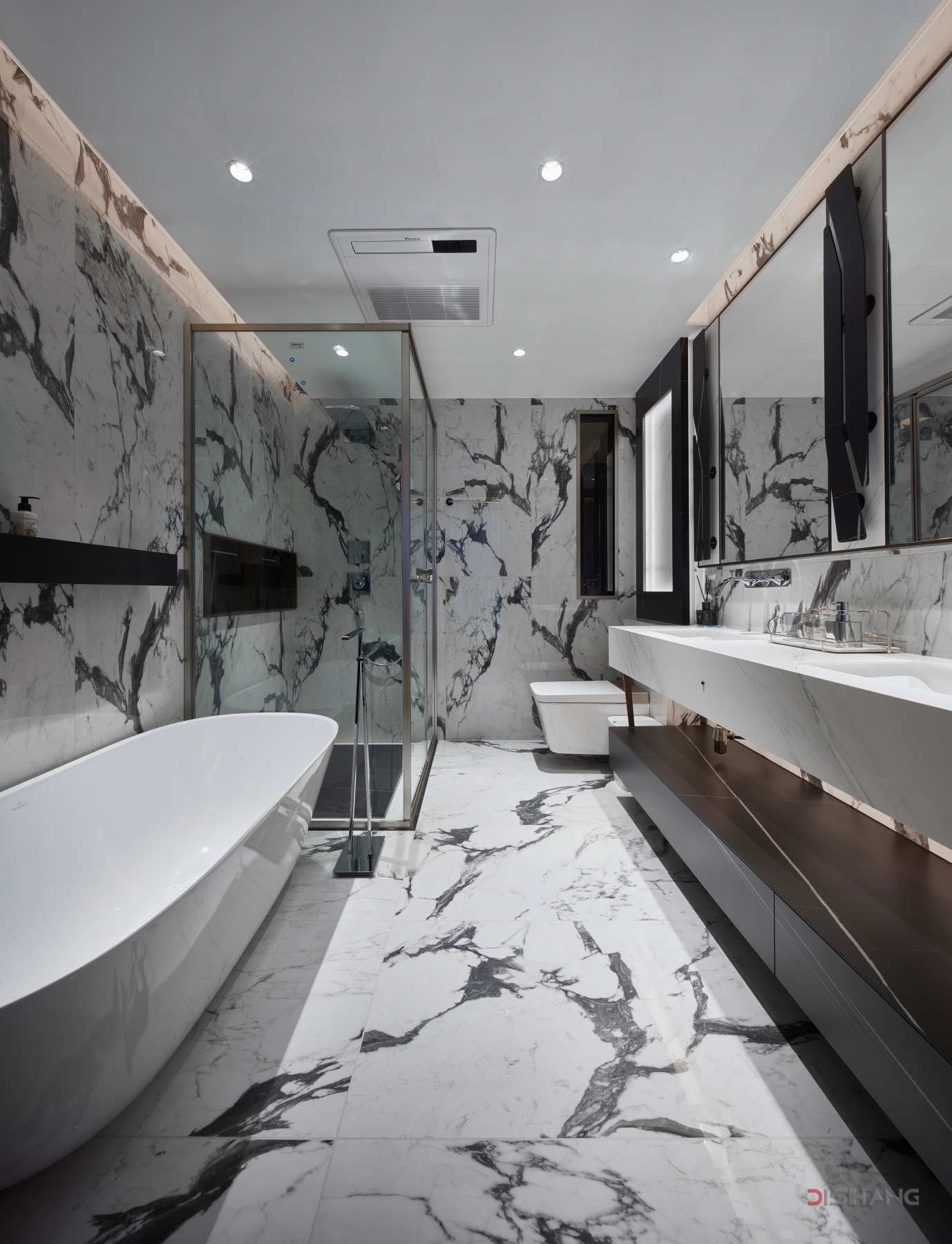 卫生间延续整体的设计手法,整洁舒适,于现代风格中流露出写意之美,打造品质空间,为有序的静态空间注入动感。 The toilet continues the overall design technique, neat and comfortable, reveals the Freehand beauty in the modern style, creates the quality space, injects the dynamic feeling for the order static space.