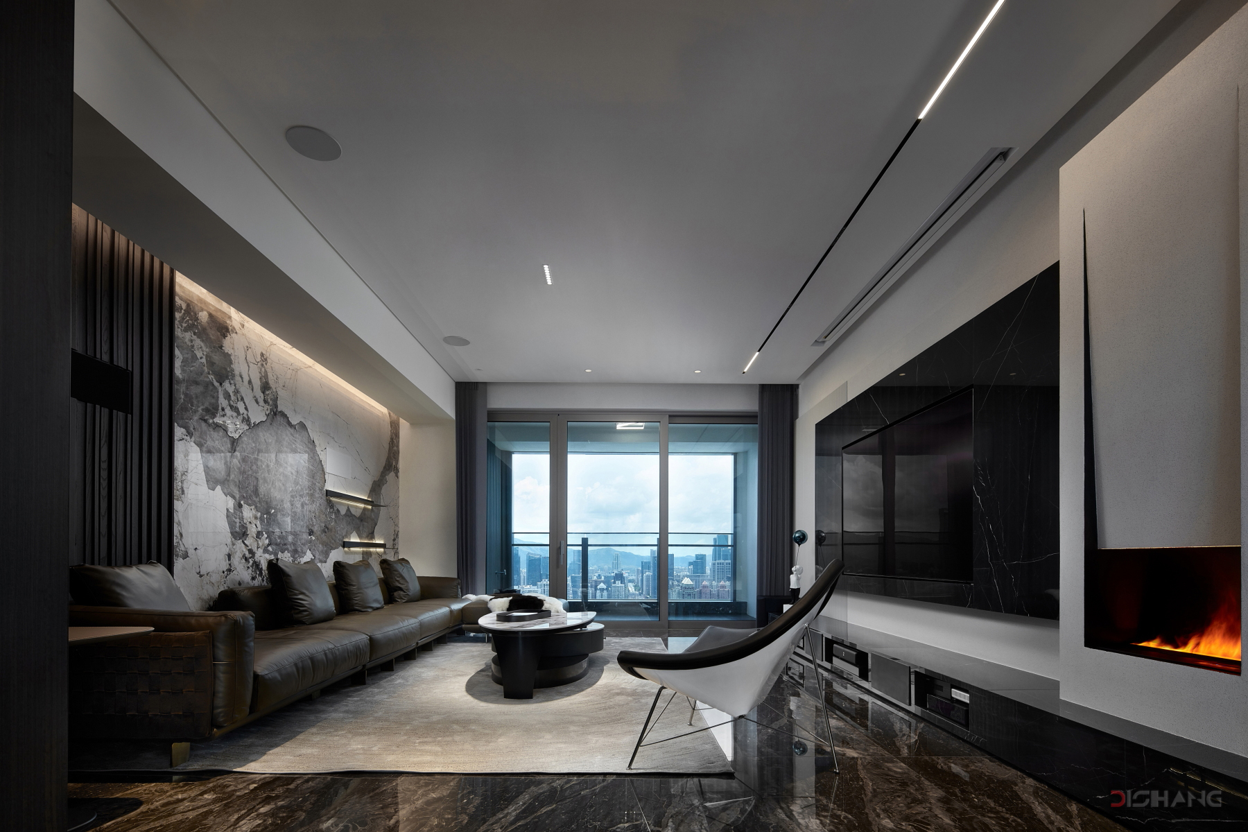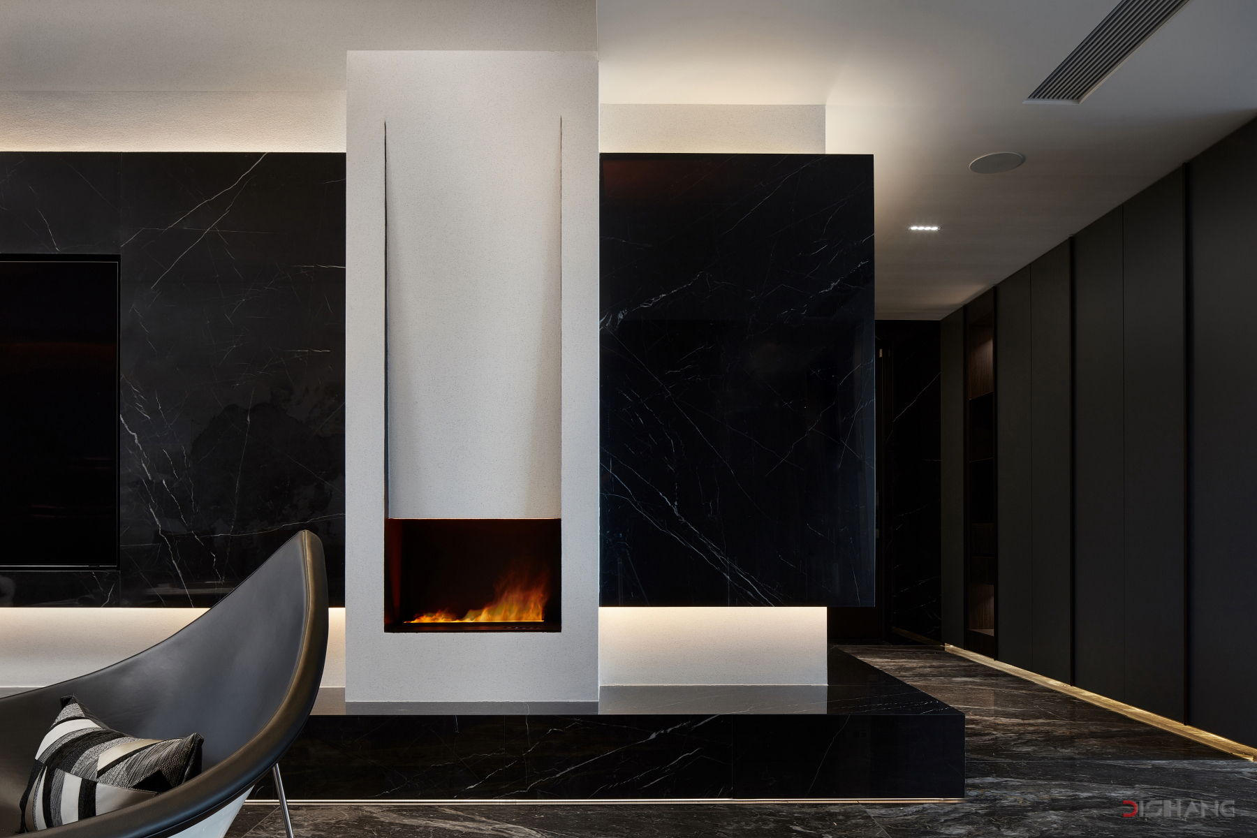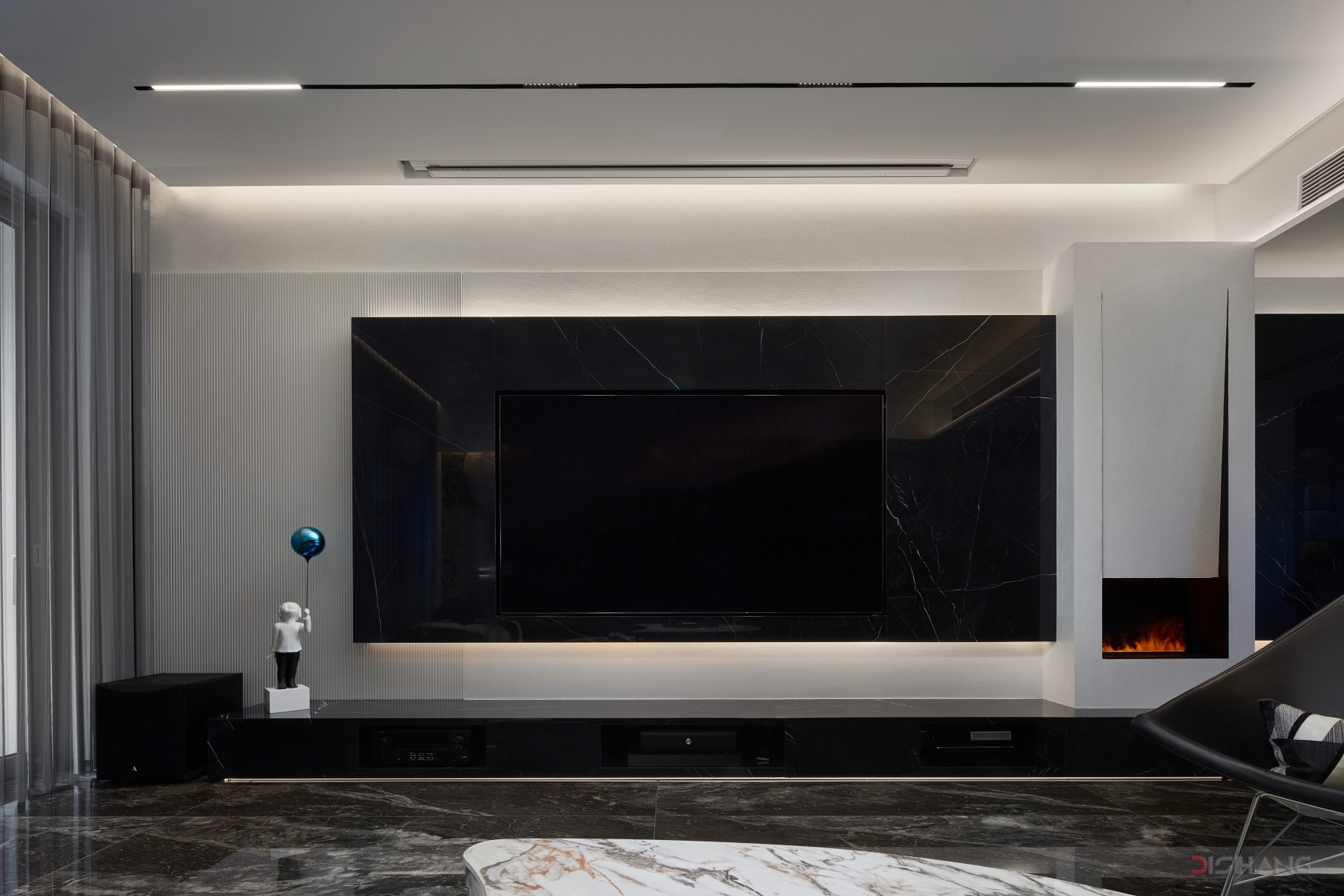 设计选材:沙发背景墙由木格栅与进口潘多拉岩板无缝拼接,墙面似水墨晕染,徐徐散开,搭配黑色皮质沙发,石材与木质、皮艺的结合,温润自然,低调内敛,看似清冷的姿态,却流露出时尚奢华的质感。