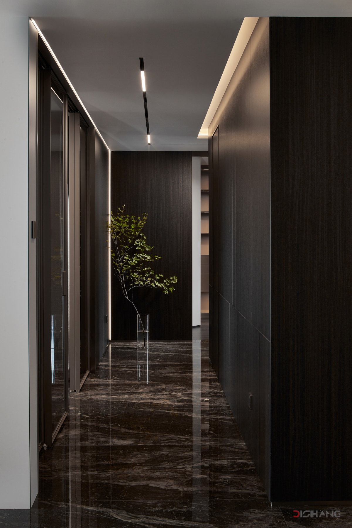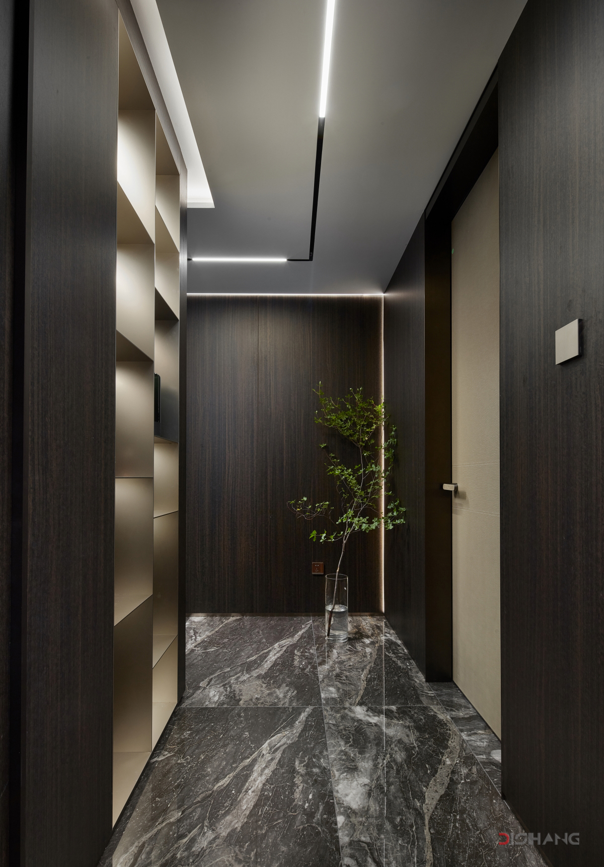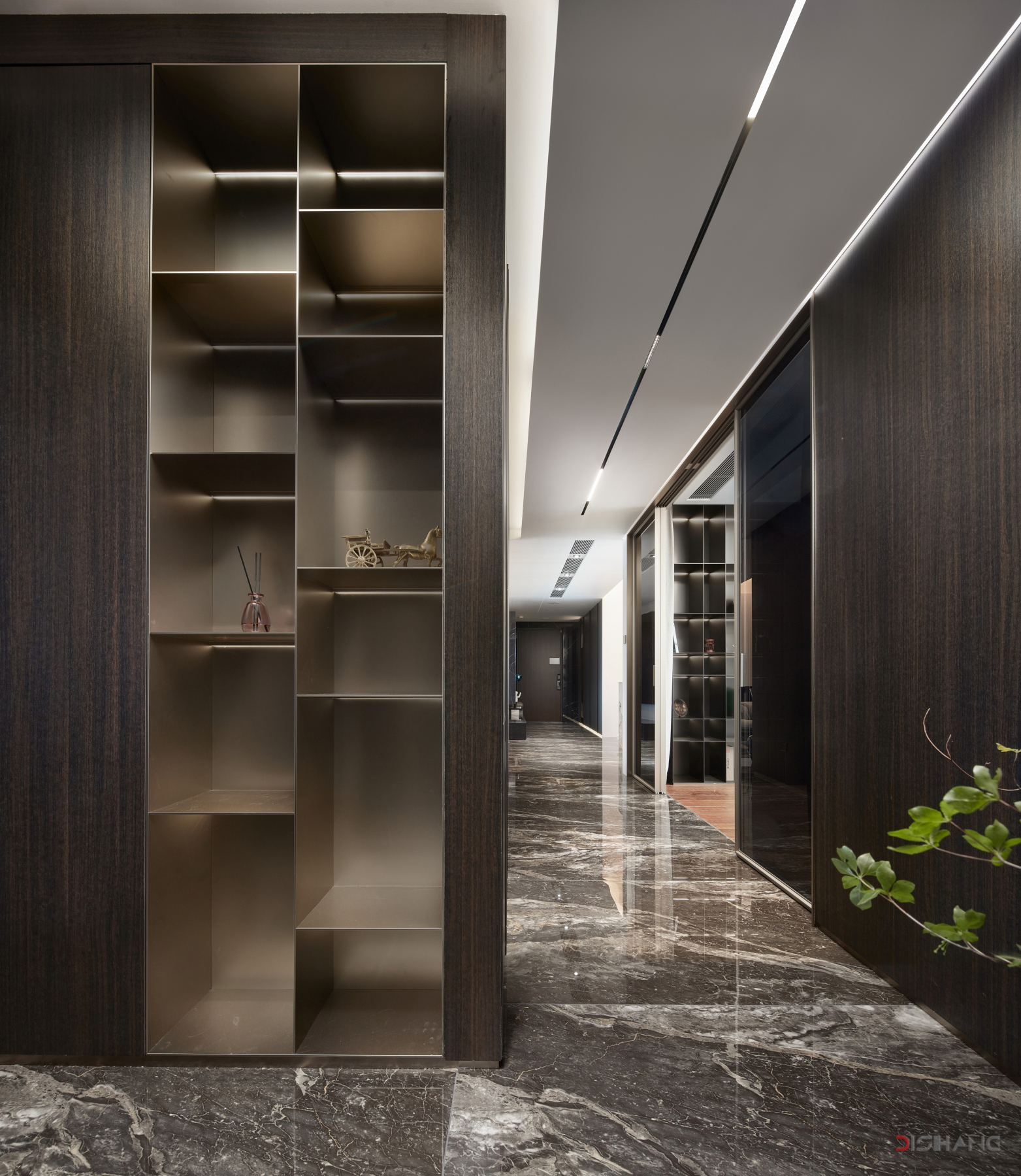 去往卧室的走廊,通过木的质体描绘空间的轮廓,用材质、光影勾勒空间气场,视觉整体融洽,既深沉又温润,缓慢展开至新的休息区域之中。 Go to the corridor of the bedroom, describe the outline of the space through the qualitative body of wood, outline the space air field with material, light and shade, visual whole harmonious, both deep and moist, slowly spread out to the new rest area.
