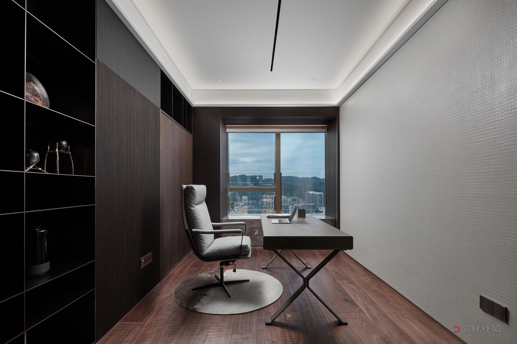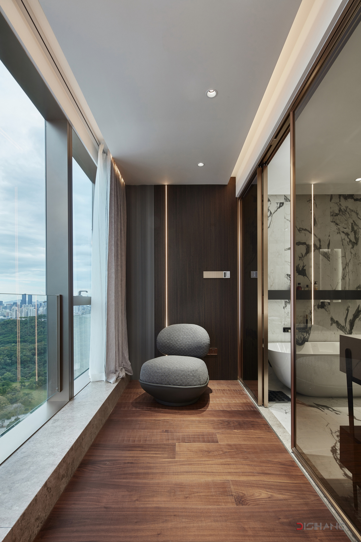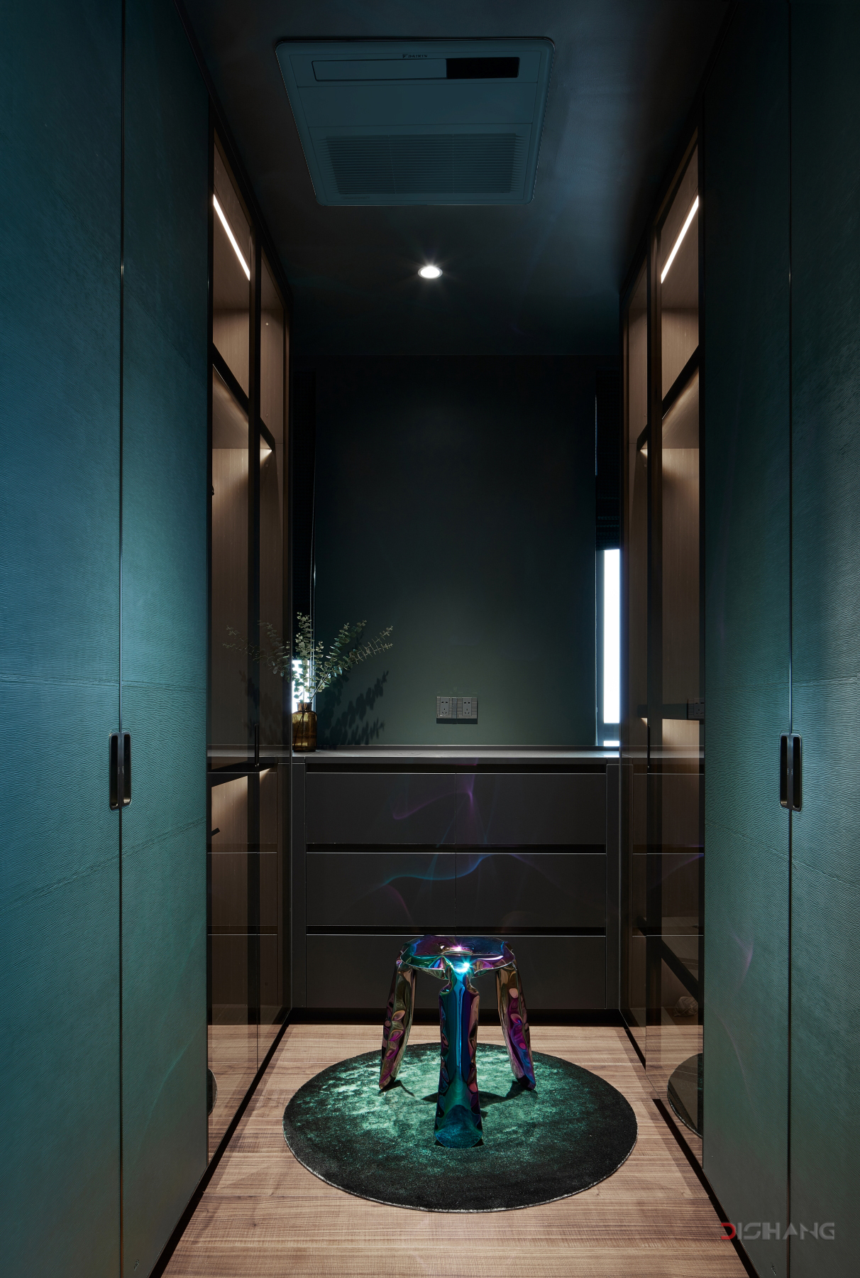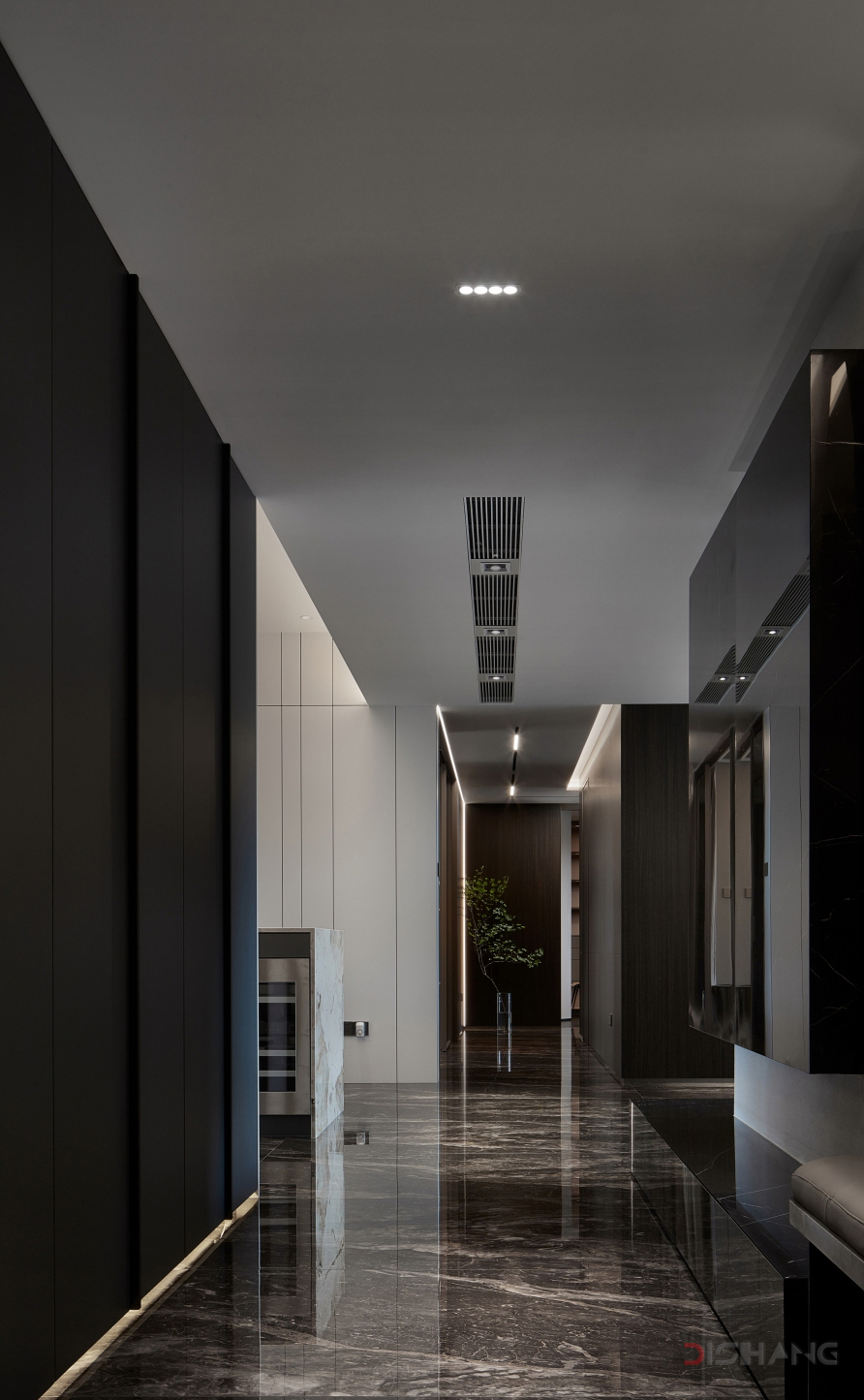 去往卧室的走廊,通过木的质体描绘空间的轮廓,用材质、光影勾勒空间气场,视觉整体融洽,既深沉又温润,缓慢展开至新的休息区域之中。 Go to the corridor of the bedroom, describe the outline of the space through the qualitative body of wood, outline the space air field with material, light and shade, visual whole harmonious, both deep and moist, slowly spread out to the new rest area.