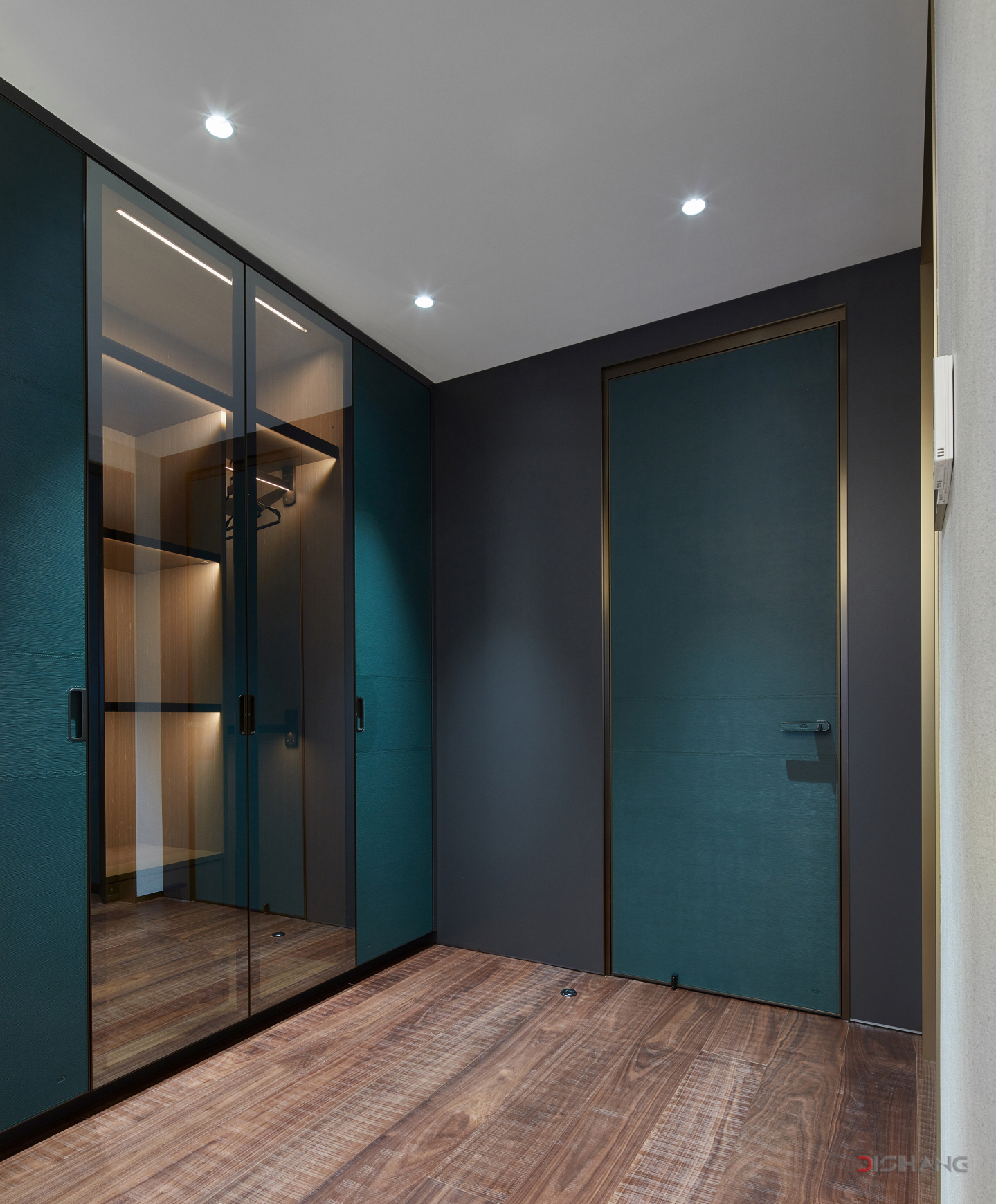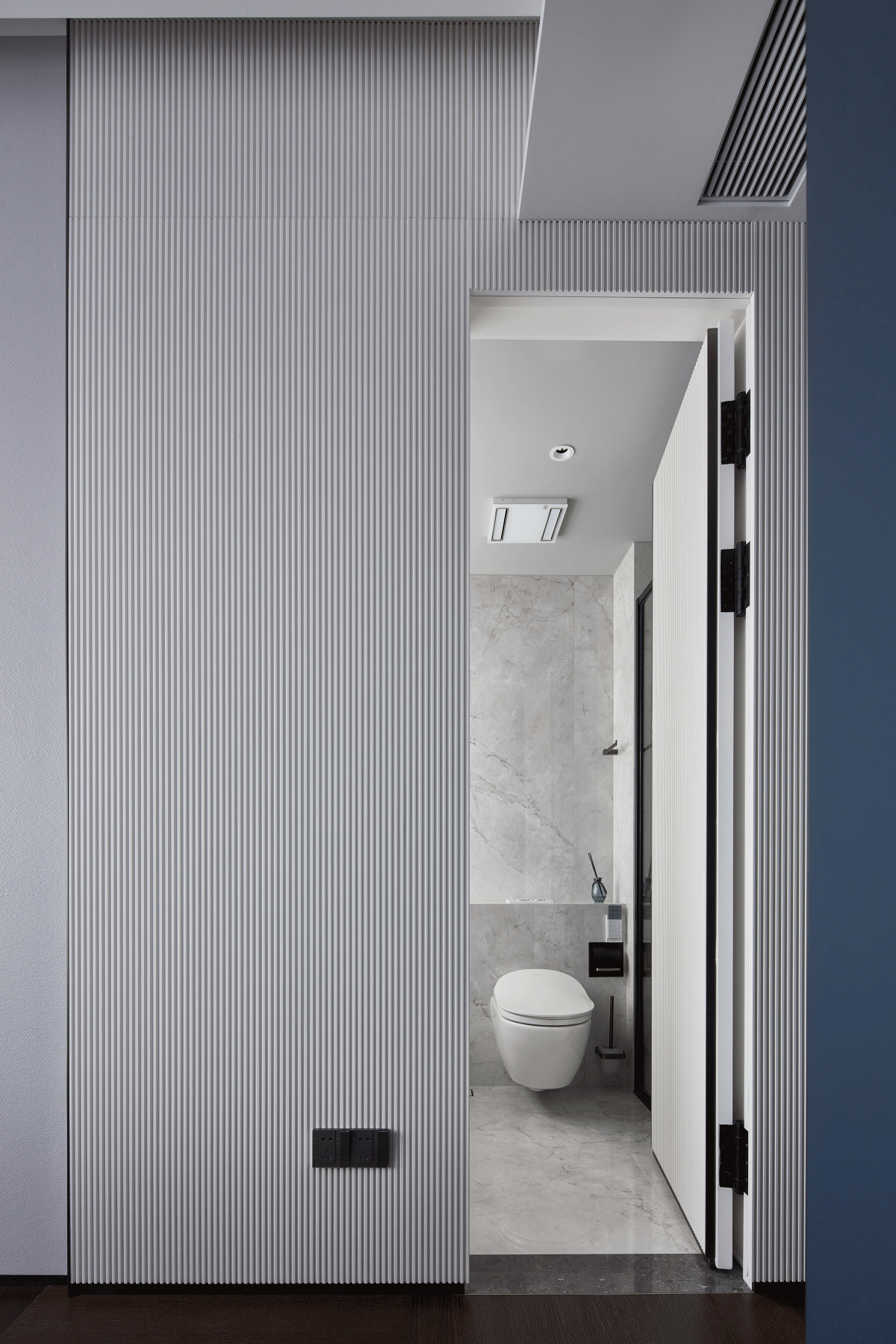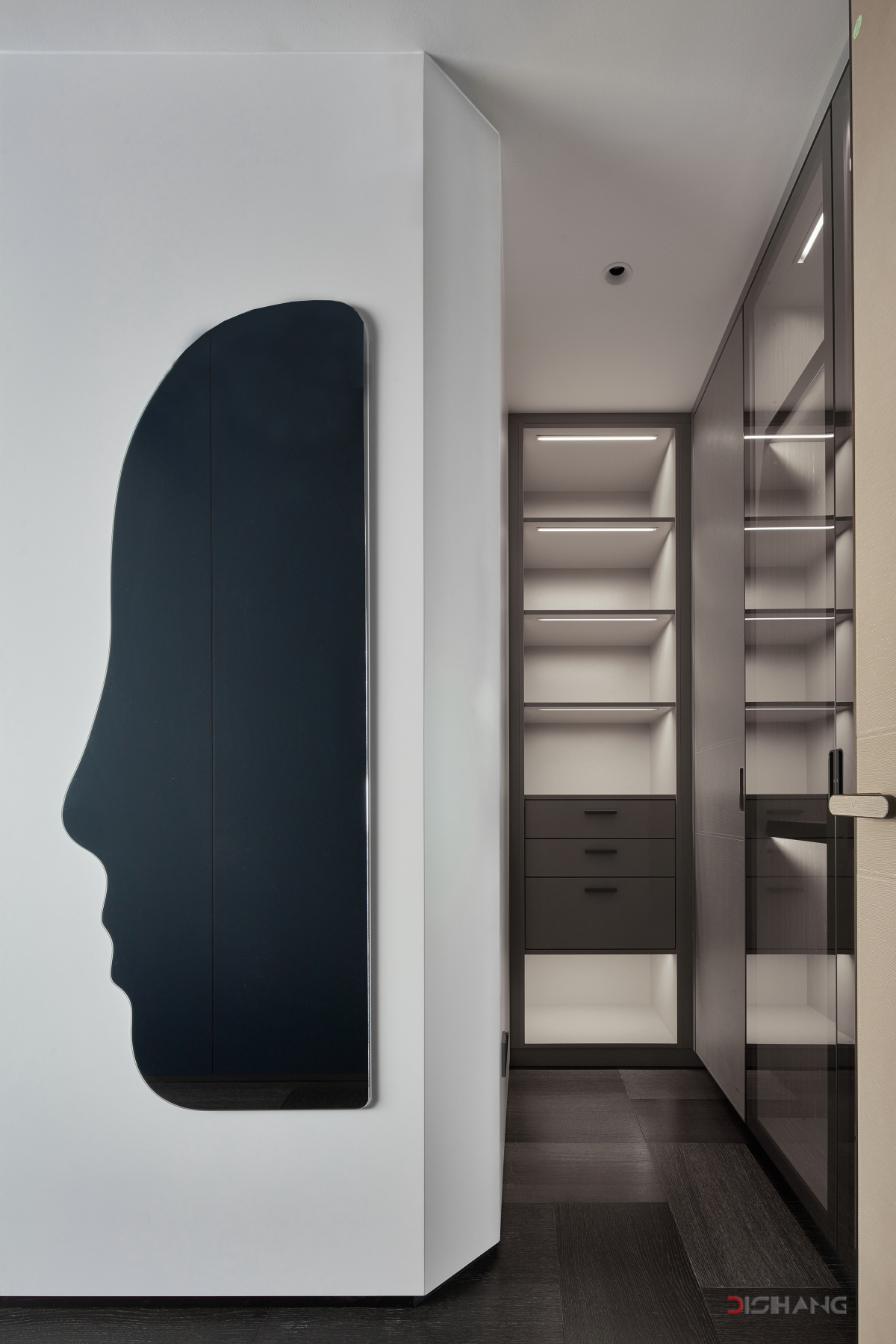 隐形门设计将现代主义手法贯彻到极致,开合门与旁边的墙面融为一体,干练利落,充满了现代感。 Invisible door design will carry out modernism tactics acme, open and close door and the metope of flank melt into one body, capably neat, full of modern feeling.