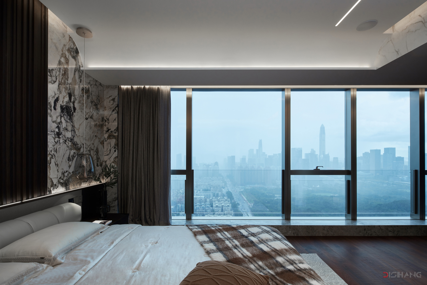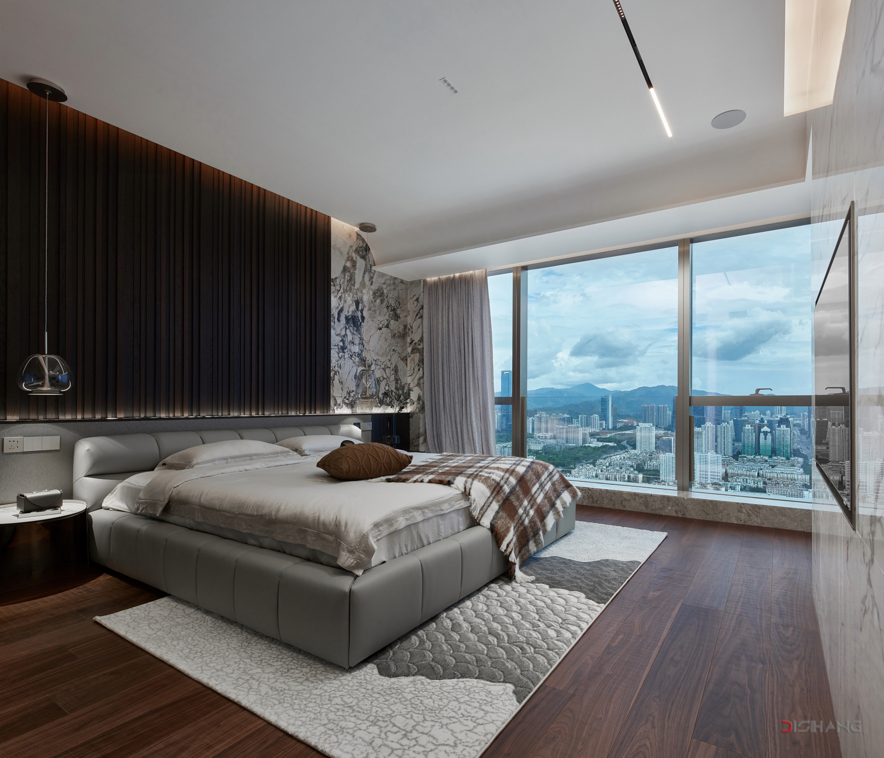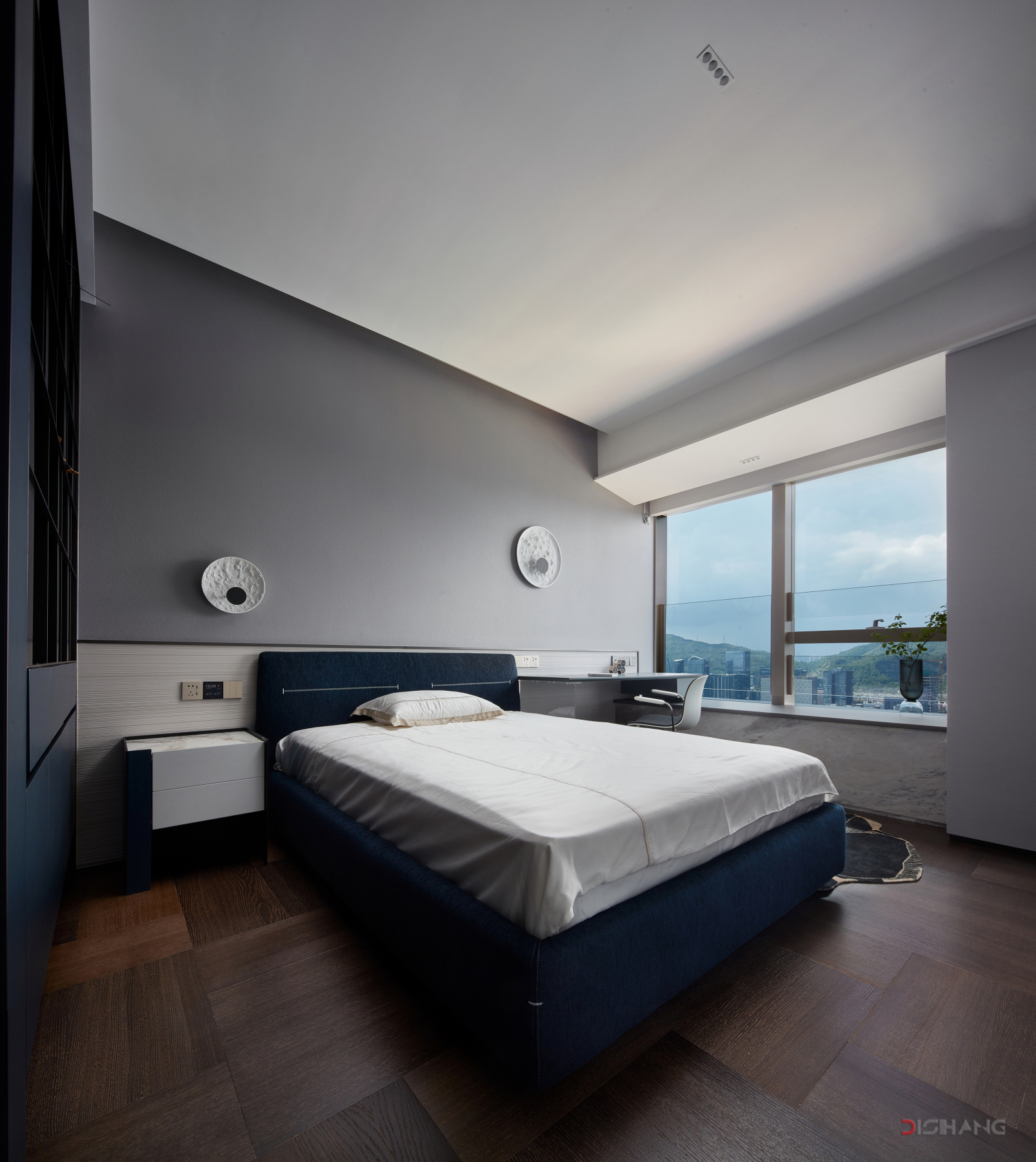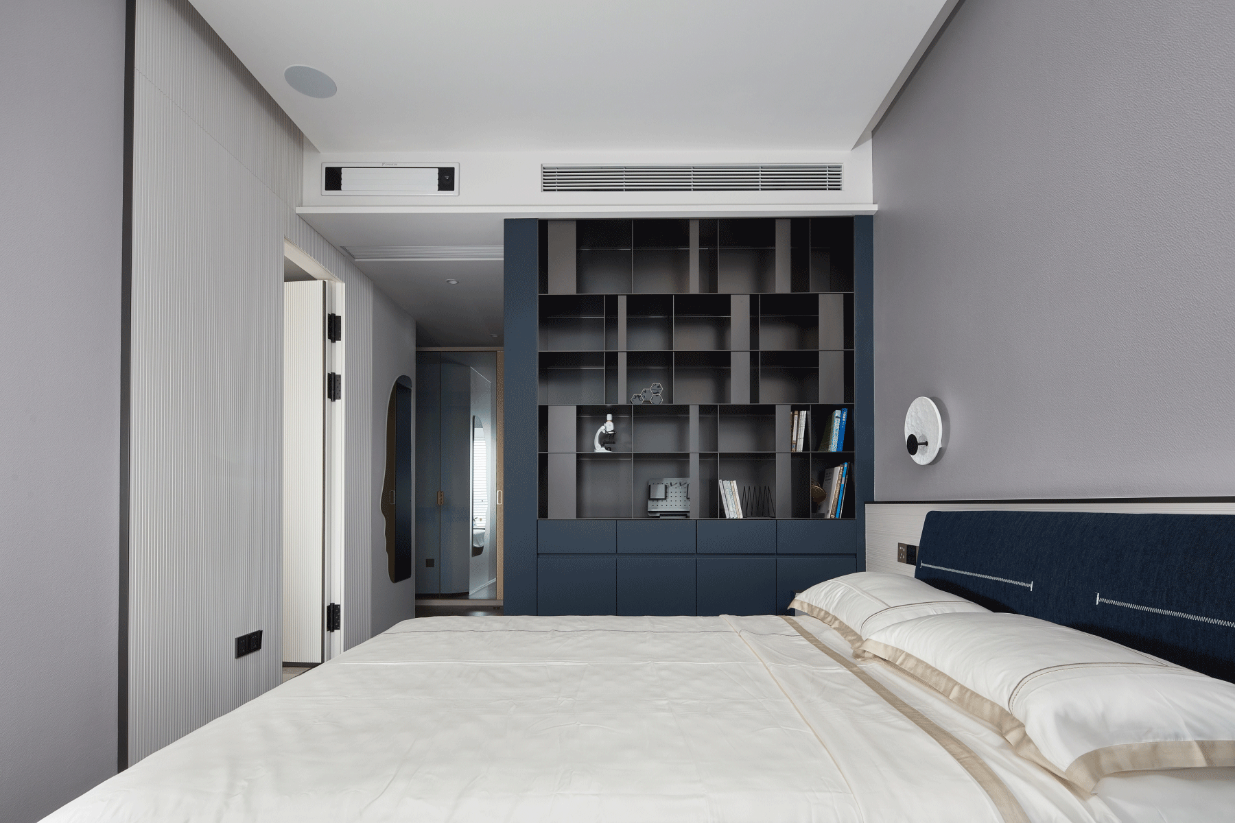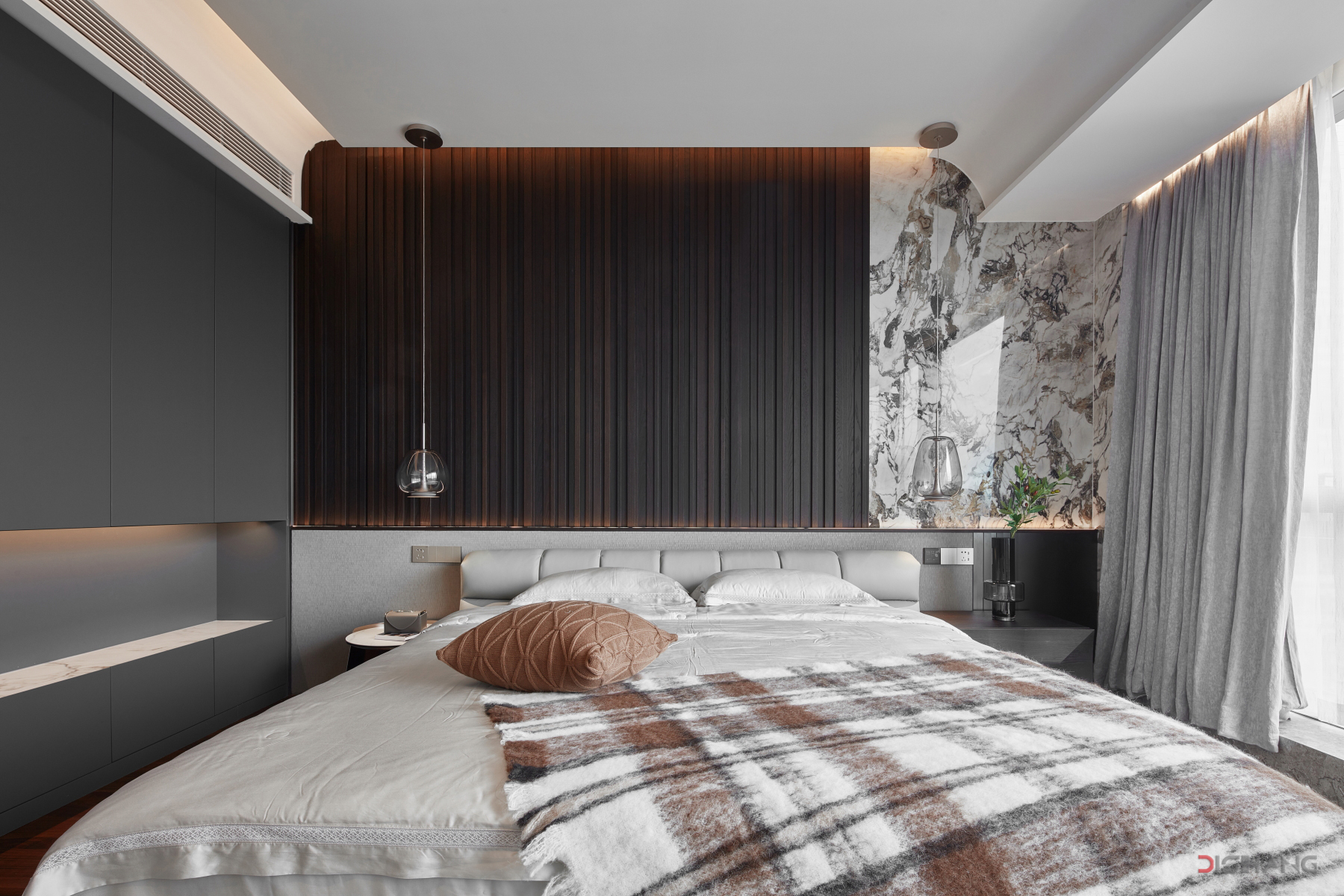卧室用不规则格栅与沉稳的岩板,制造视觉冲击与美学平衡,重新定义了空间结构的形式,用不同材质对比交织出雅致的气息,从细节彰显主卧高雅格调。 The bedroom uses irregular grid and sedate slate, create visual impact and aesthetic balance, redefine the form of the spatial structure, with different materials contrast interweave elegant breath, from the details of the master bedroom elegant style.