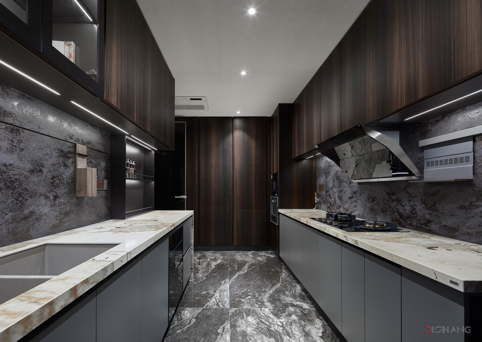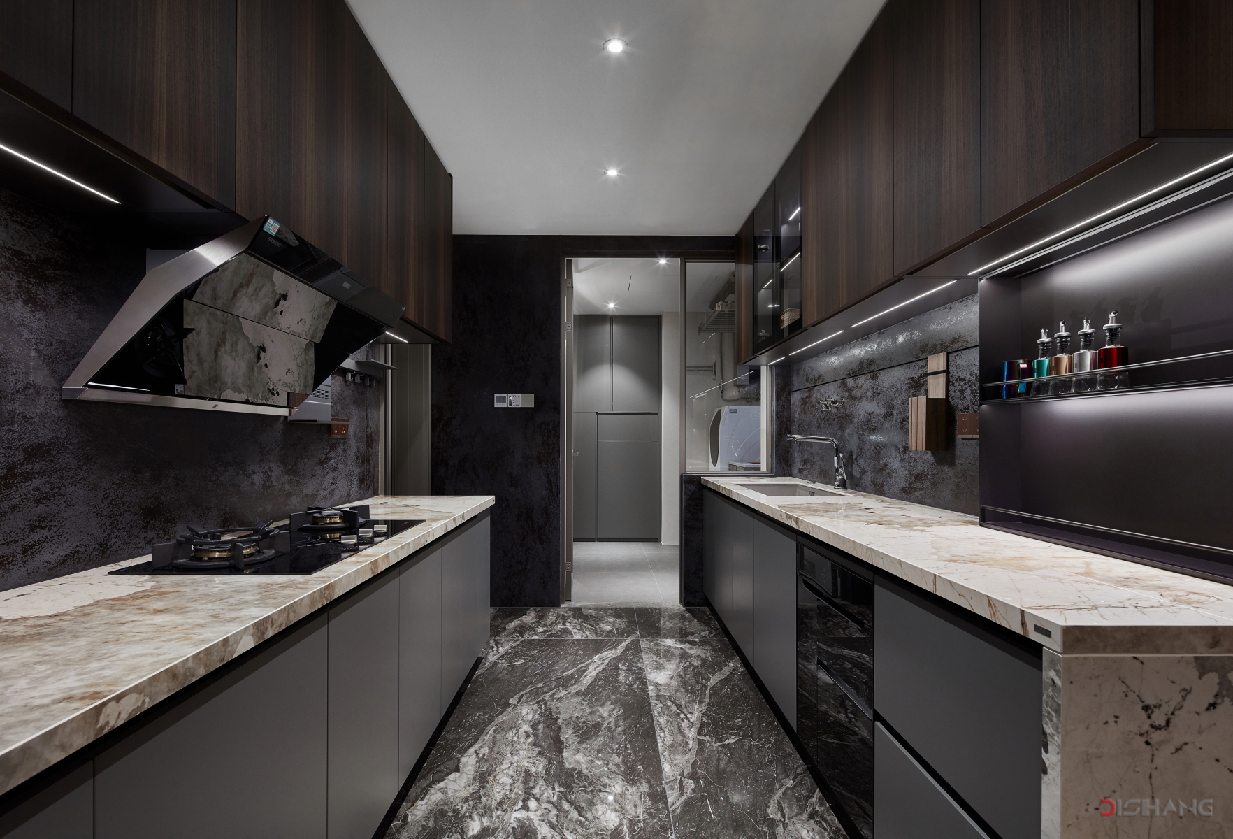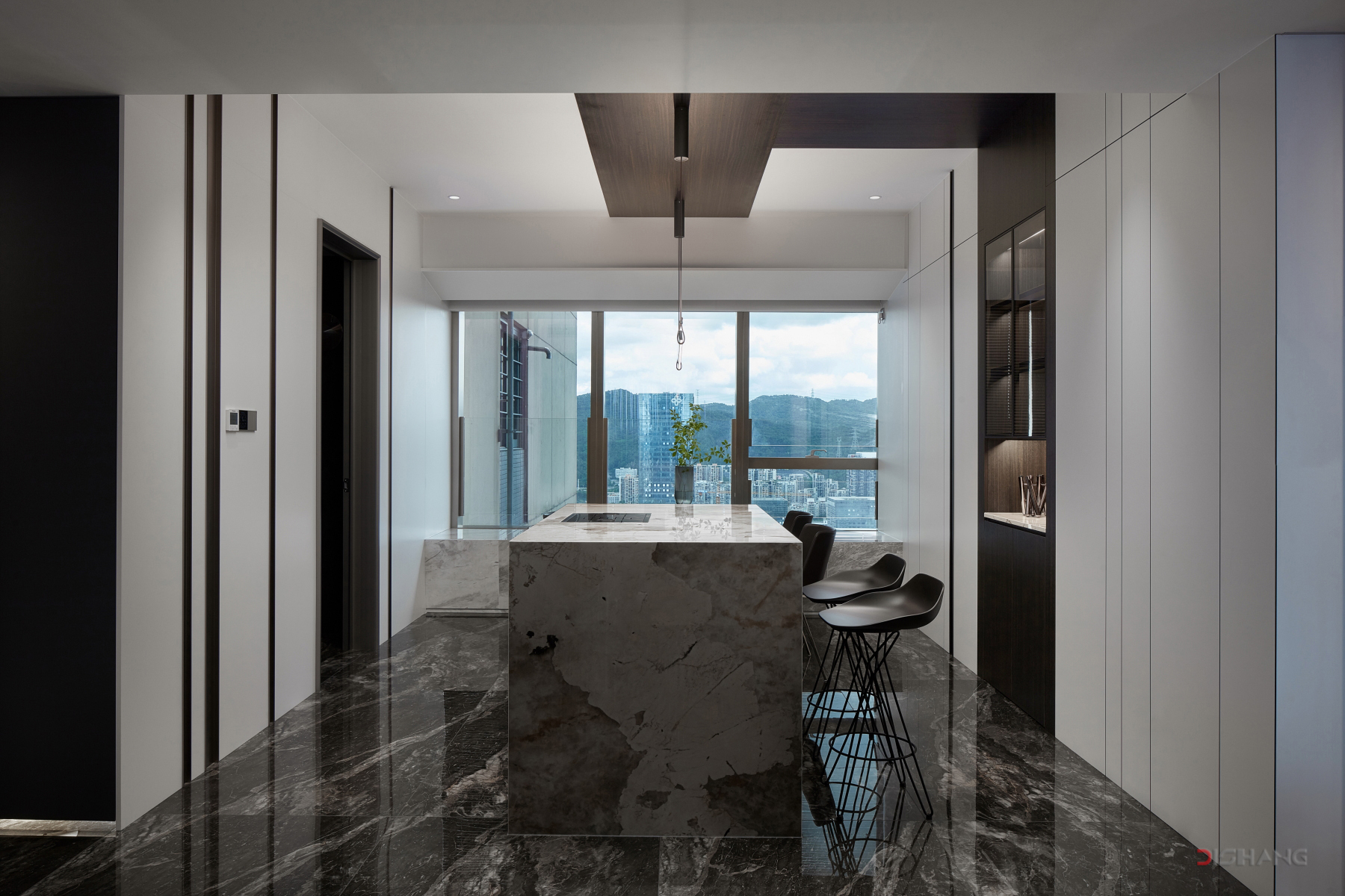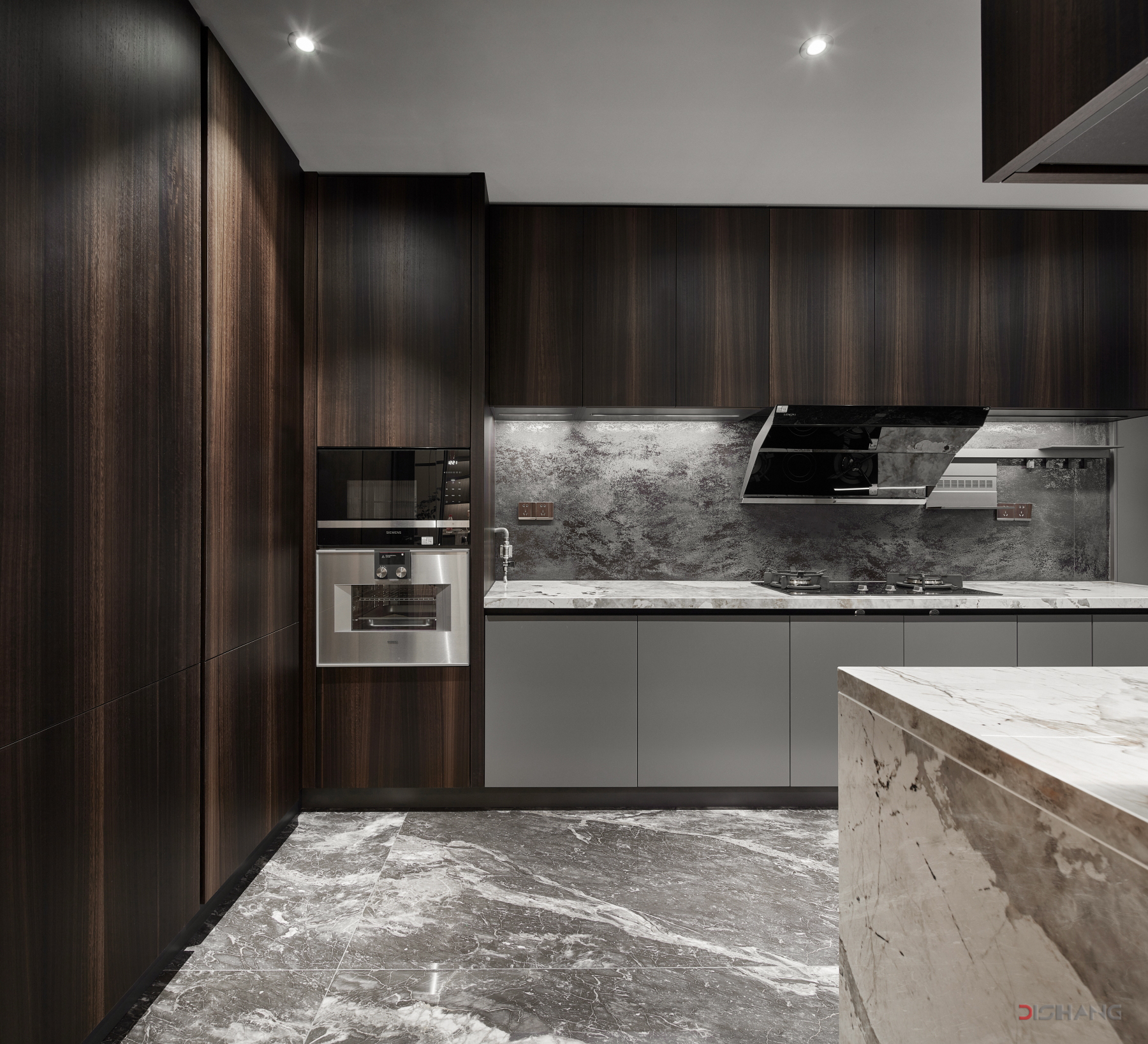 空间以黑灰色为主色调,黑灰色的大理石纹贯穿家里的每个区域,看似粗犷冷峻,实则时尚大气。同时辅以烟熏橡木饰面装饰,将家的温暖和酒店的情调糅合在一起,给休闲生活注入别致的新鲜感及身心享受。 -