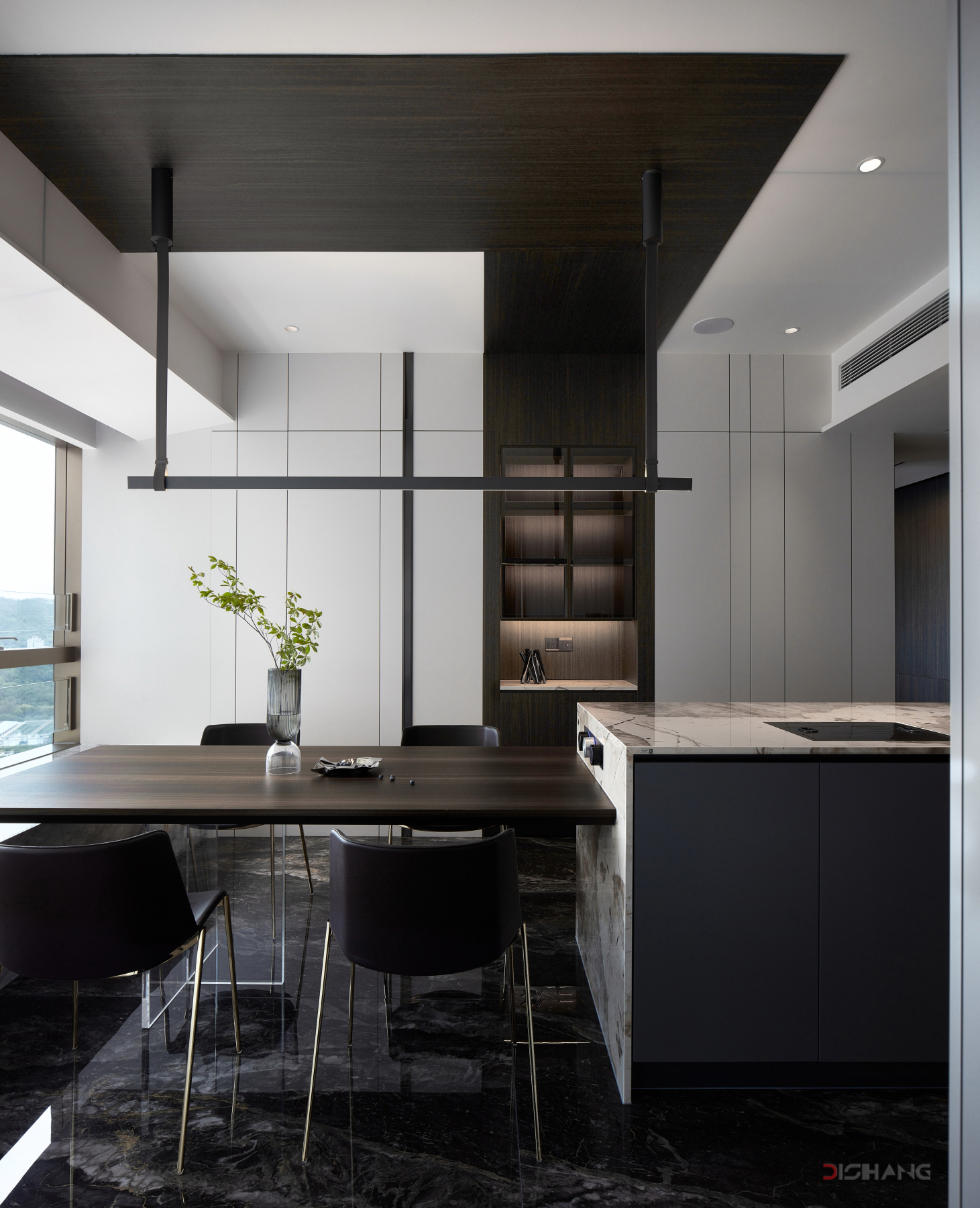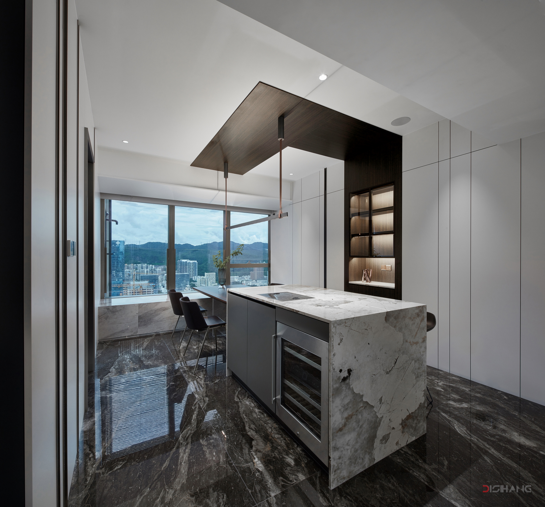 悬浮式餐桌连接岩板岛台,石材与木质的纹理搭配,让整体更显美观流畅。岛台水盆采用隐藏式设计,平时不用时可以藏到台下,解放台面空间,整体在视觉上更加简洁清爽。 -