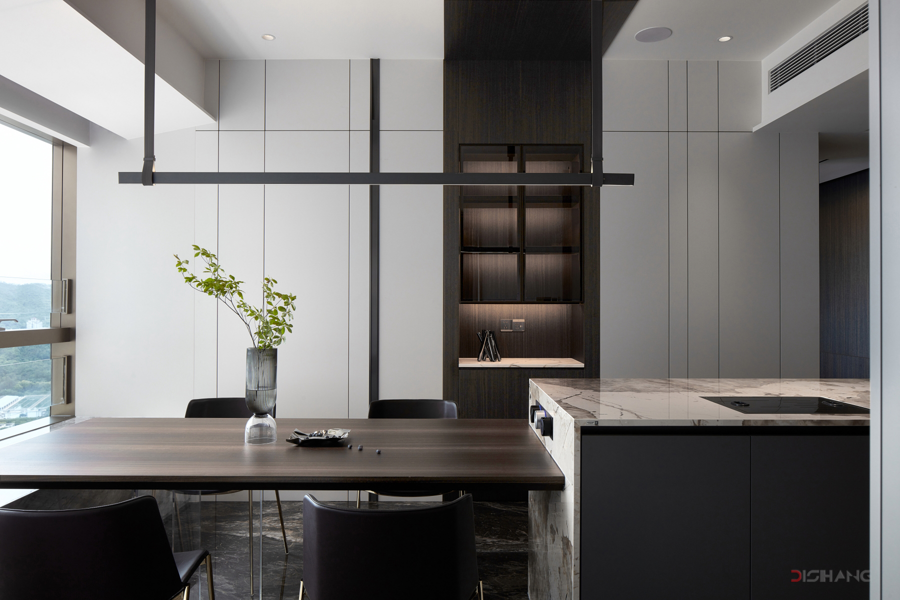餐桌和水吧台一体化设计,打造的是一种生活方式,感受到了白色与烟熏橡木色调的碰撞,设计师利用色块的穿插,将立面造型与空间功能做了完美的结合。 The integrated design of the dining table and the water bar creates a way of life, feeling the collision of white and Smoky Oak tones. The designer uses the interludes of the color blocks to combine the shape of the facade with the function of the space.