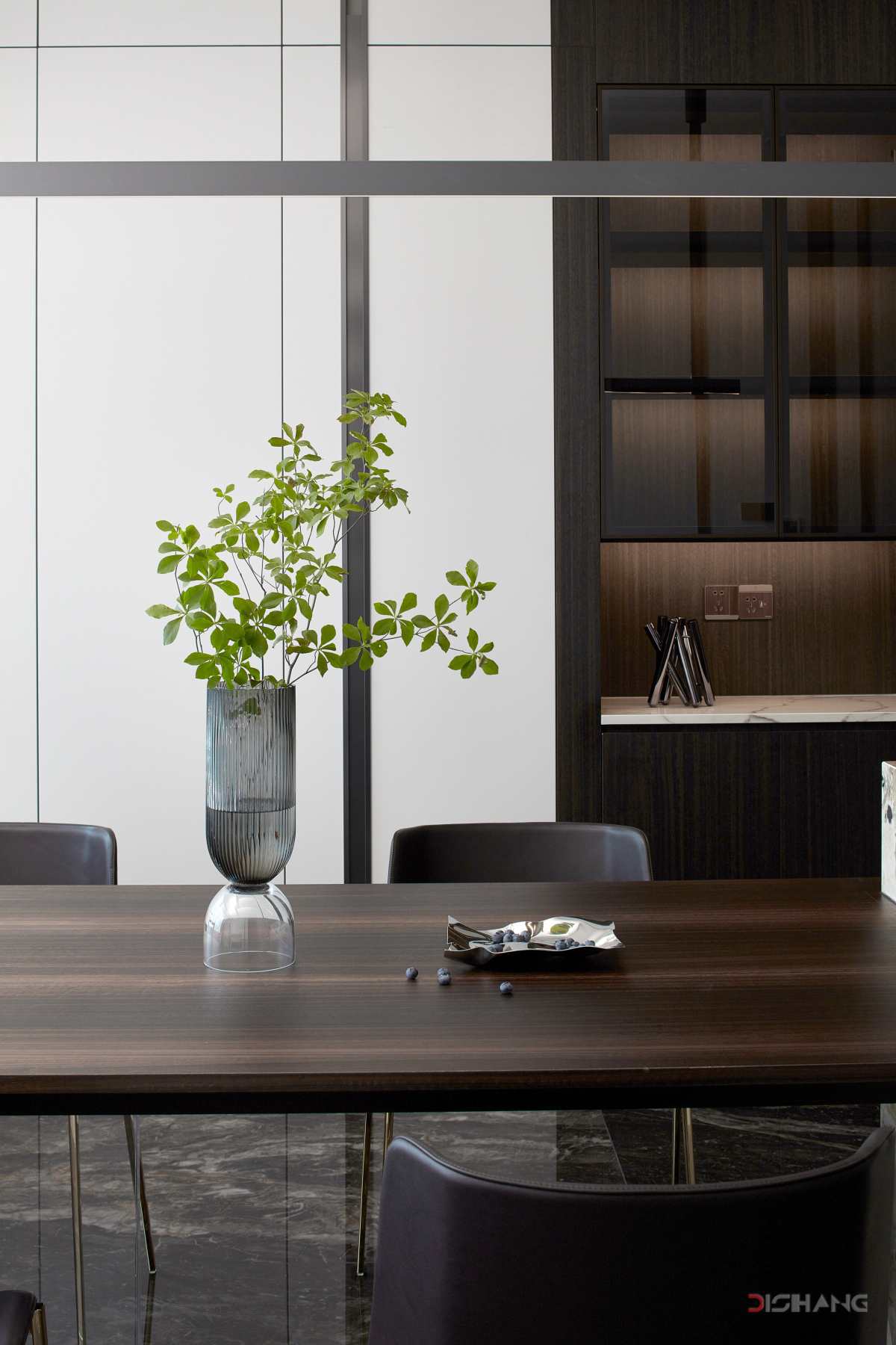 烟火亦有风情,是对仪式感的讲究,厨房与餐厅相互连通,以木、岩板进行贯穿,无把手的柜体立面,秩序与质感兼具,顶天立地的柜体成为冰箱的藏身之处,兼顾美学与实用性。 Fireworks also have style, it is to pay attention to the sense of ceremony, kitchen and dining room are interlinked, with wood, rock plate through, no handle of the cabinet facade, order and texture, the cabinet of the Not Scared to Die become the hiding place of the refrigerator, give attention to both aesthetics and practicality.