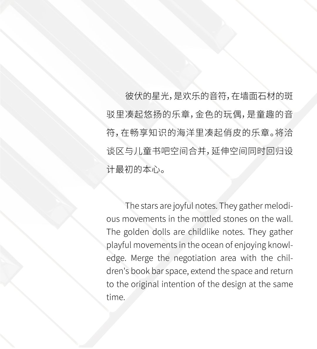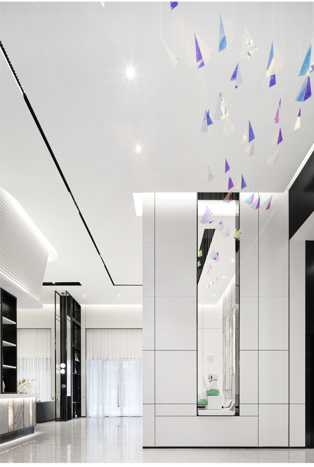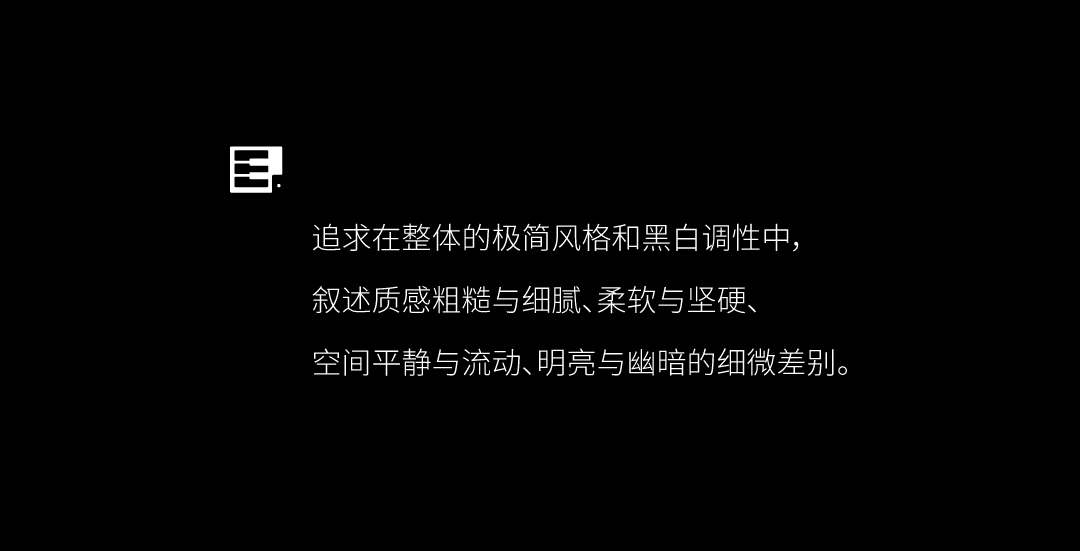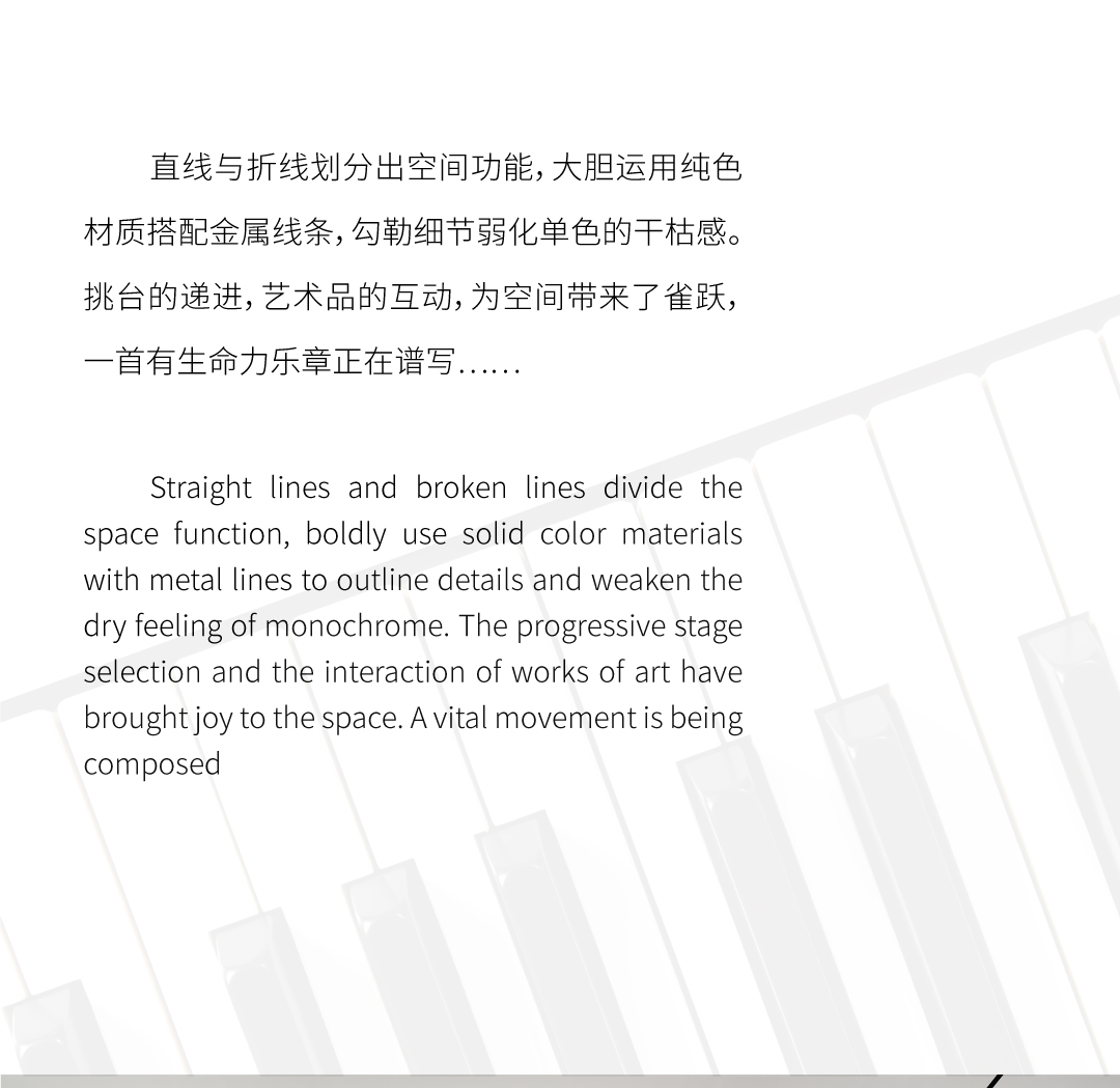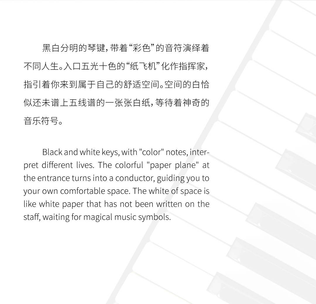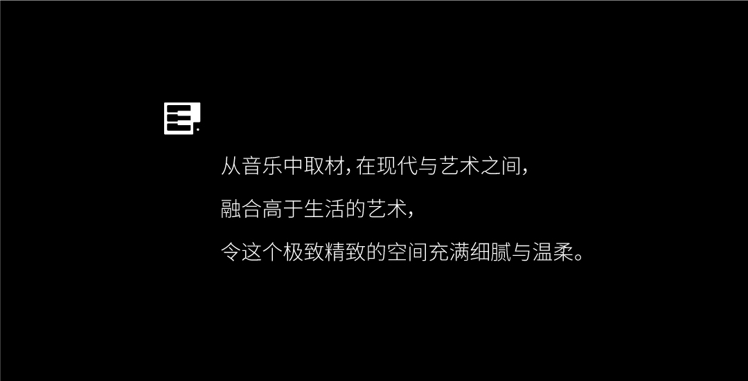 本案将黑键比作勾勒空间的点与线,串联纯白色块凸显出极具序列与张力的内空间。提取经典的黑白色调,去风格化,用纯粹的体块来分割功能,回归设计本源,打造纯净臻雅的美学空间。