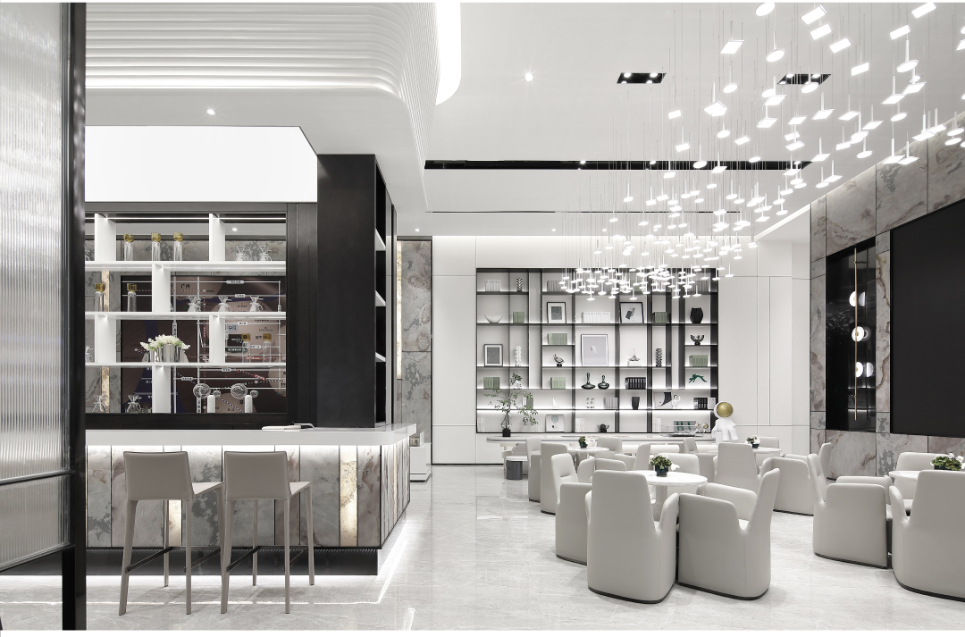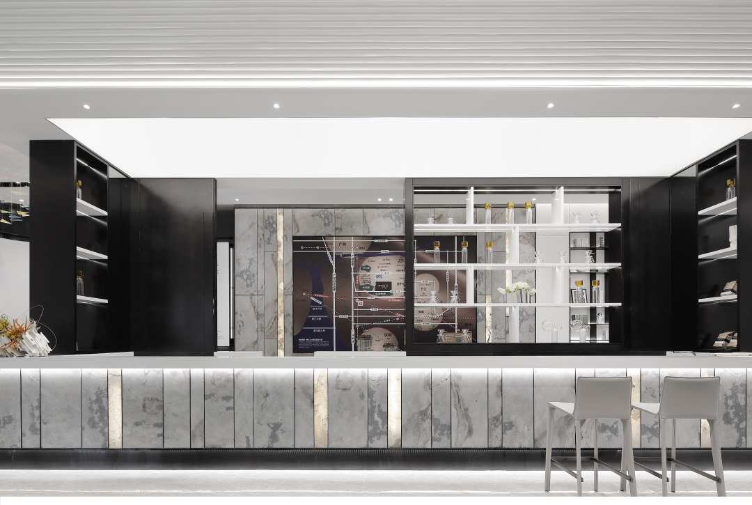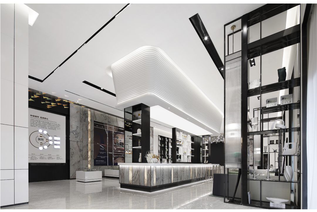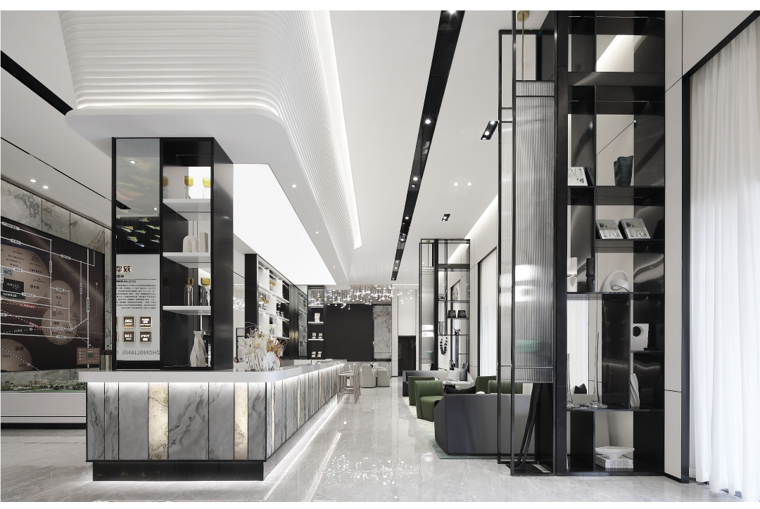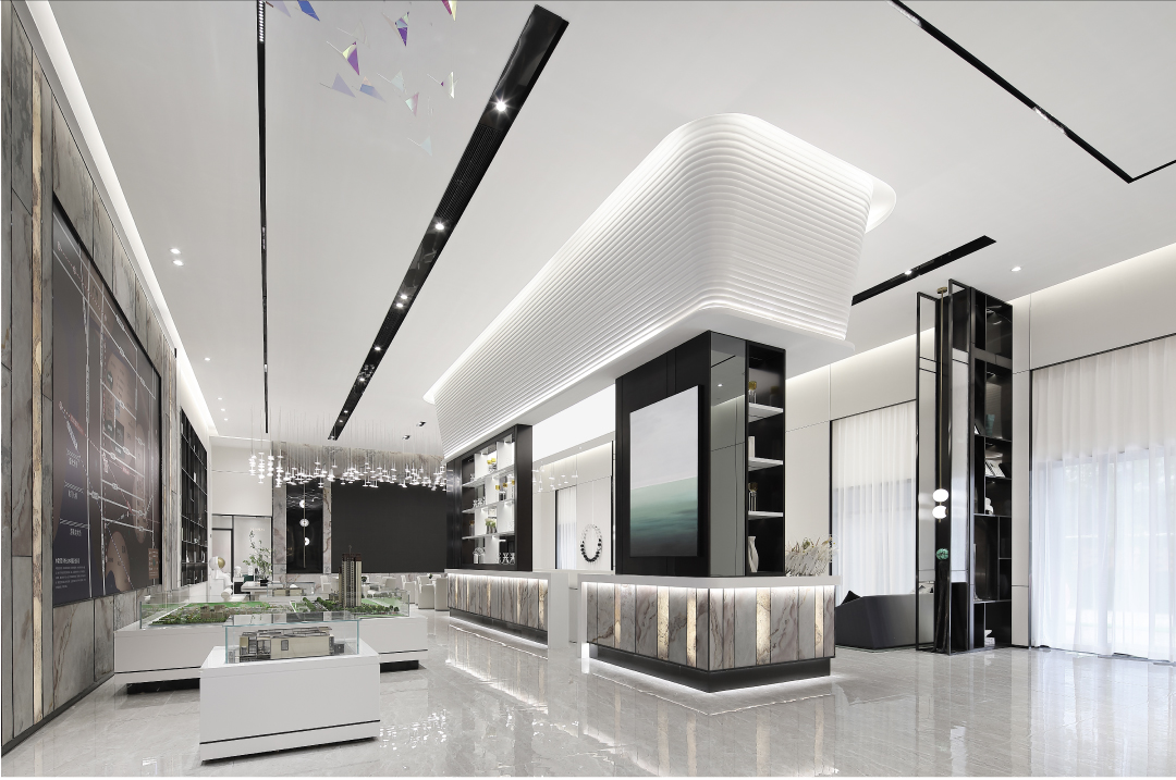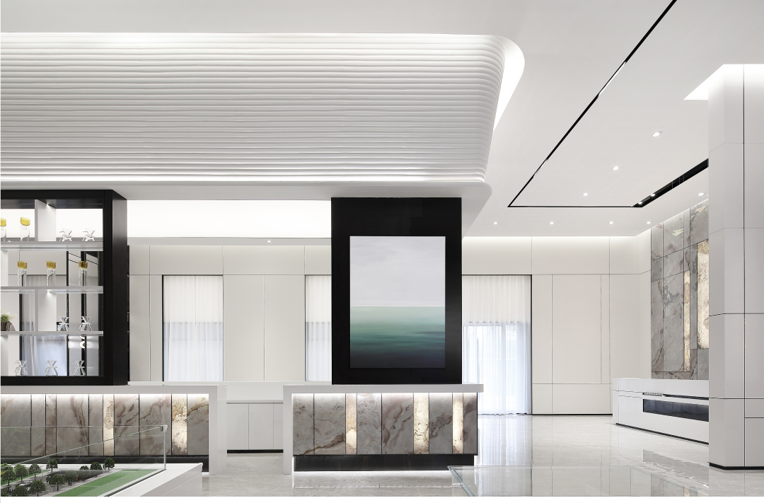 空间内大面积的白由人造石、壁布、烤漆板组成,环保可再生资源。作为临展性质的商业空间运用环保快捷的材料进行设计,搭配深色金属以及少量天然石材,增添空间多样性与品质感。