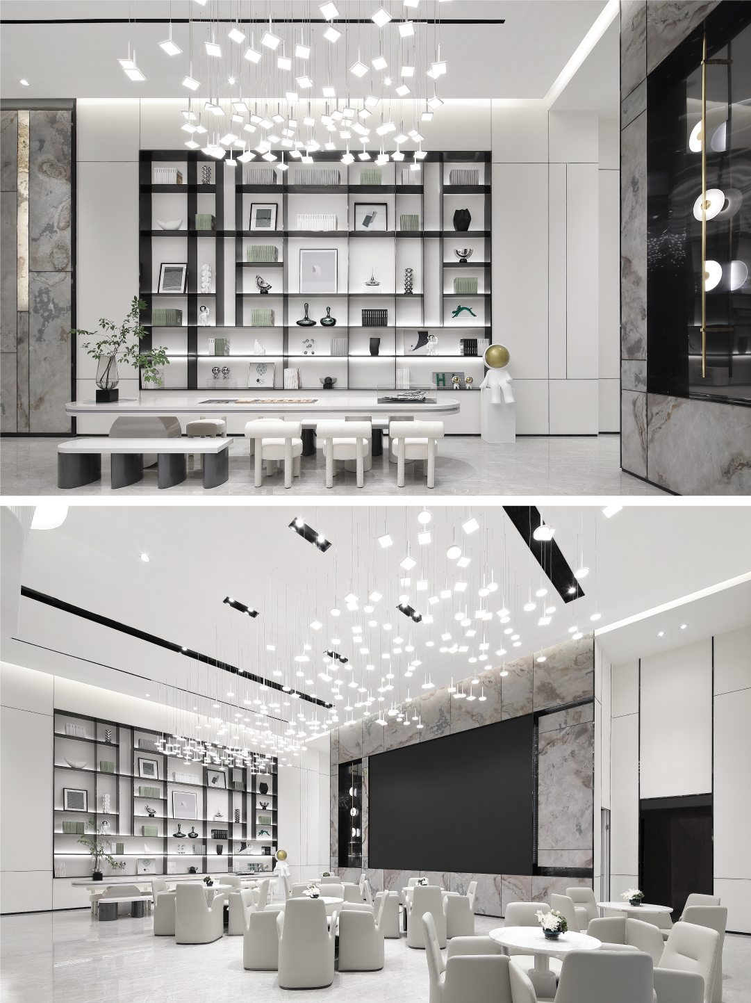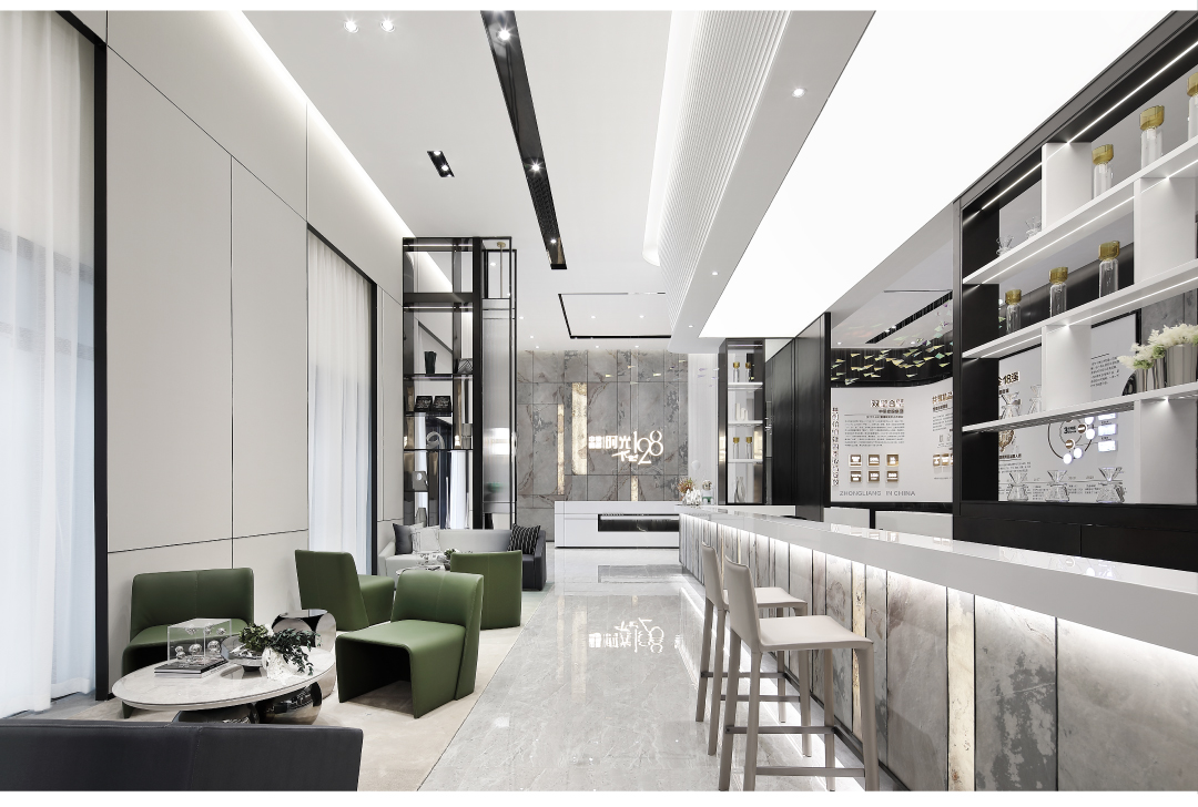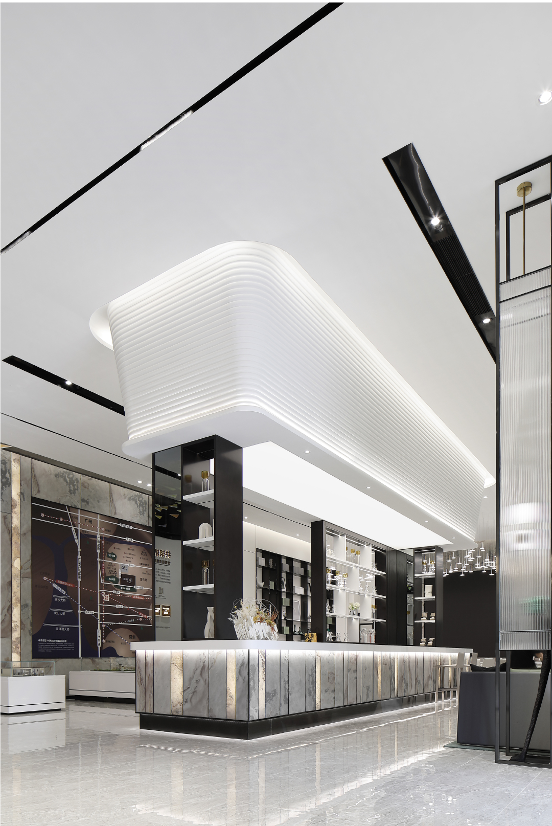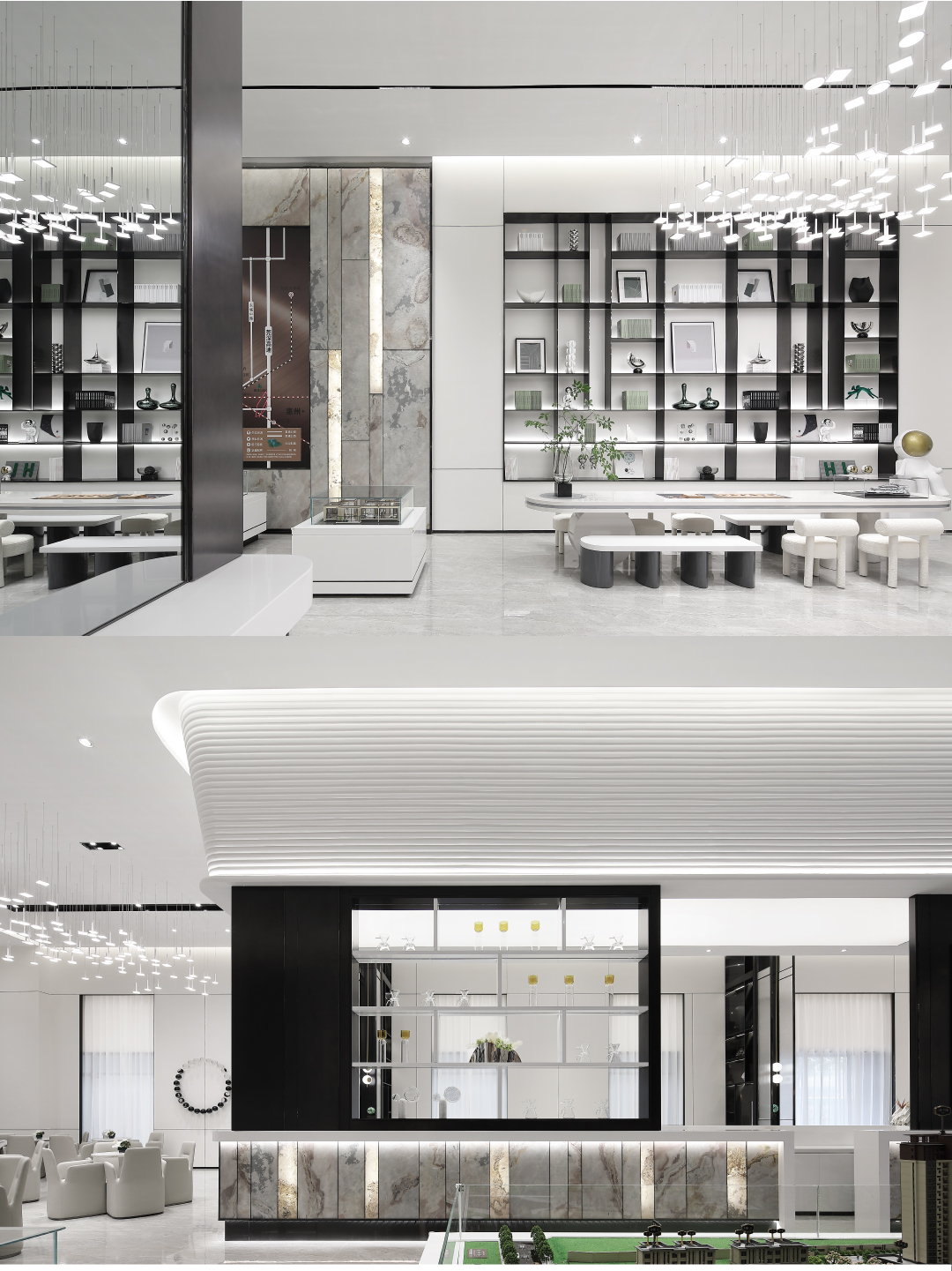 空间内大面积的白由人造石、壁布、烤漆板组成,环保可再生资源。作为临展性质的商业空间运用环保快捷的材料进行设计,搭配深色金属以及少量天然石材,增添空间多样性与品质感。