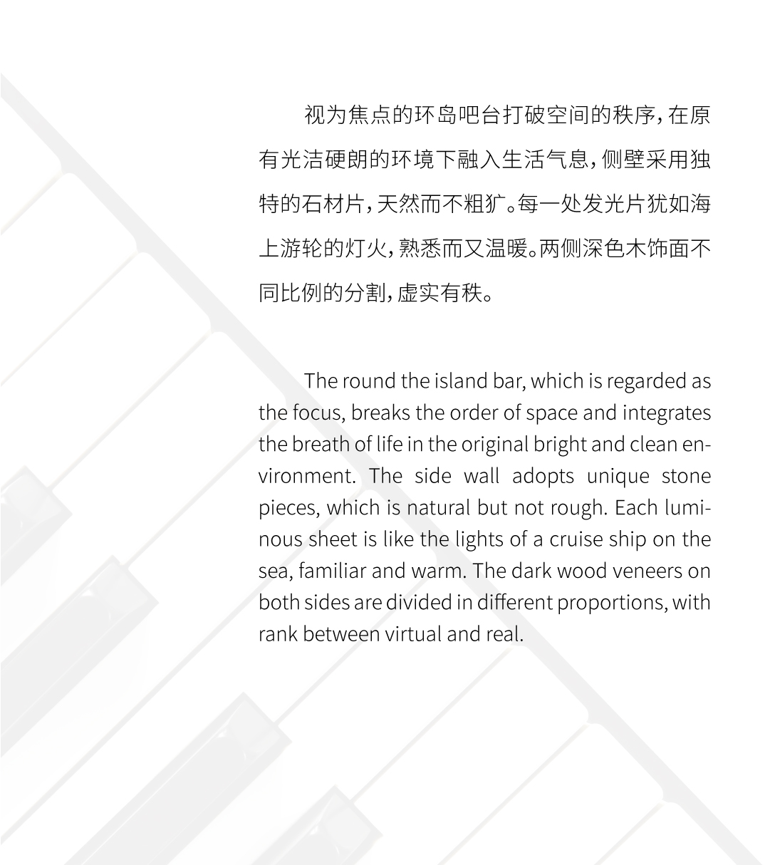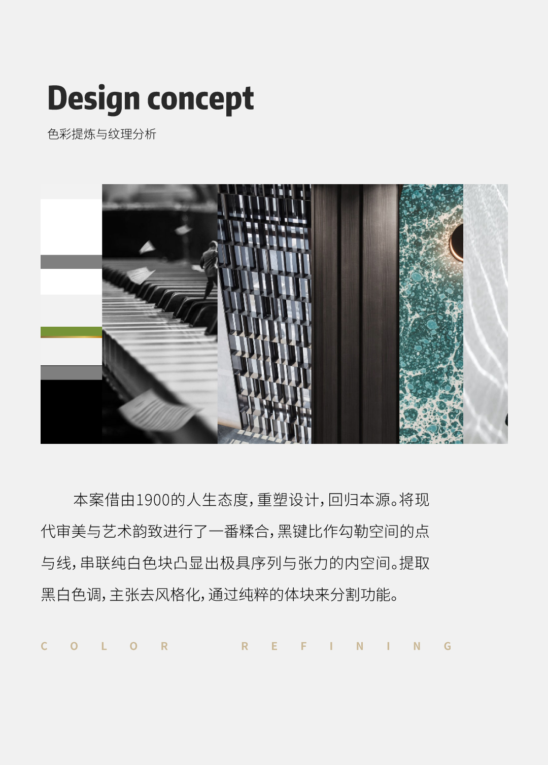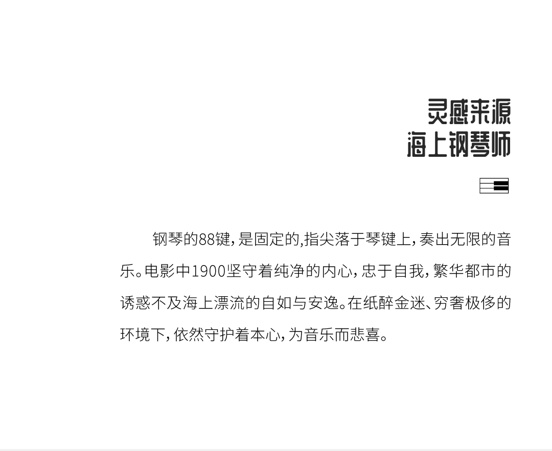 钢琴的88键,是固定的数字。指尖落于琴键上,却能弹奏出无限的音乐。电影中1900坚守着纯净的内心,忠于自我,繁华都市的诱惑不及海上漂流的自如与安逸。在纸醉金迷、穷奢极侈的环境下,依然守护着本心,为音乐而悲喜。借由1900的人生态度,重塑设计,回归本源。将黑键比作勾勒空间的点与线,串联纯白色块凸显出极具序列与张力的内空间。提取黑白色调,主张去风格化,通过纯粹的体块来分割功能。