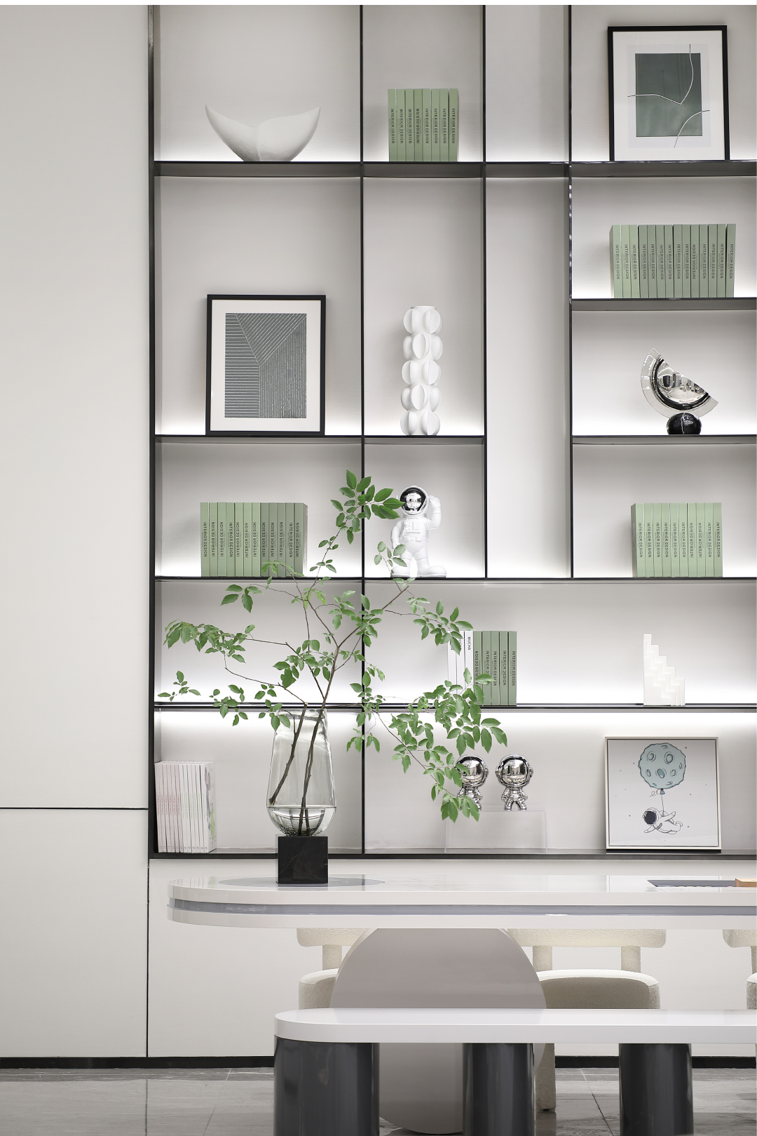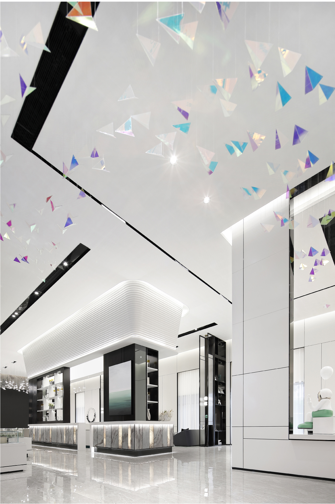 从主入口五光十色的“纸飞机”化作指挥官,指引着参观者来到属于自己的舒适圈。空间的白似是一张张白纸,等待需要的人画上故事。直线与折线划分出空间功能,大胆运用纯色材质搭配金属线条,勾勒细节弱化单色的干枯感。挑台的递进,艺术品的互动,为空间带来雀跃的生命力。作为焦点的环岛吧台打破空间的秩序,在原有光洁硬朗的环境下融入生活气息,侧壁采用独特的石材片,天然而不粗犷。布局将洽谈区与儿童书吧合并,延伸空间同时增添一份童趣与活力。