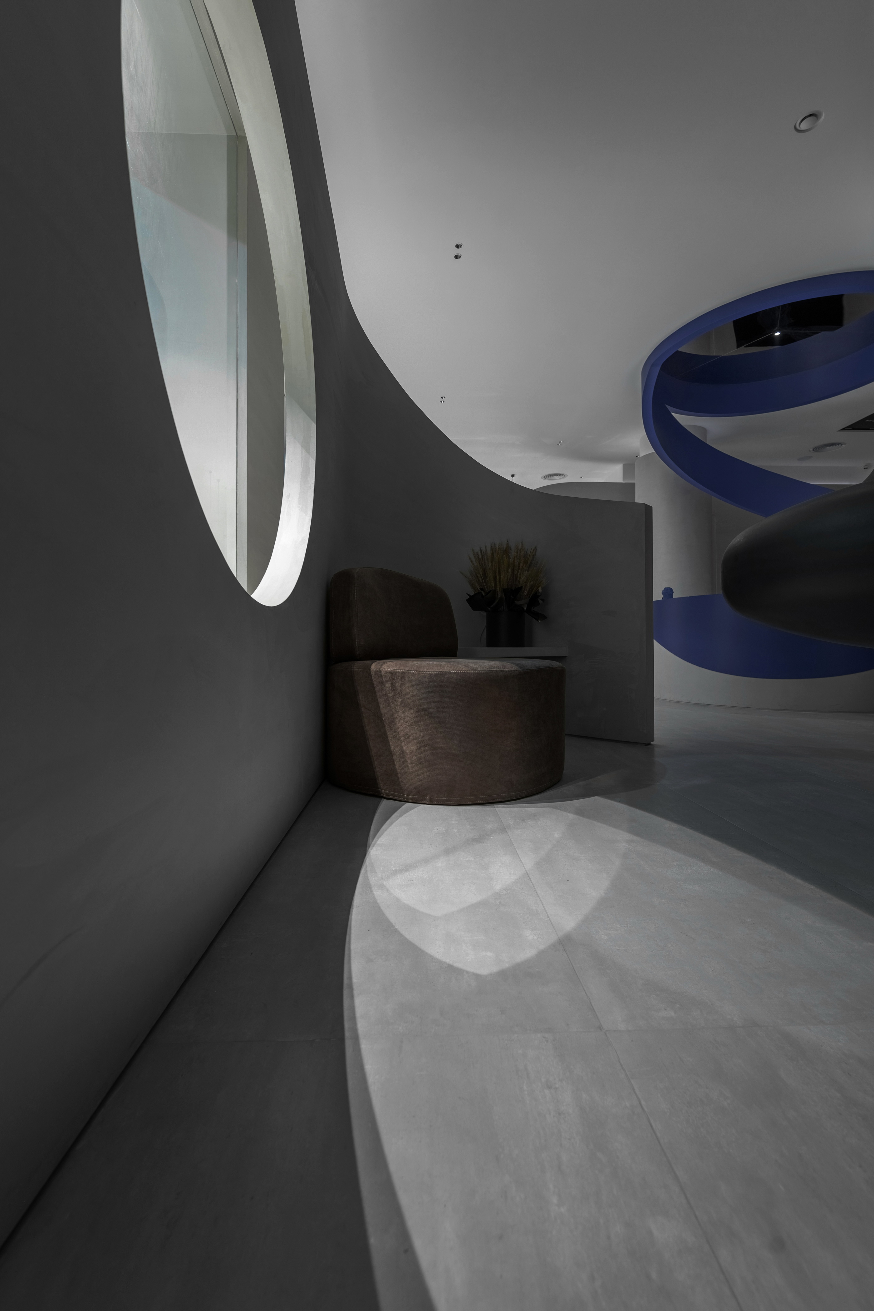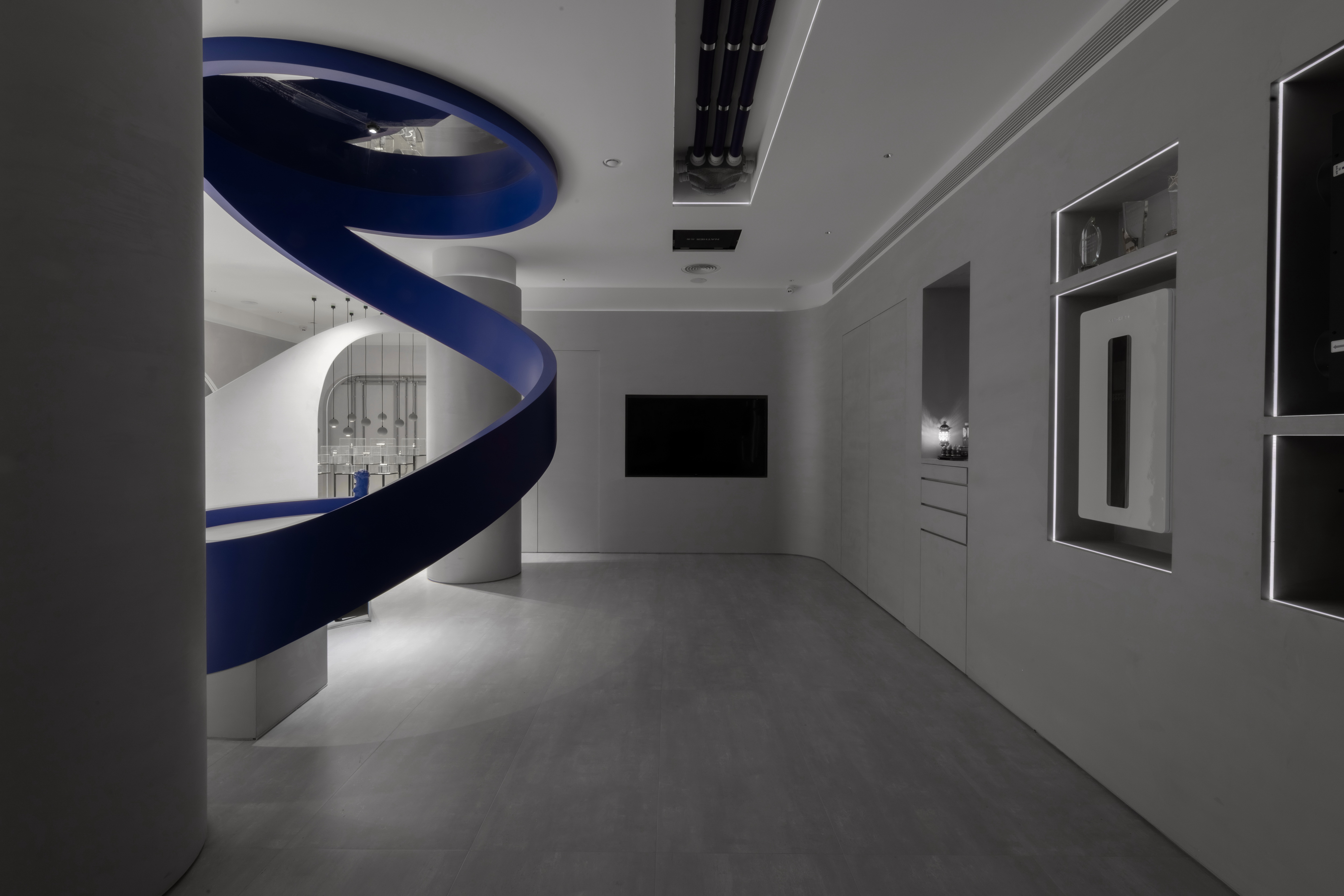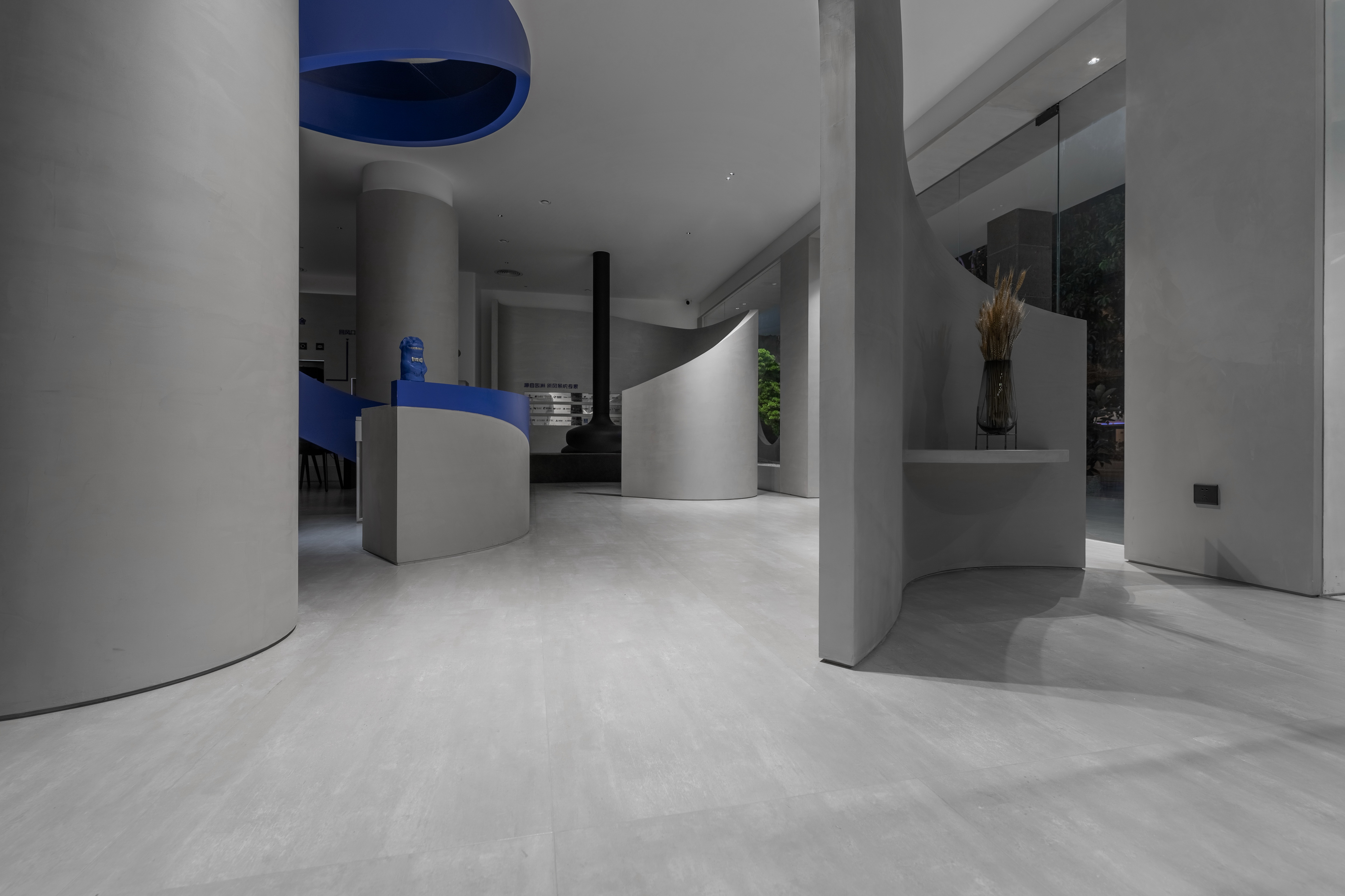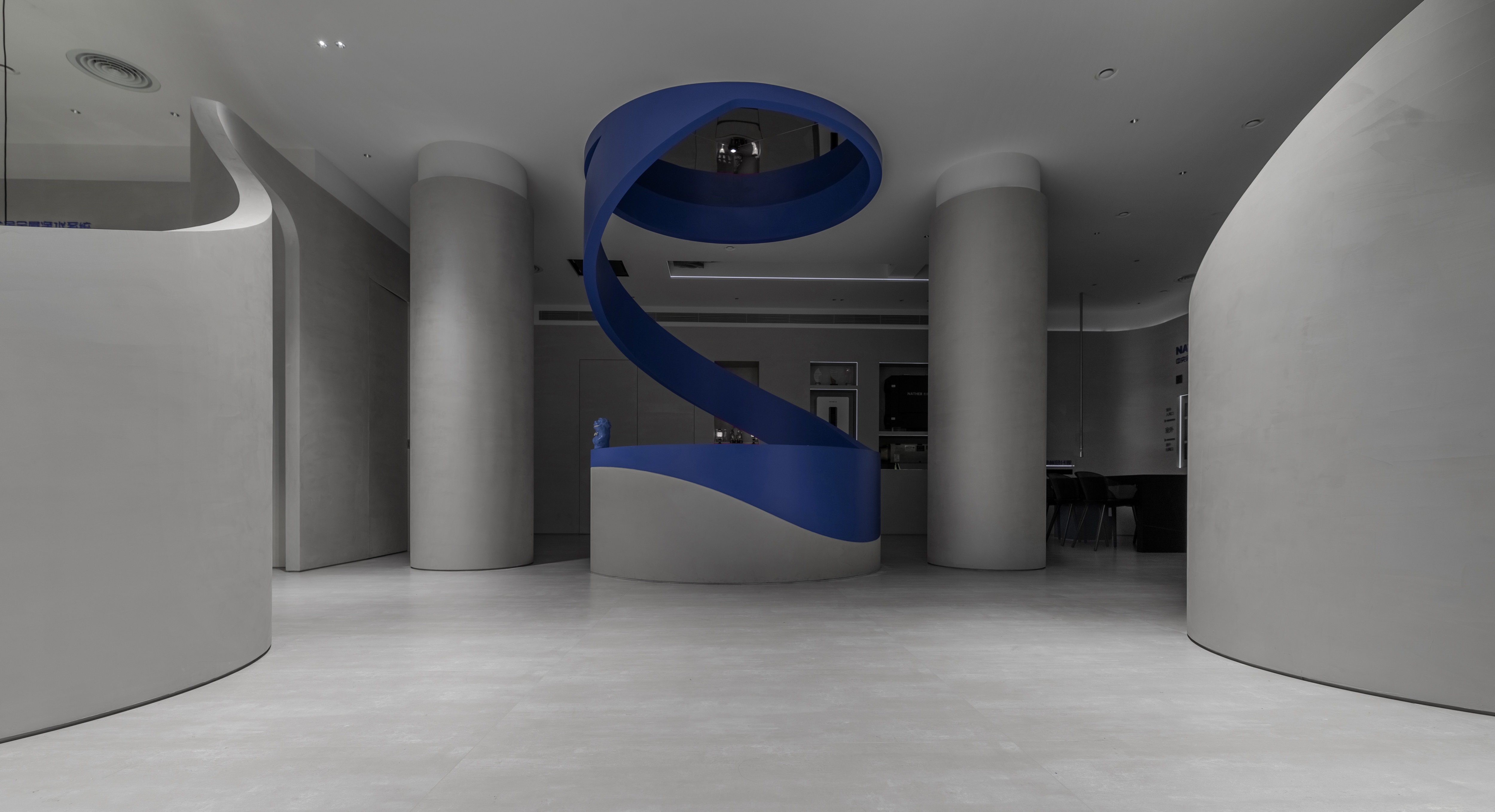 随着信息化传播的扁平化,人们的视觉越发变的“挑剔”起来,对于“抽象”越发喜爱,为此入户接待区,我们以“龙卷风”的形式呈现,以先扬后抑引人窥视和遐想的方式,展现出独特的形态,创造出一种具有媒介特质的界面和交流空间,让人耳目一新。与周边灰色空间包裹体形成对比,沉静不失跳跃,冷静与炽烈在这里统一,让人期待空间的进一步展示。同时对应了龙源建材的公司名并用此LOGO的蓝色衬托成为整个空间的主体,天花的镜面让风化为龙冲顶而上,扶摇直上。