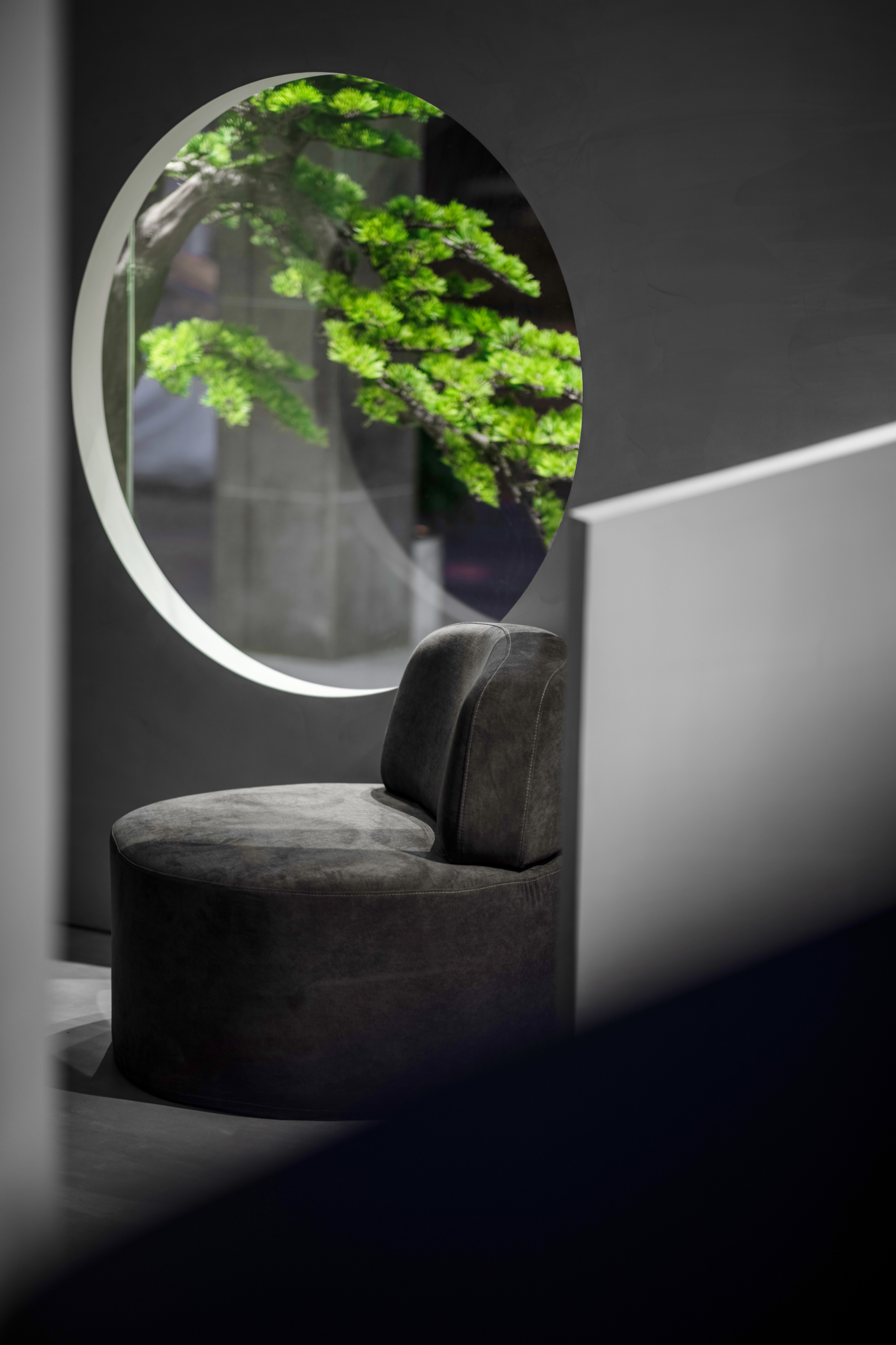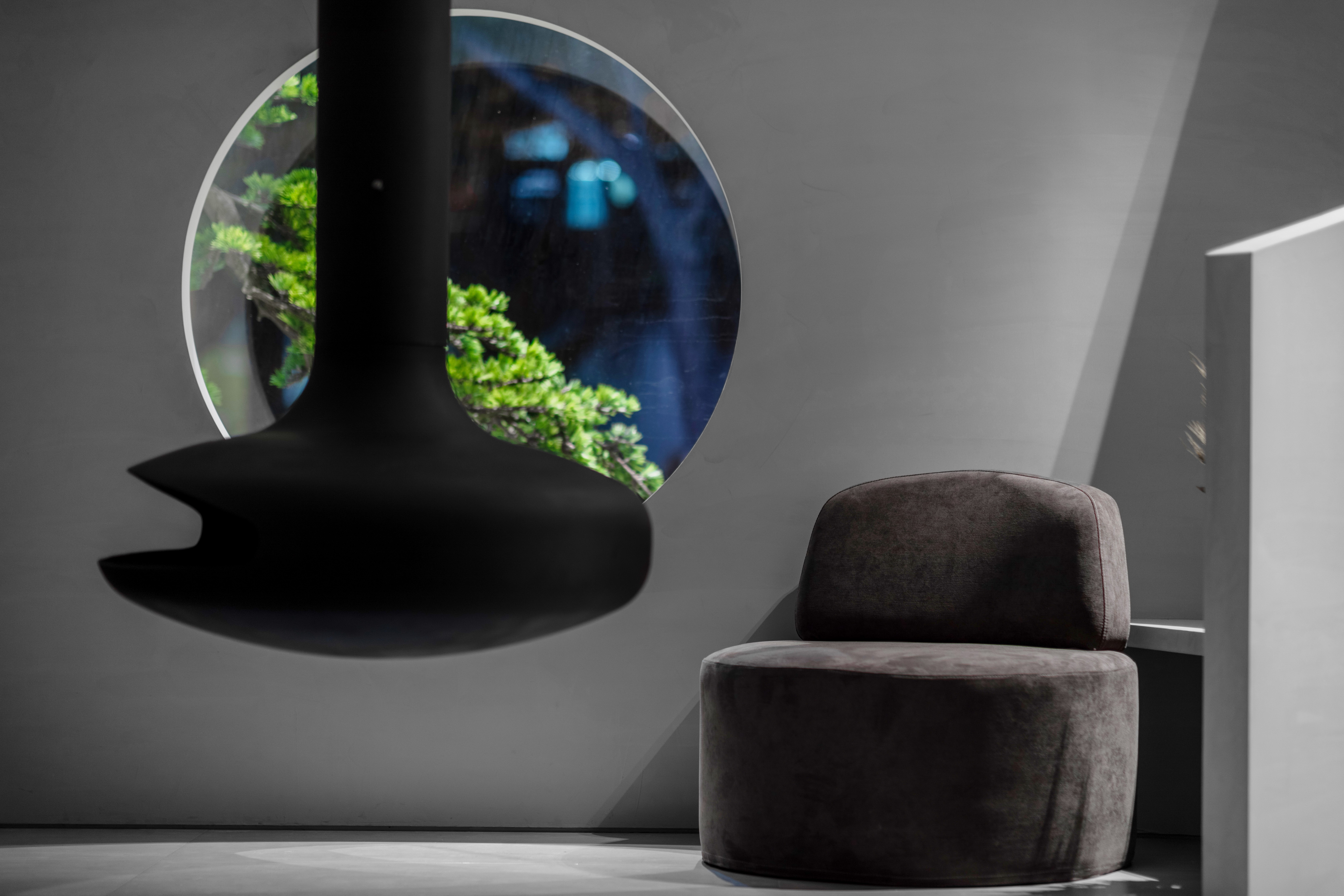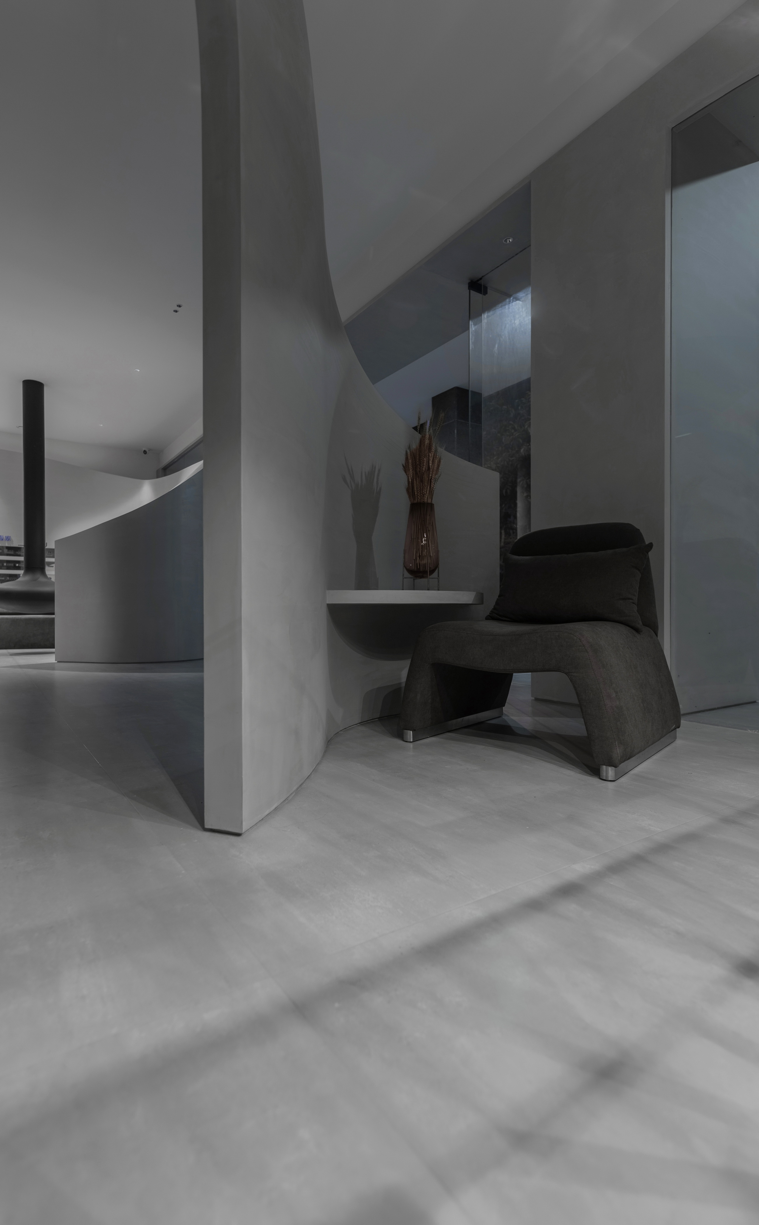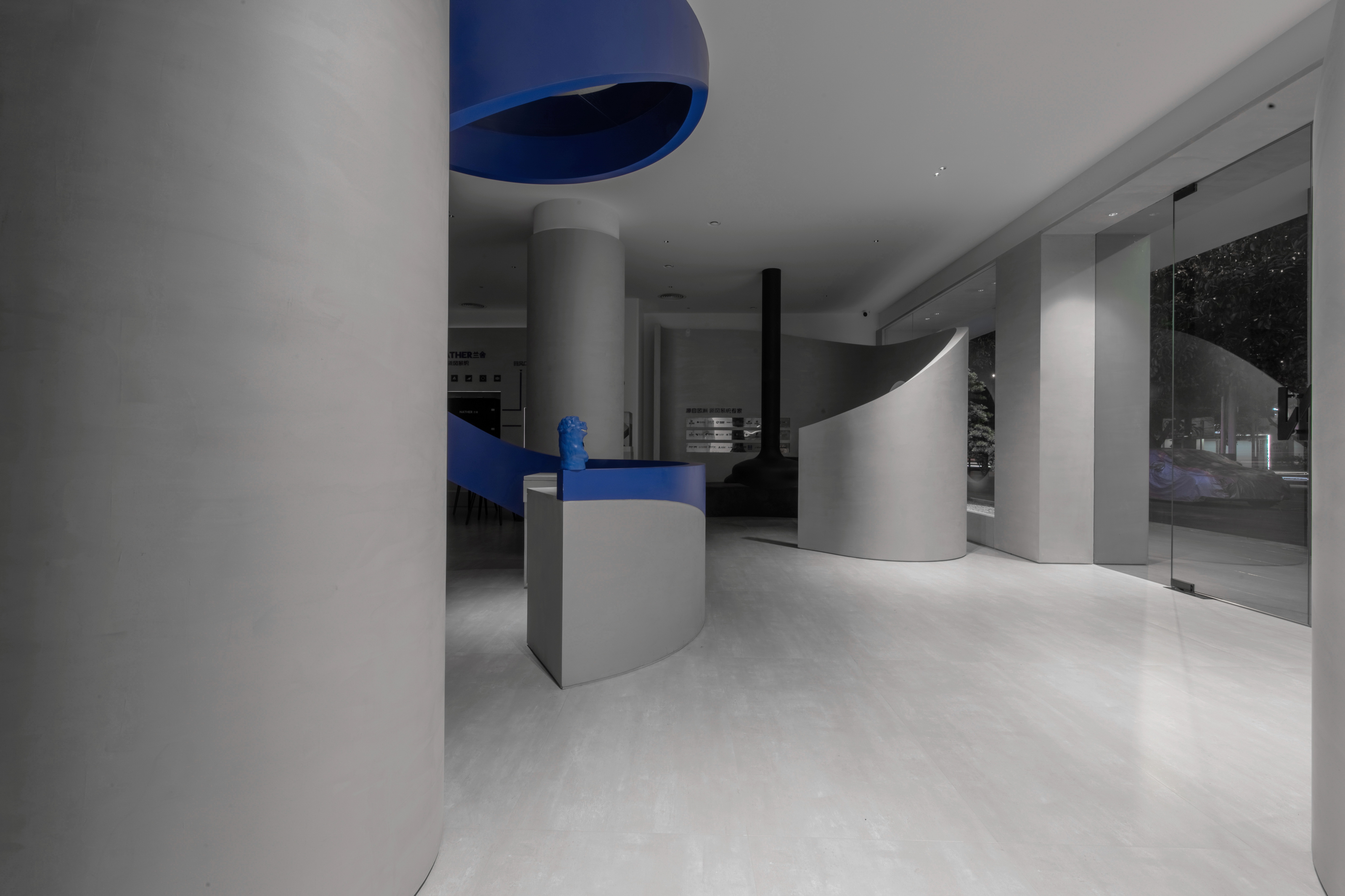 在此展陈方式的构建下最简的表达无关于形式,单一水泥色为主基调足以展现空间,风与水化为柔美的曲线贯穿整个空间,高低参差的表达更是打破传统注入新流,空间不同,高低各异,如此不仅让各区域互通又既有一定的私密性,同时则拉伸客户的视野使空间的体验感强化。