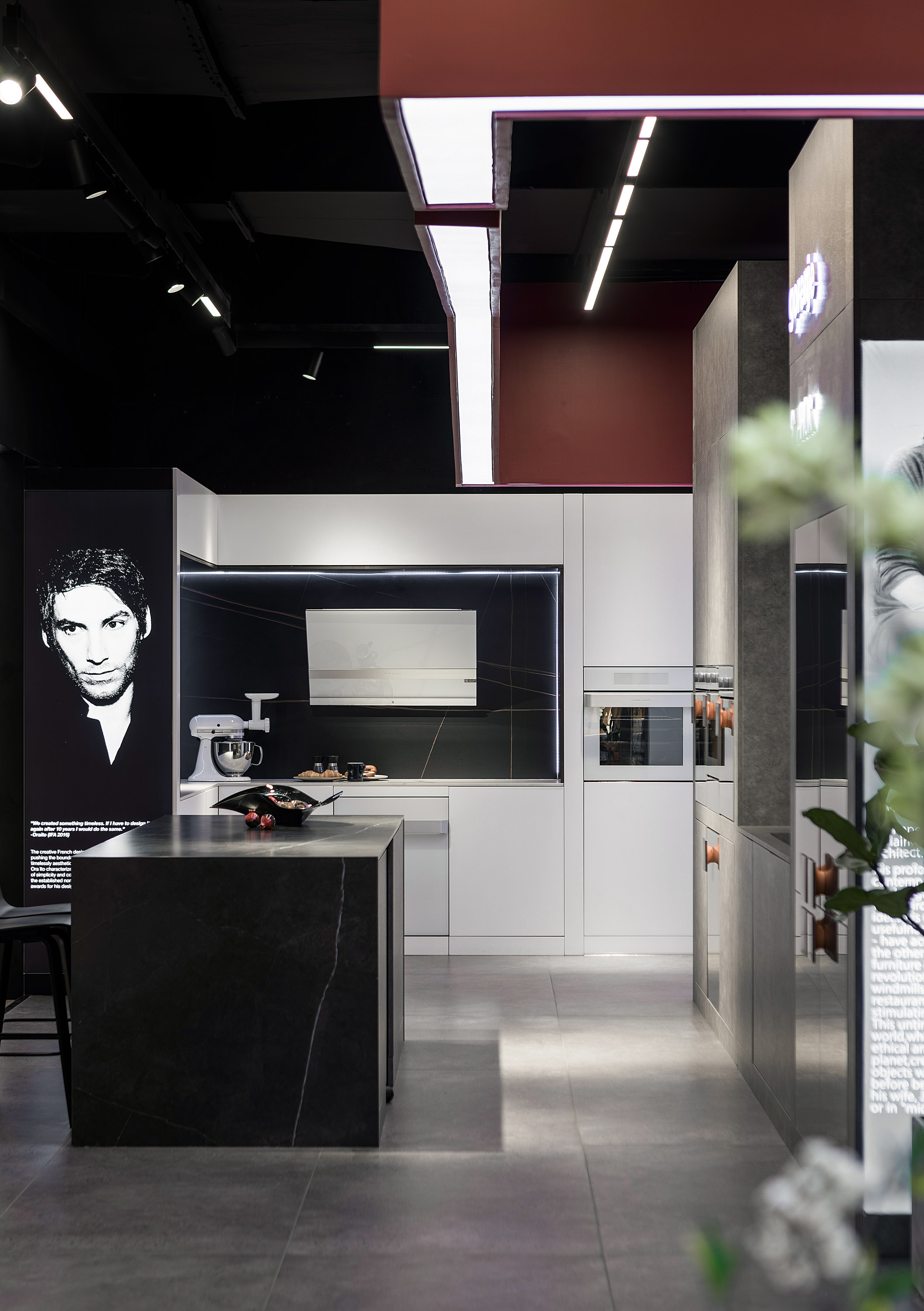 “飘带”起起伏伏,轻盈而浪漫,激活了灰调空间。在形式上也把两个独立的档口,变成一个有机的整体展厅。