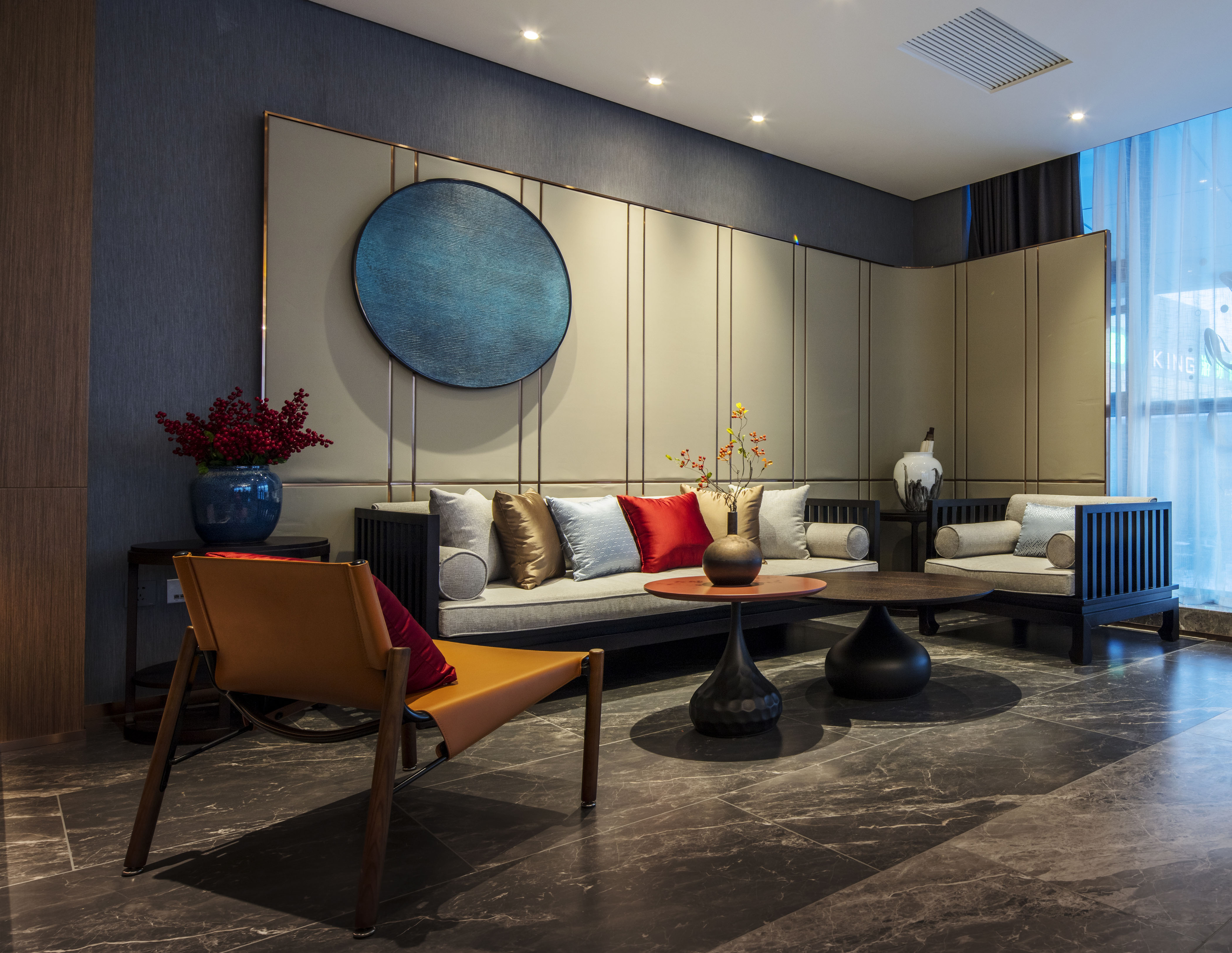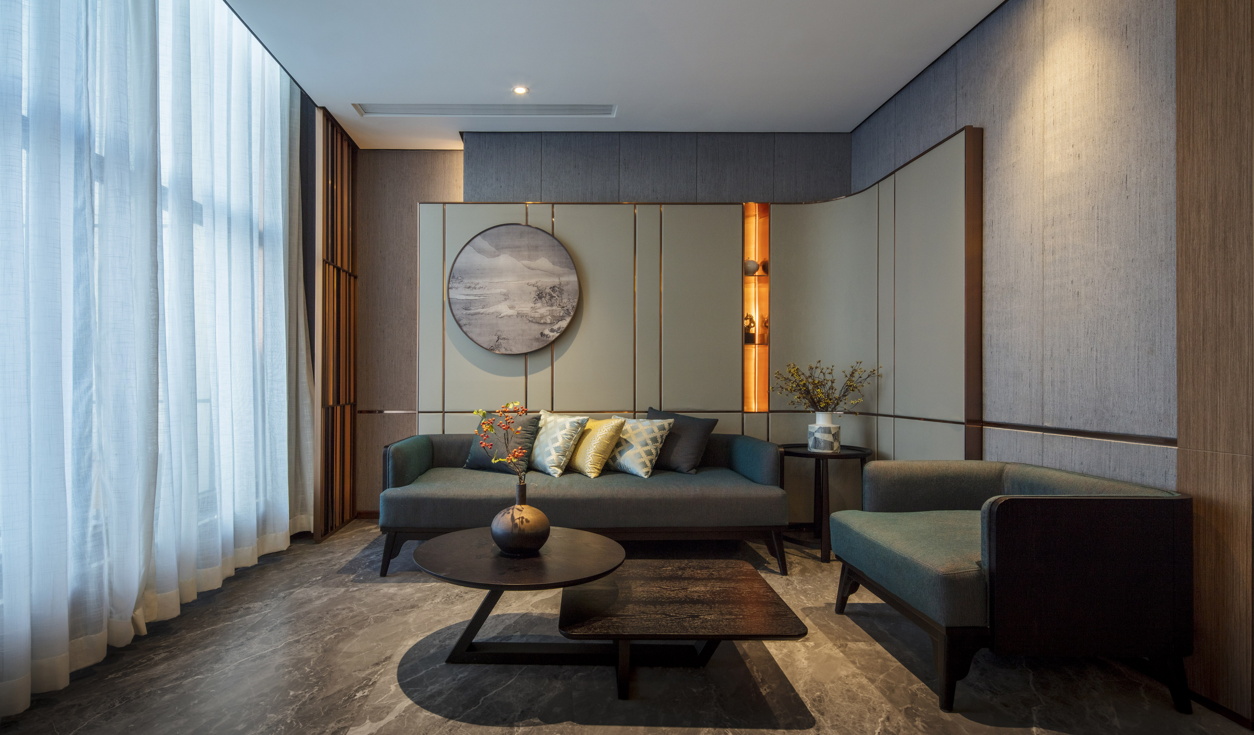 设计选材:空间内大量运用金属玻璃屏风的艺术表达形式,又让空间多了几分现代感的精致之美,华而不俗。设计选材,墙面选用暖色粗麻和真丝壁布硬包,木饰面选用温润的胡桃木,再配以古铜色金属板镶嵌造型,运用去繁化简的手法,延续东方文化的历史文化底蕴,将传统与当代在方寸之间相融,呈现东方情韵。