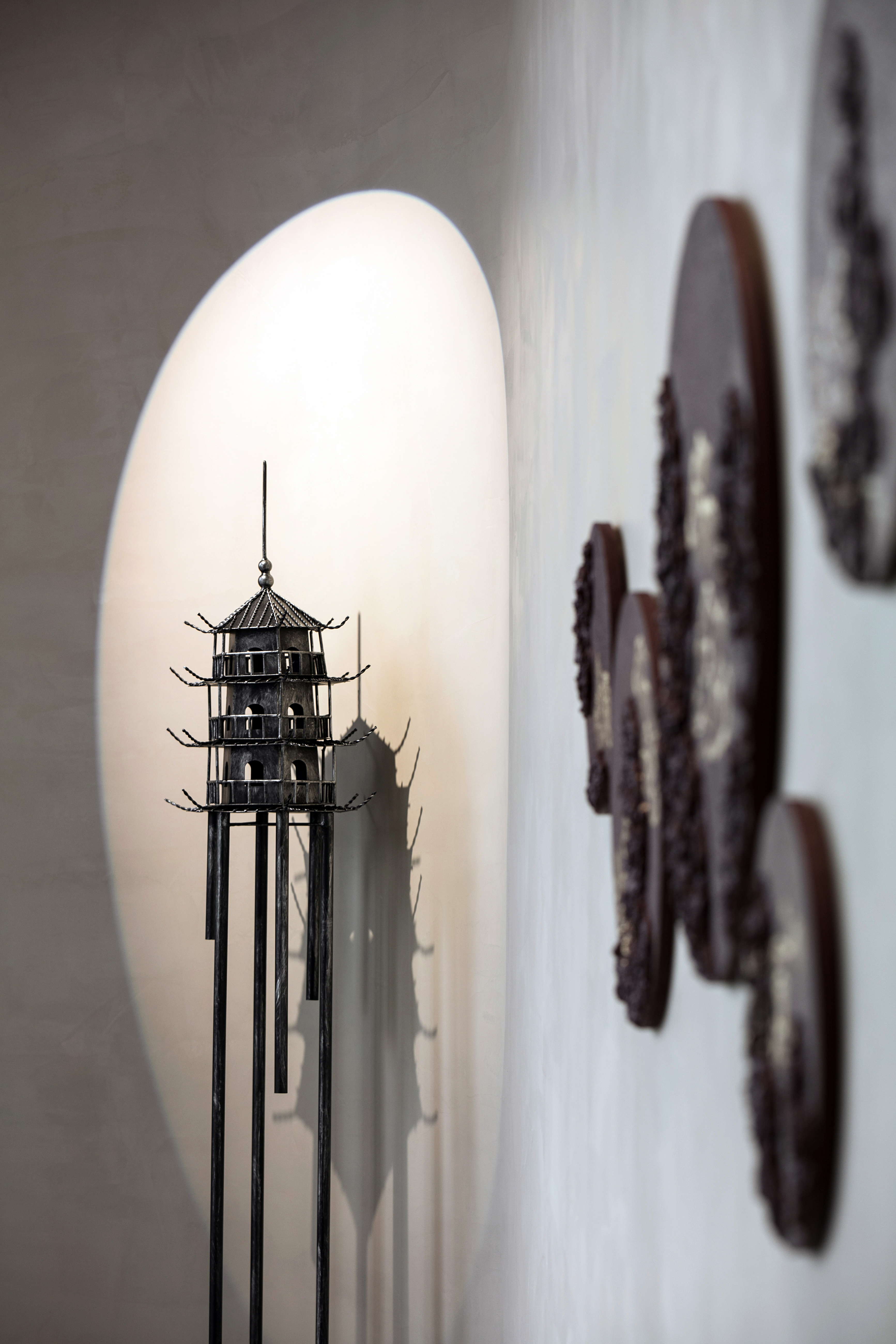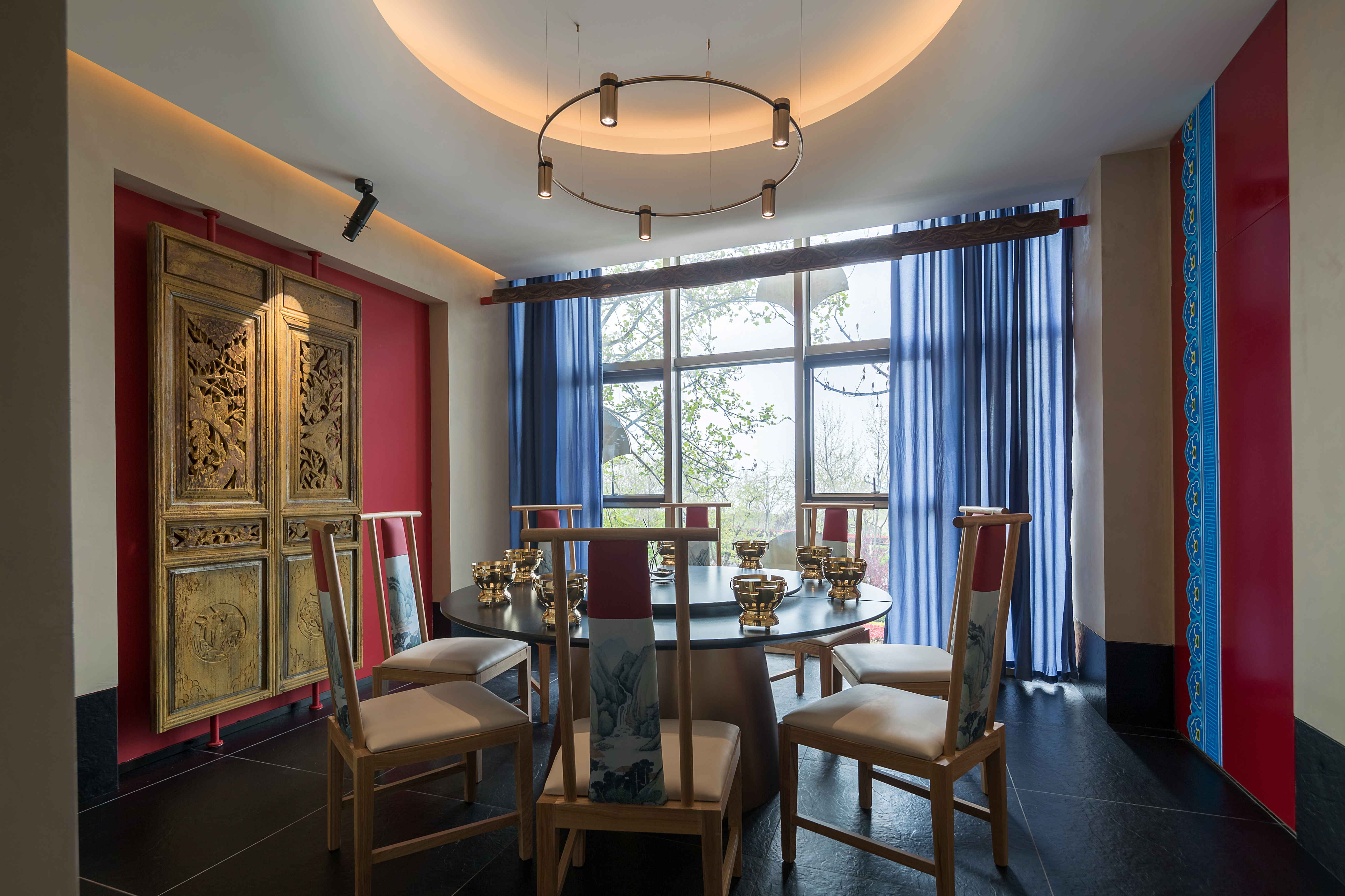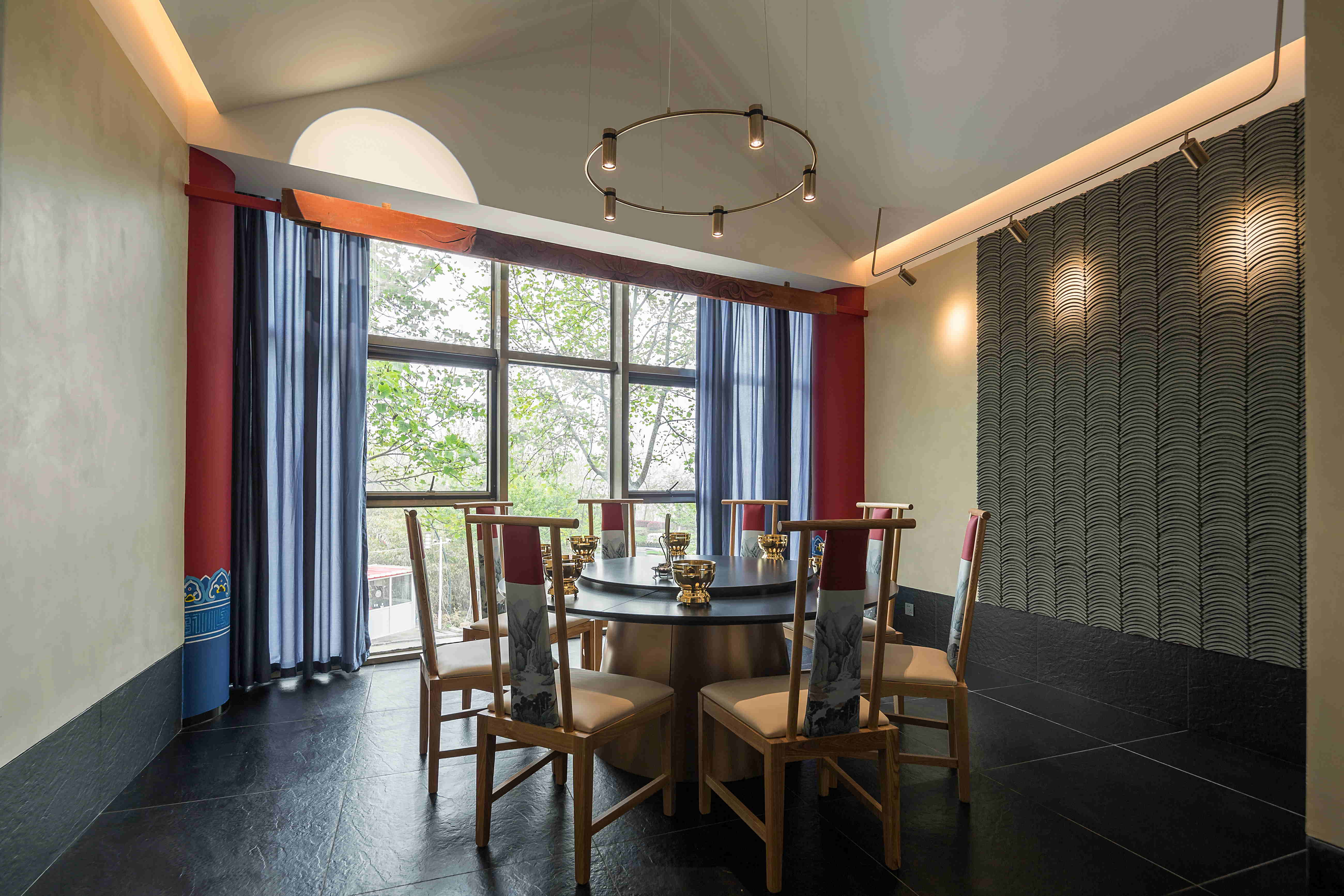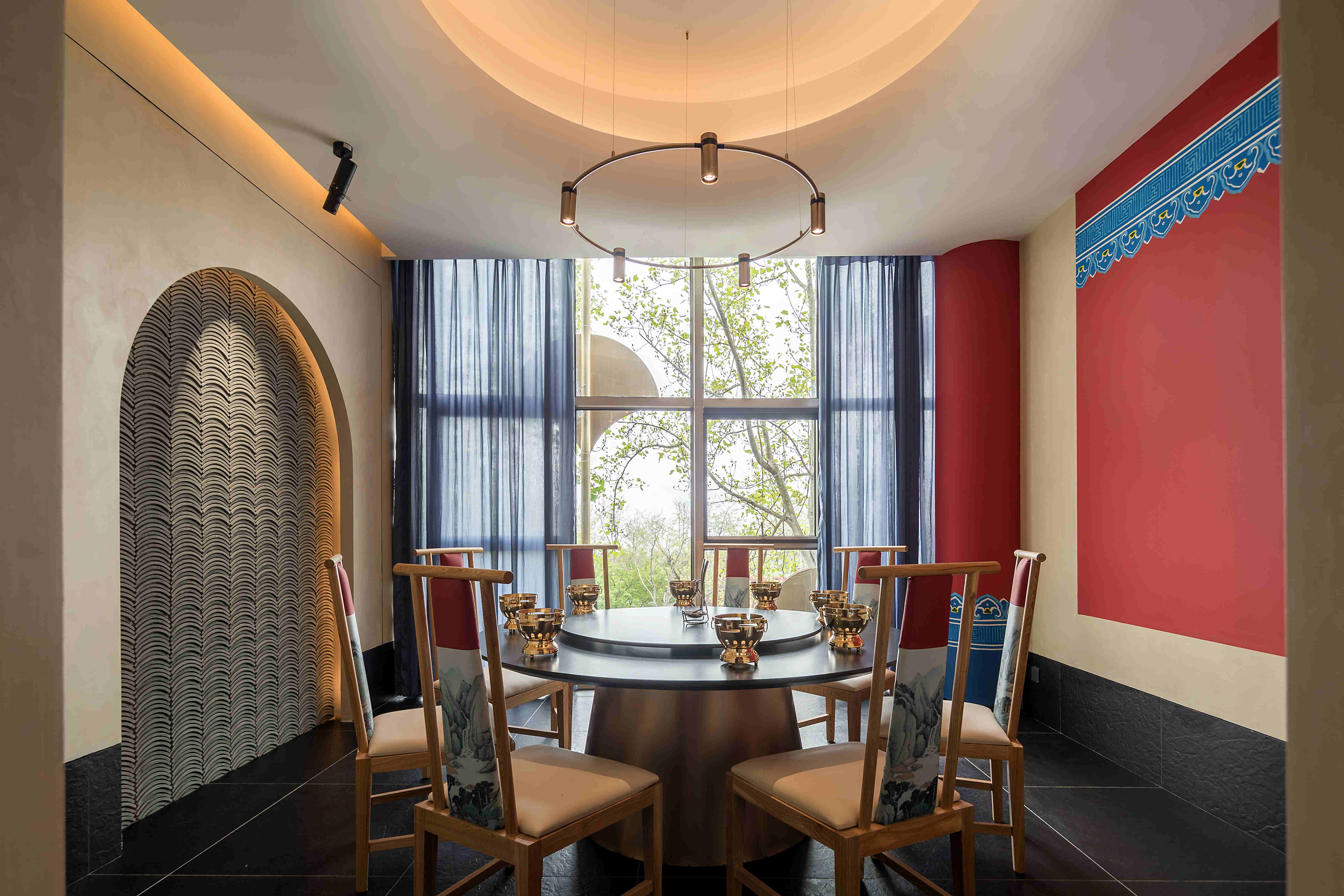 圆形上凹的顶面,拱形的墙面造型,瓦片的装饰辅以来自木府的古建纹样,亦让房间别有一番丽江古城的异域风采