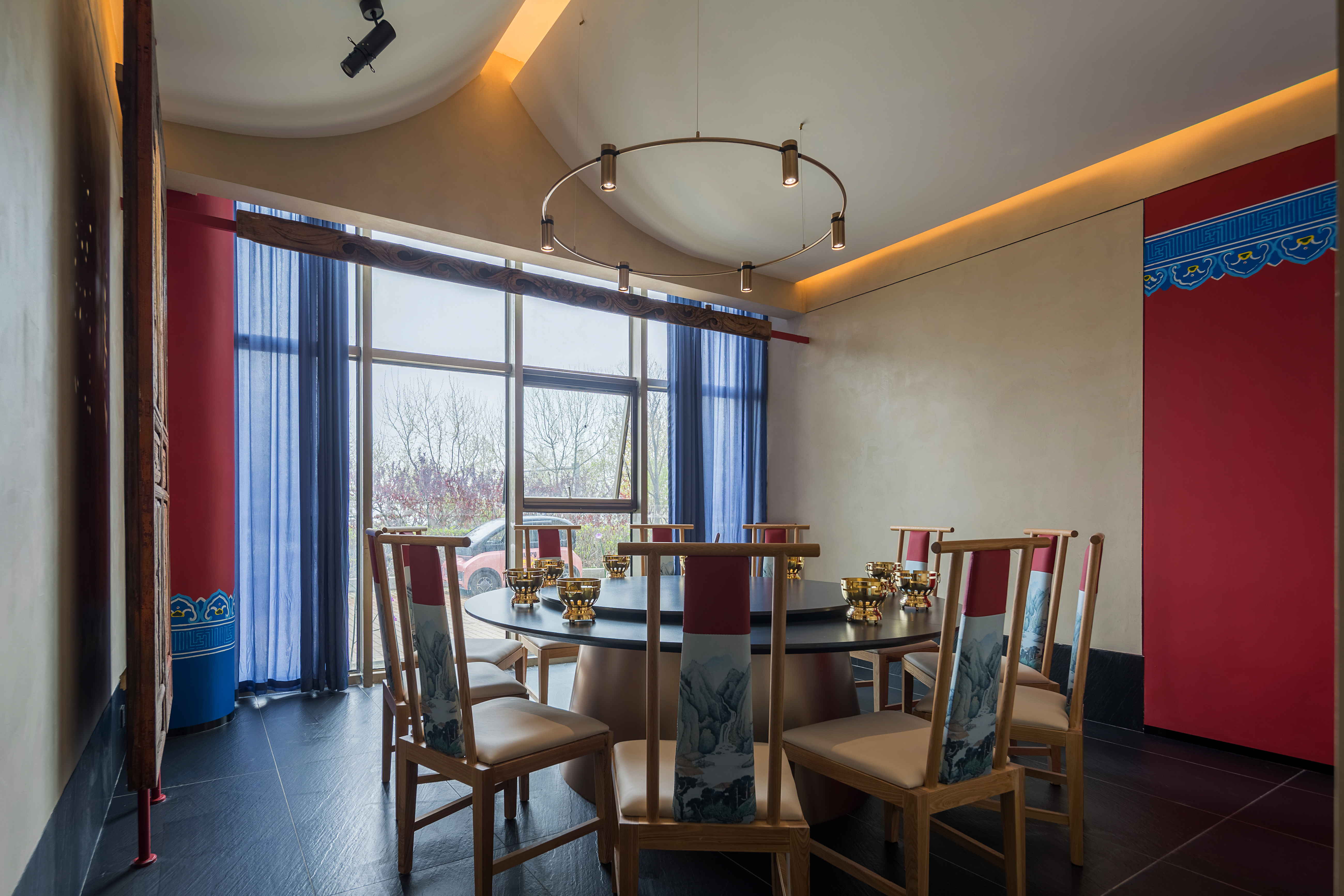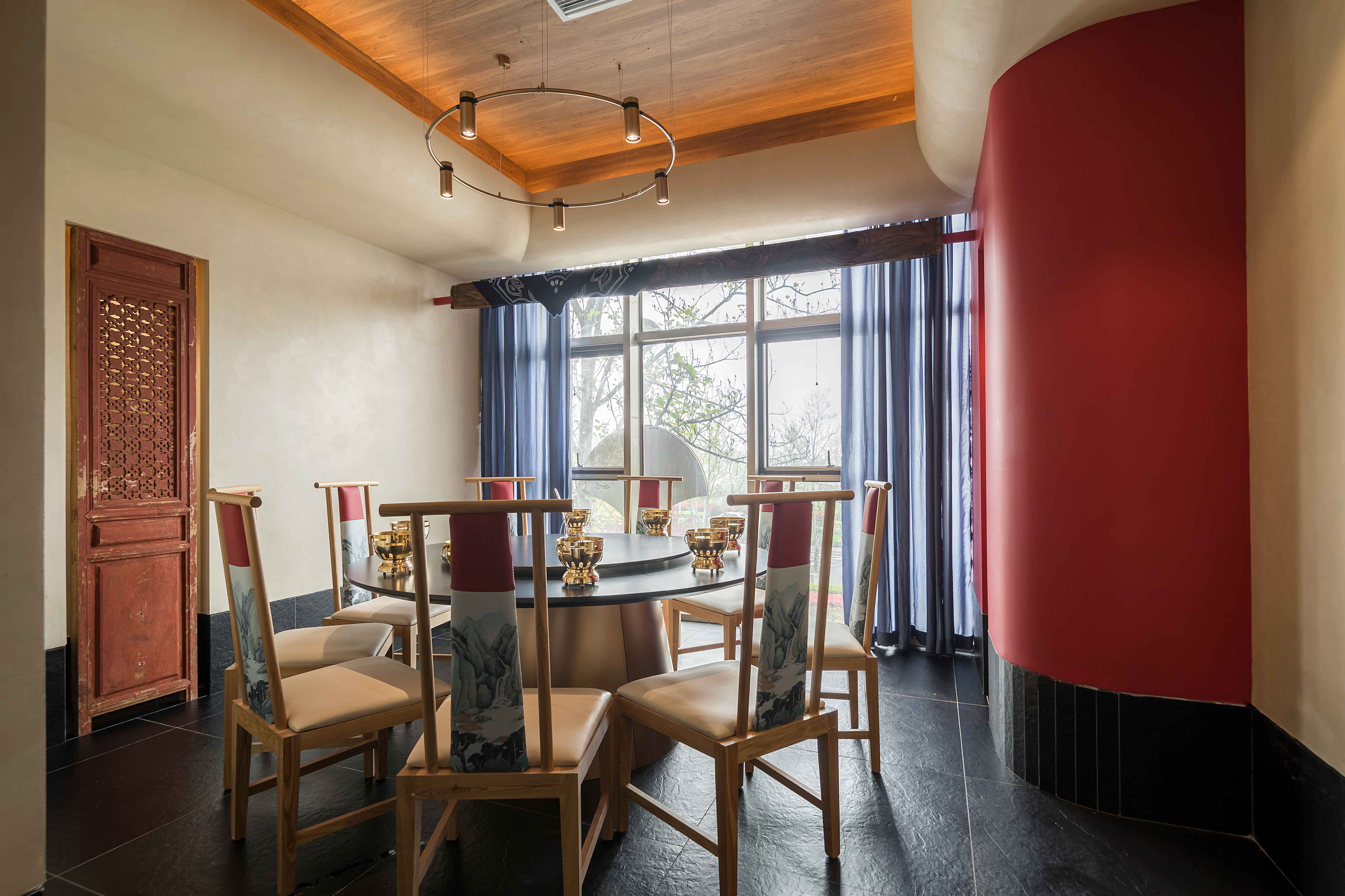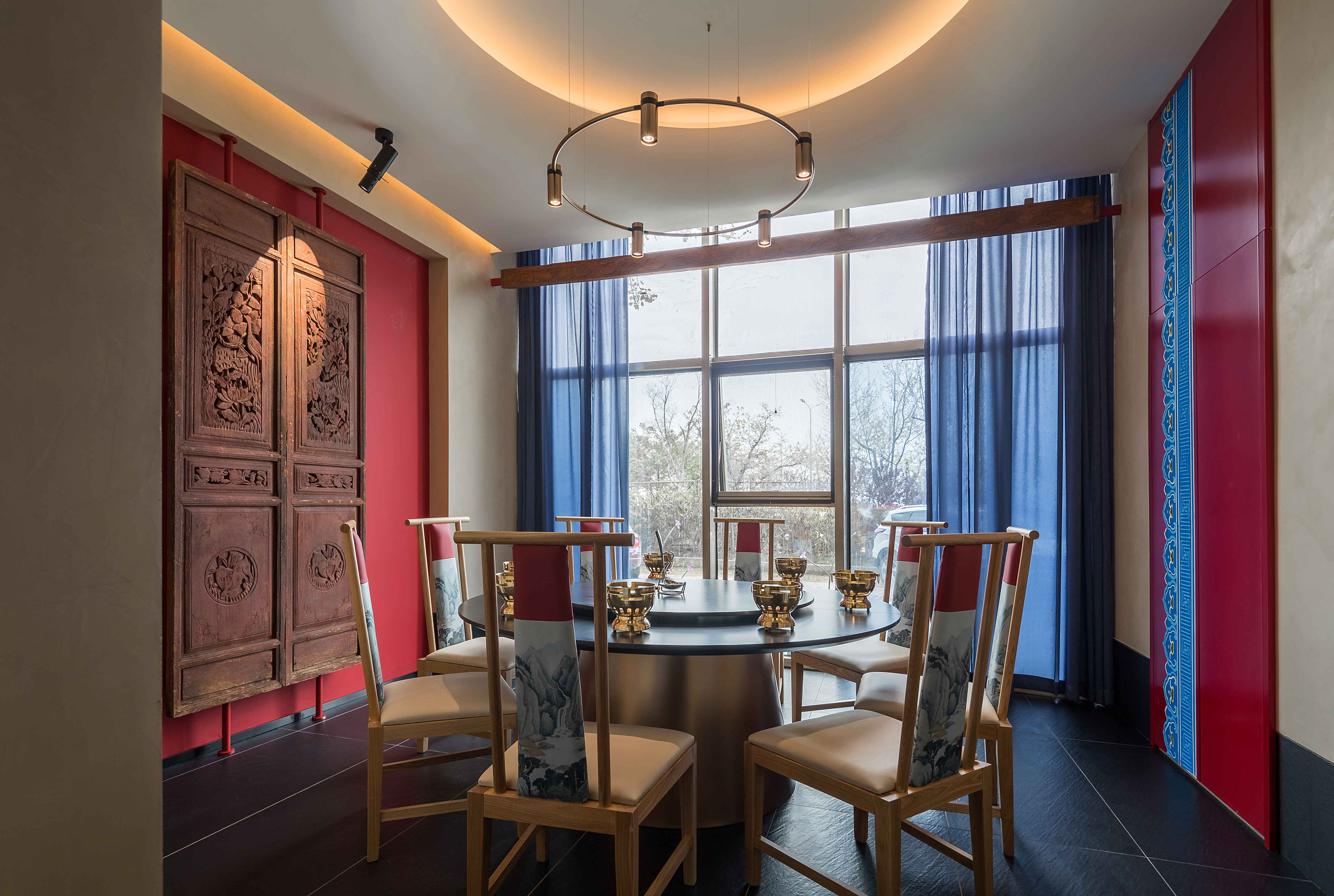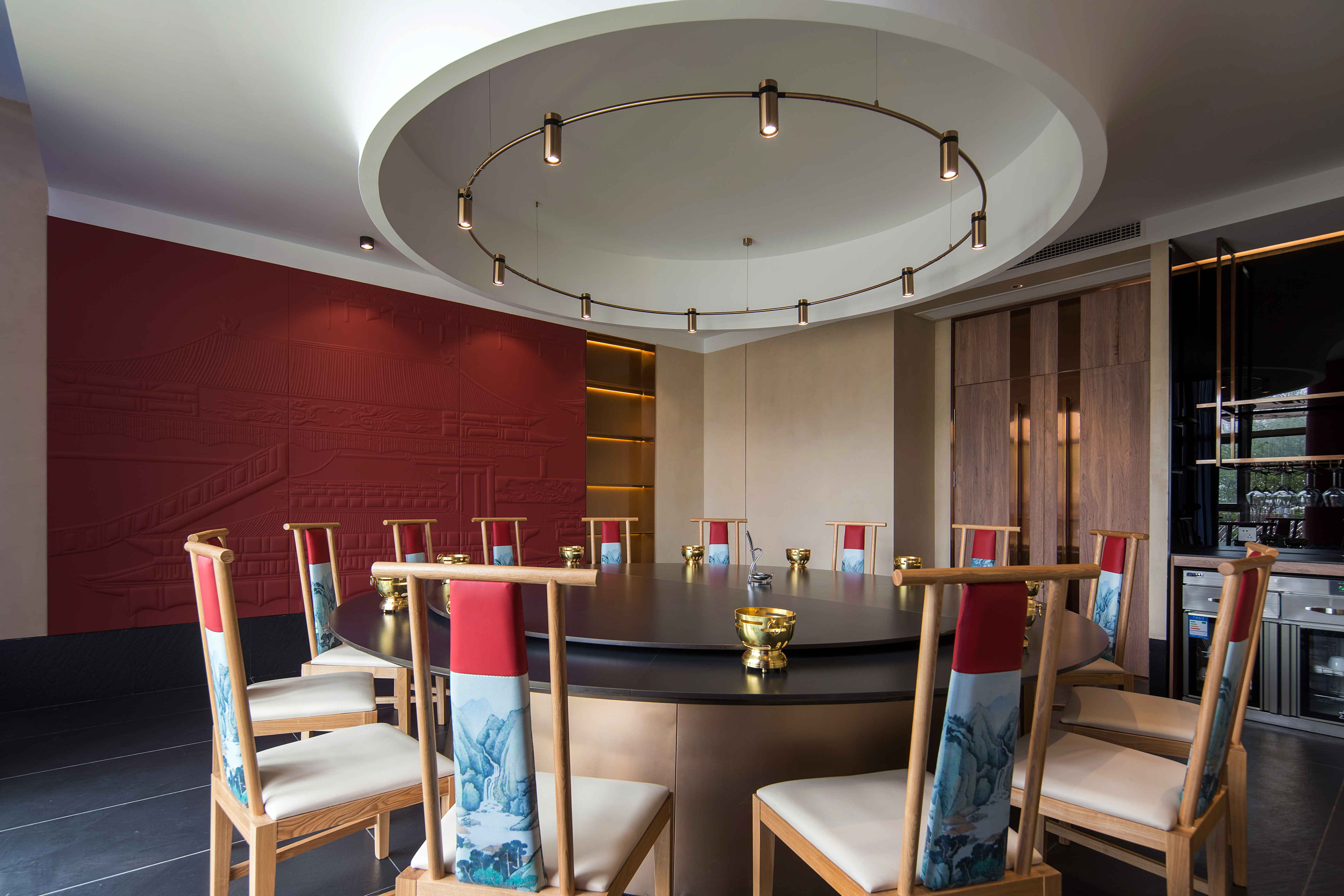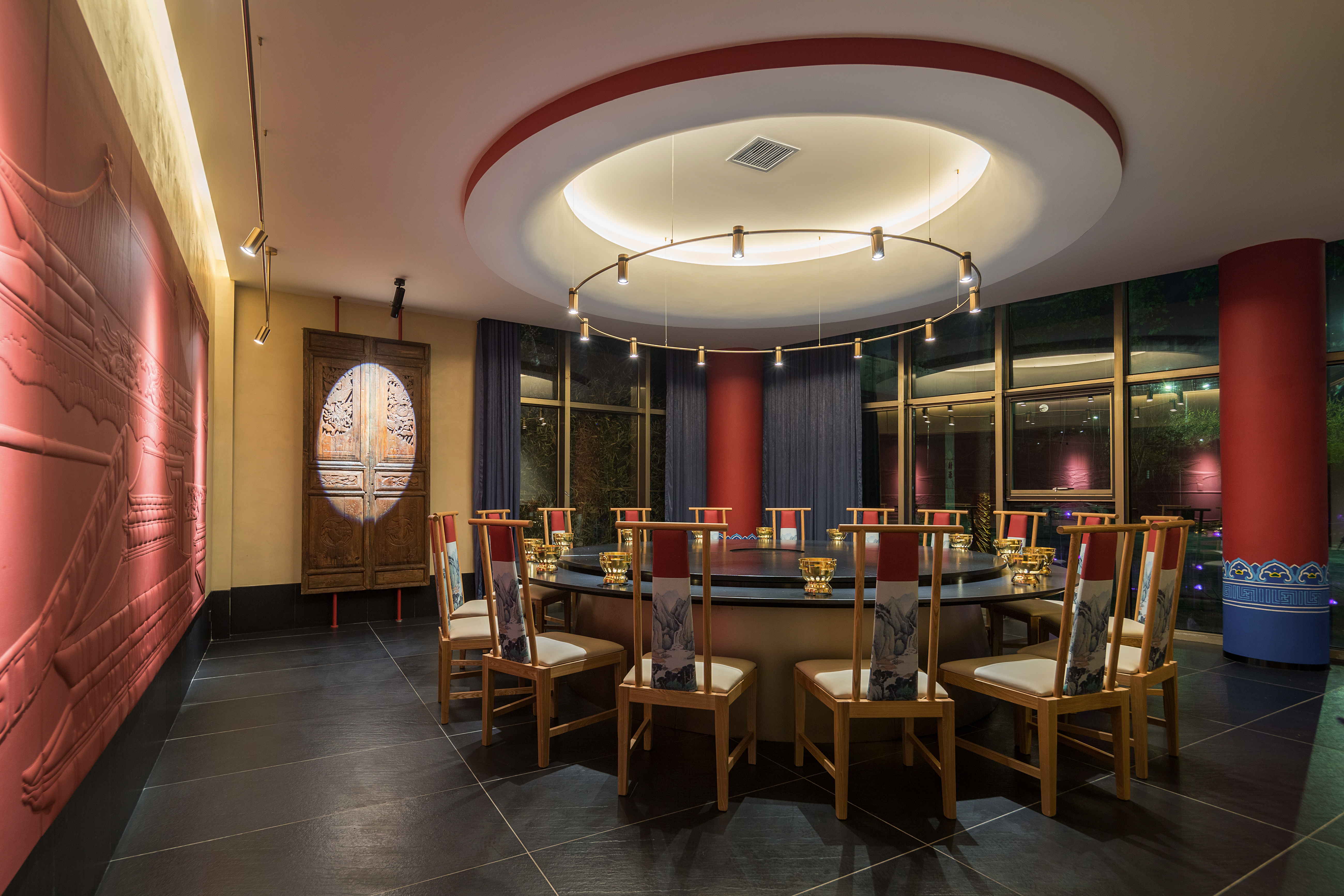 包间墙面以米色艺术漆为衬底,搭配暖白色灯光,营造更加舒适的就餐氛围。造型顶面与餐桌结构呼应,皮雕、圆顶、柱子色彩呼应,使空间变化中暗含统一,带有丽江古风纹样的老门板和墙面皮雕让空间更突出丽江特色。