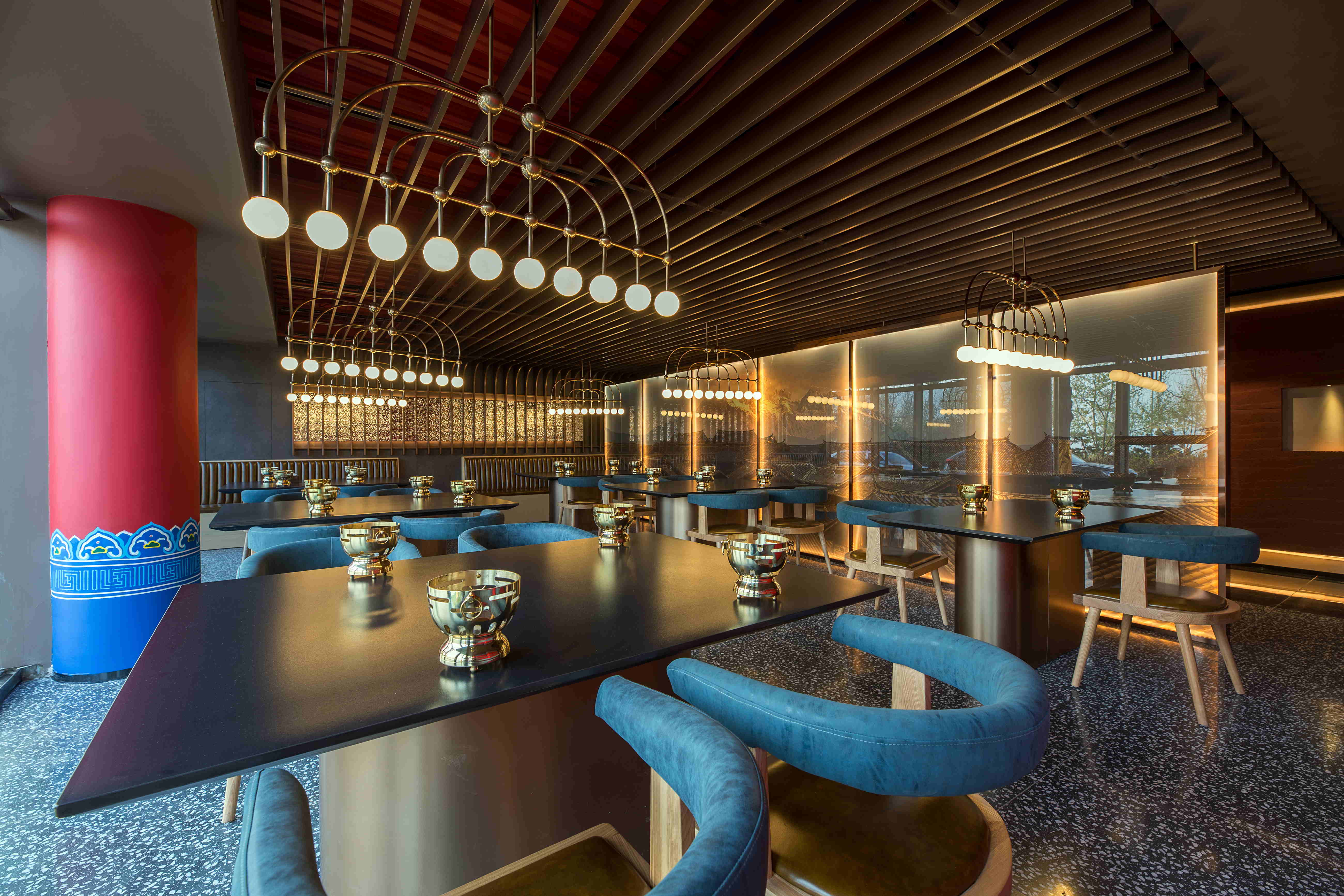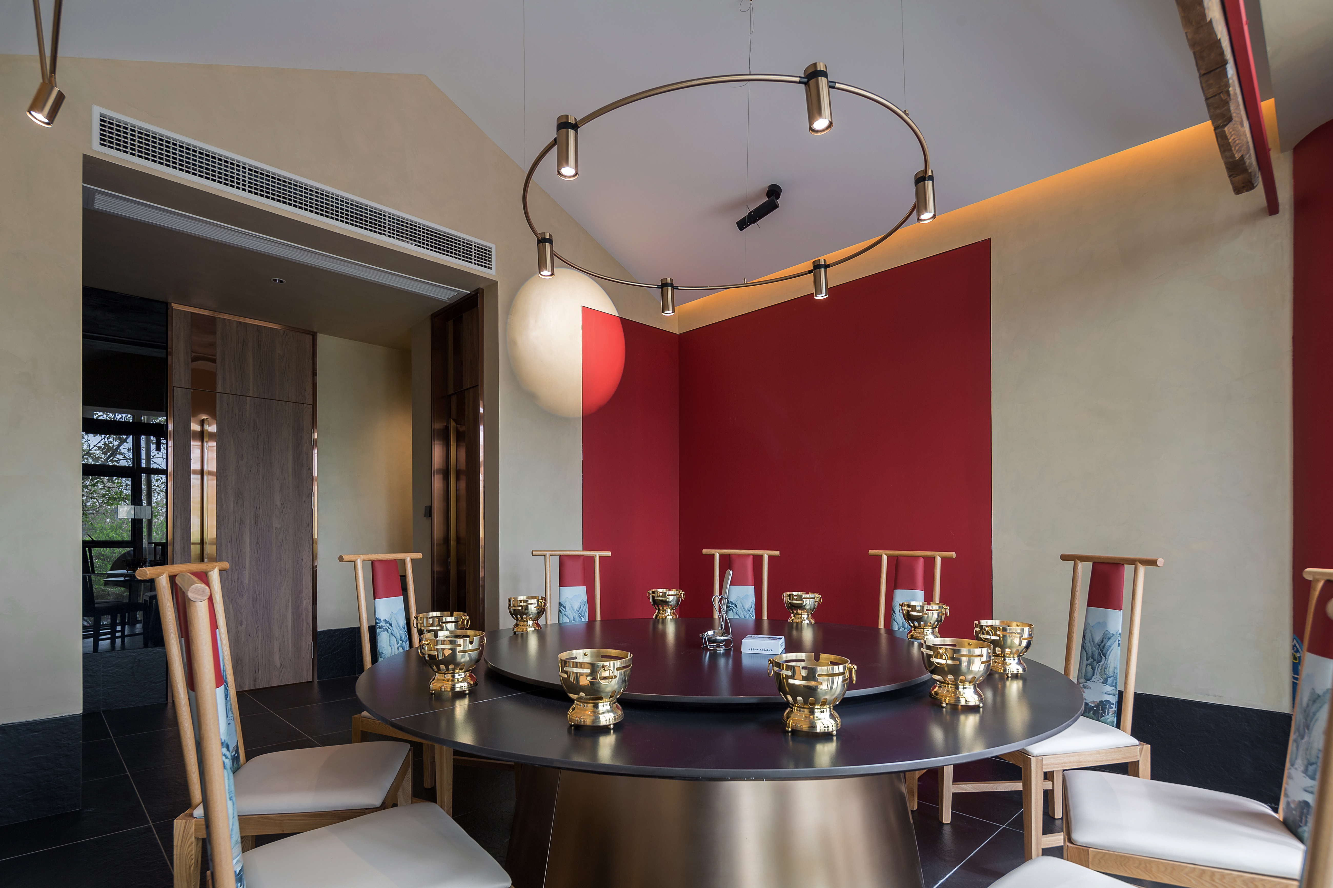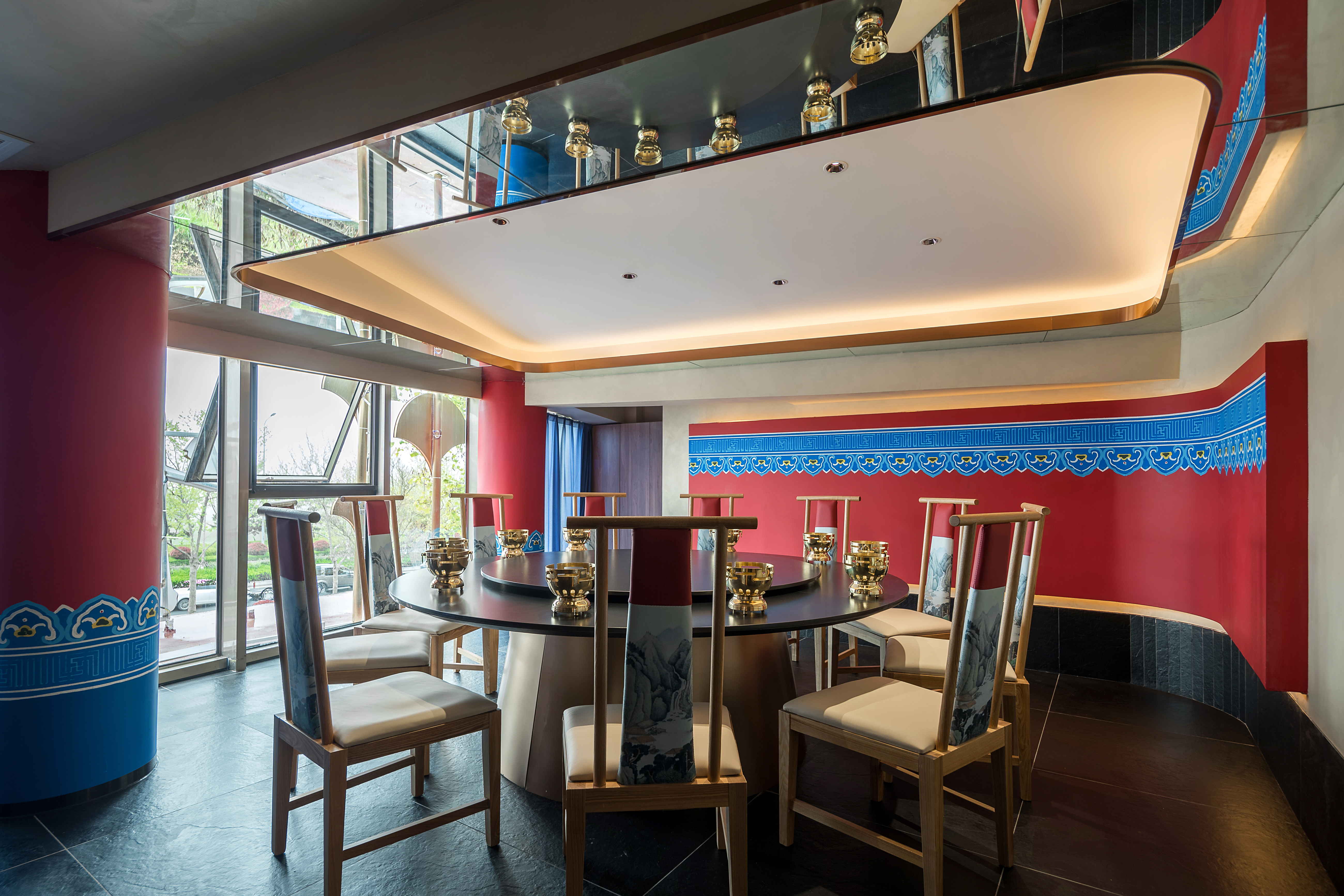 镜面材质的运用扩展空间的纵深,让较矮的包间也可以有不错的就餐体验