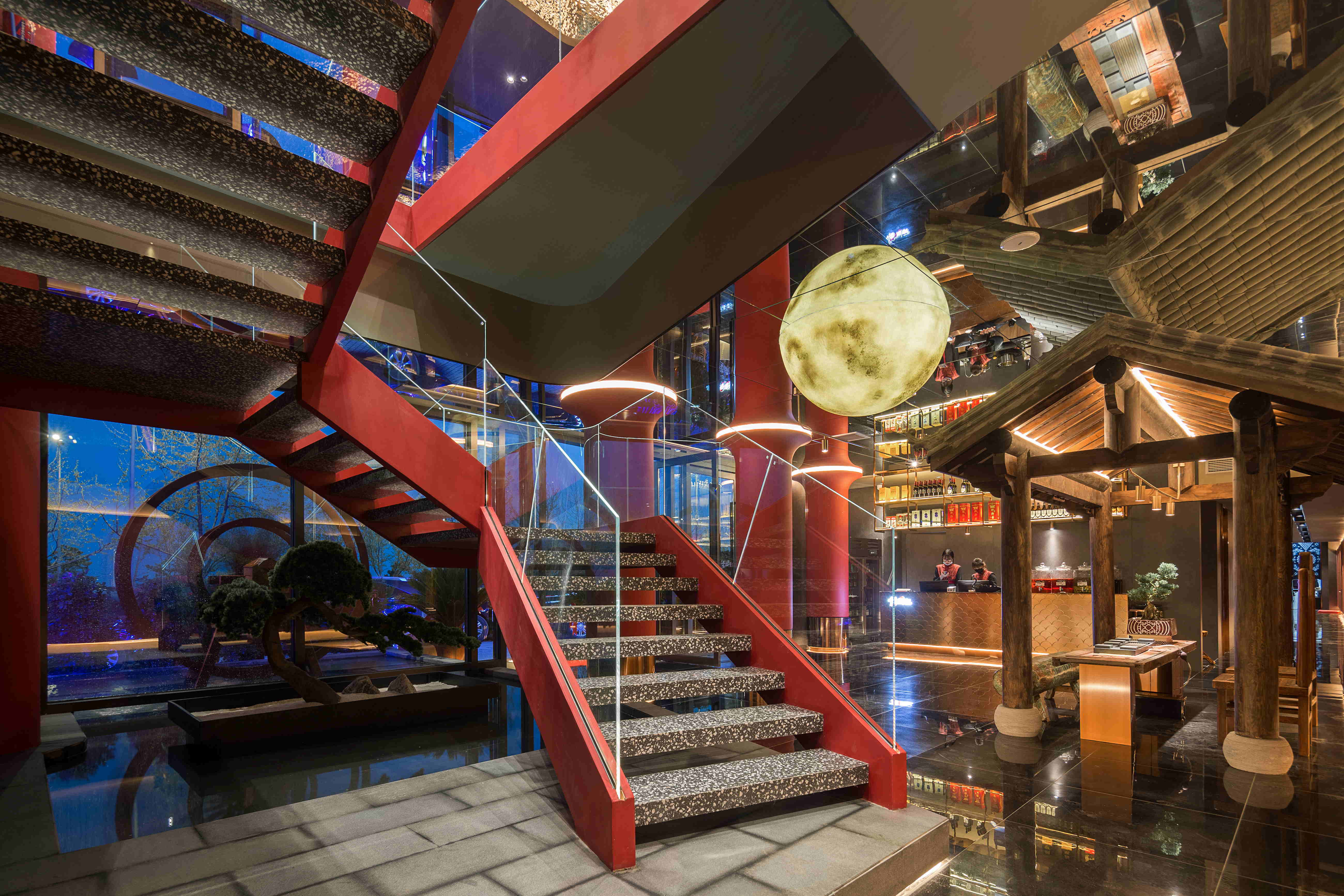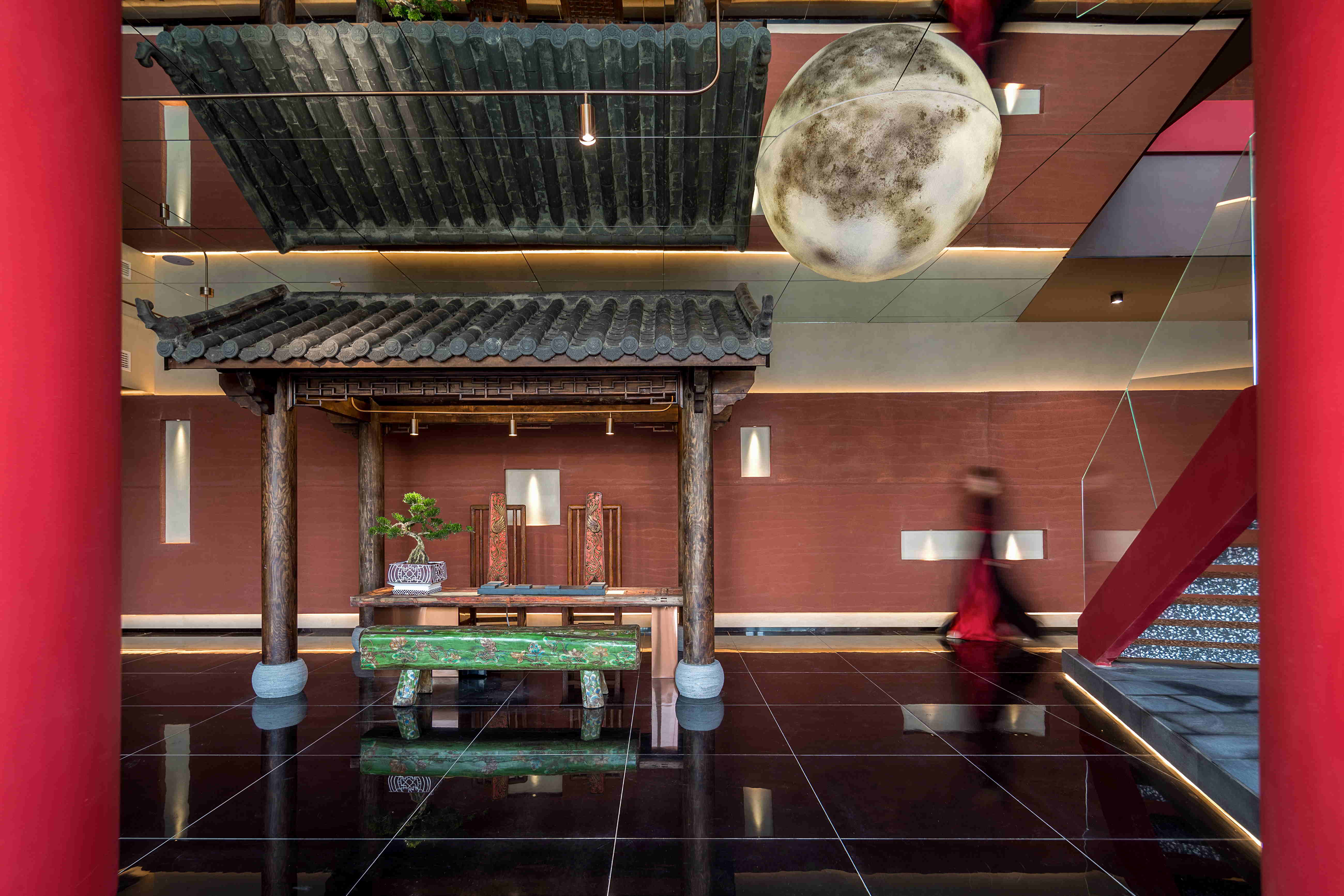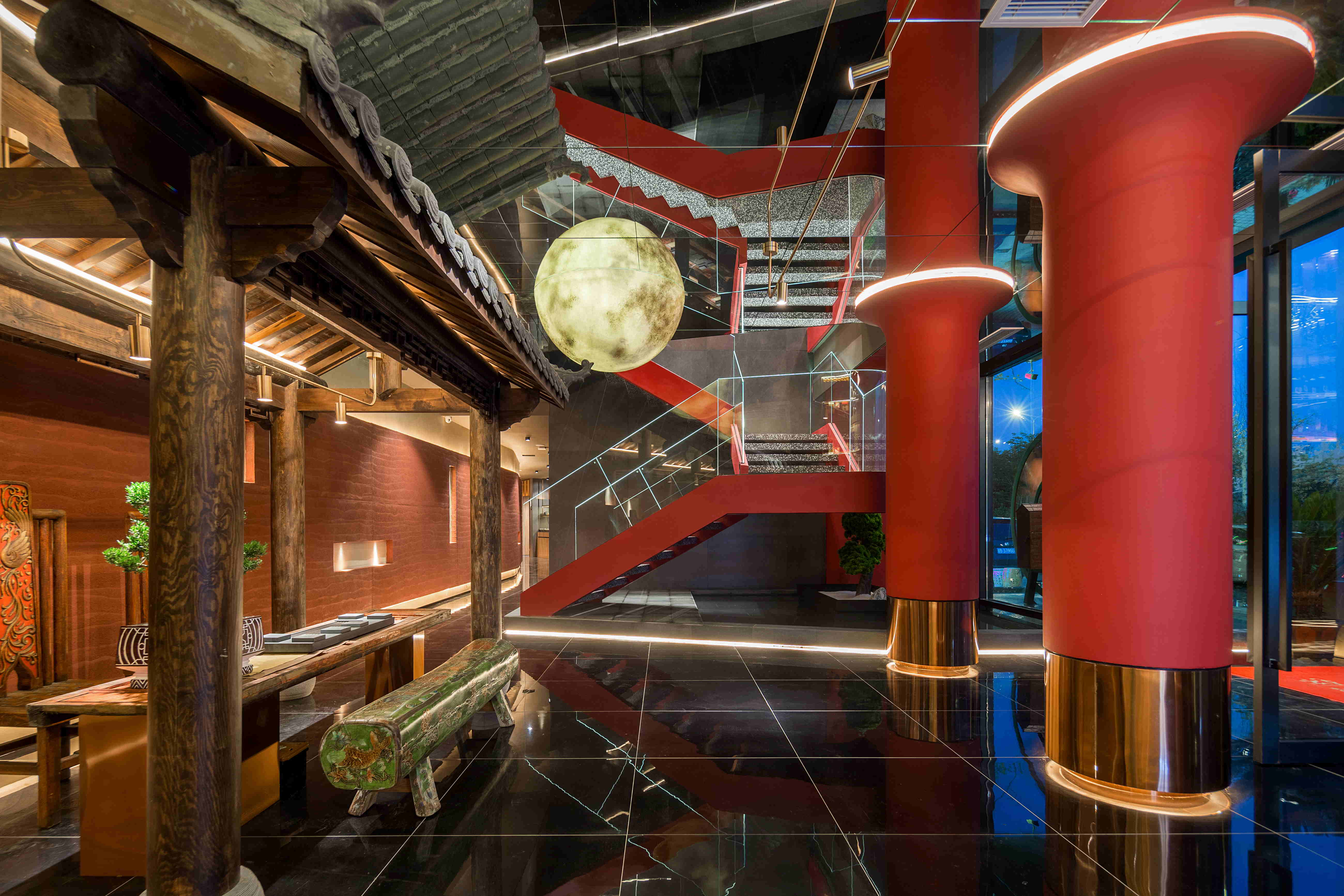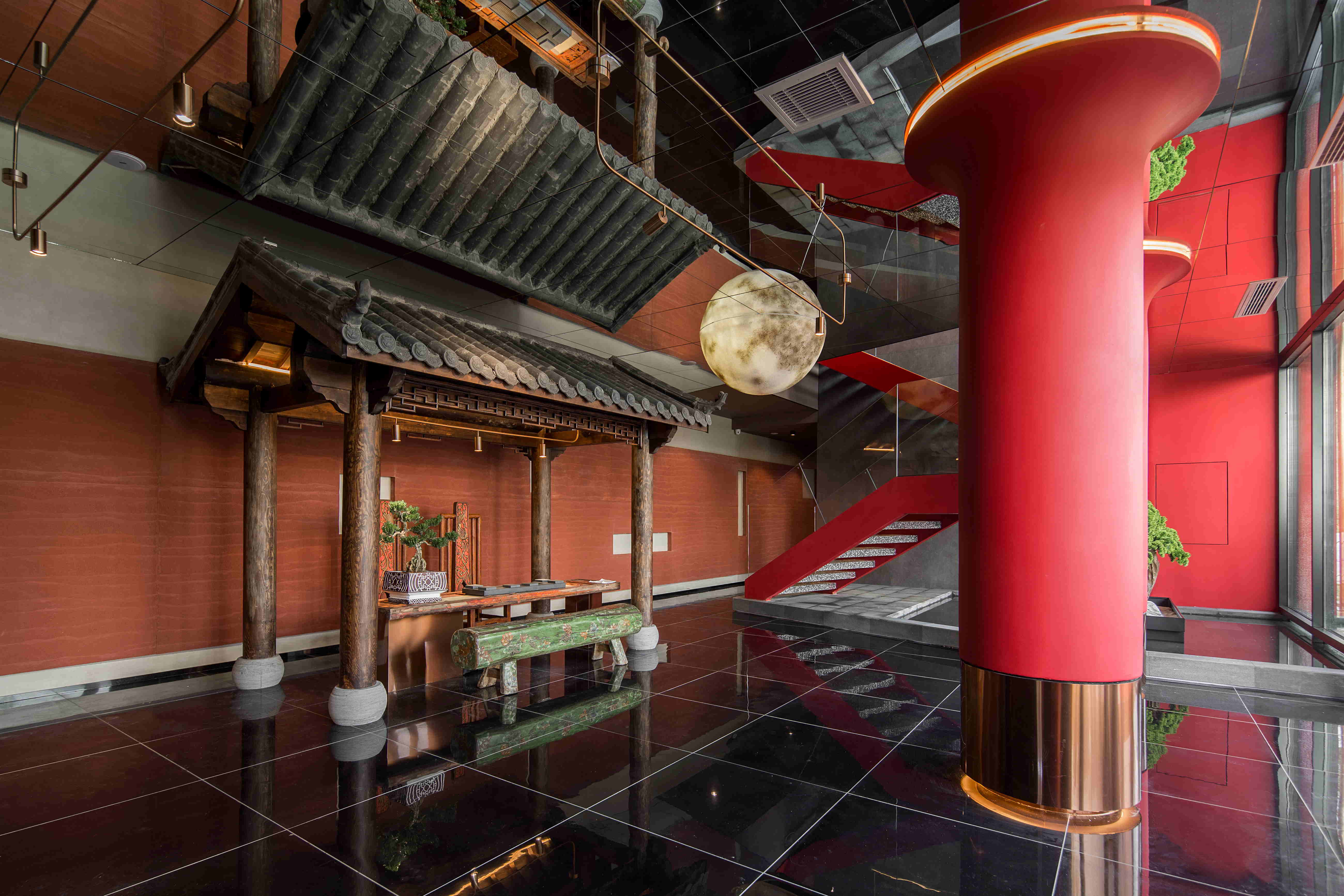 大堂使用黑色且带有反射的黑色地砖做为地面,像极了深邃而又平静的水面。吊顶采用镜面材质,半圆的月亮灯造型紧贴顶面,镜面反射其镜像便成了满月景象;镜面的运用使空间的高度得以延伸,增加了空间的纵深感。一座凉亭配以丽江特色的古物和桌椅长凳作为休息区,让整个大堂形成了一幅月下凉亭,小桥流水的唯美画面。