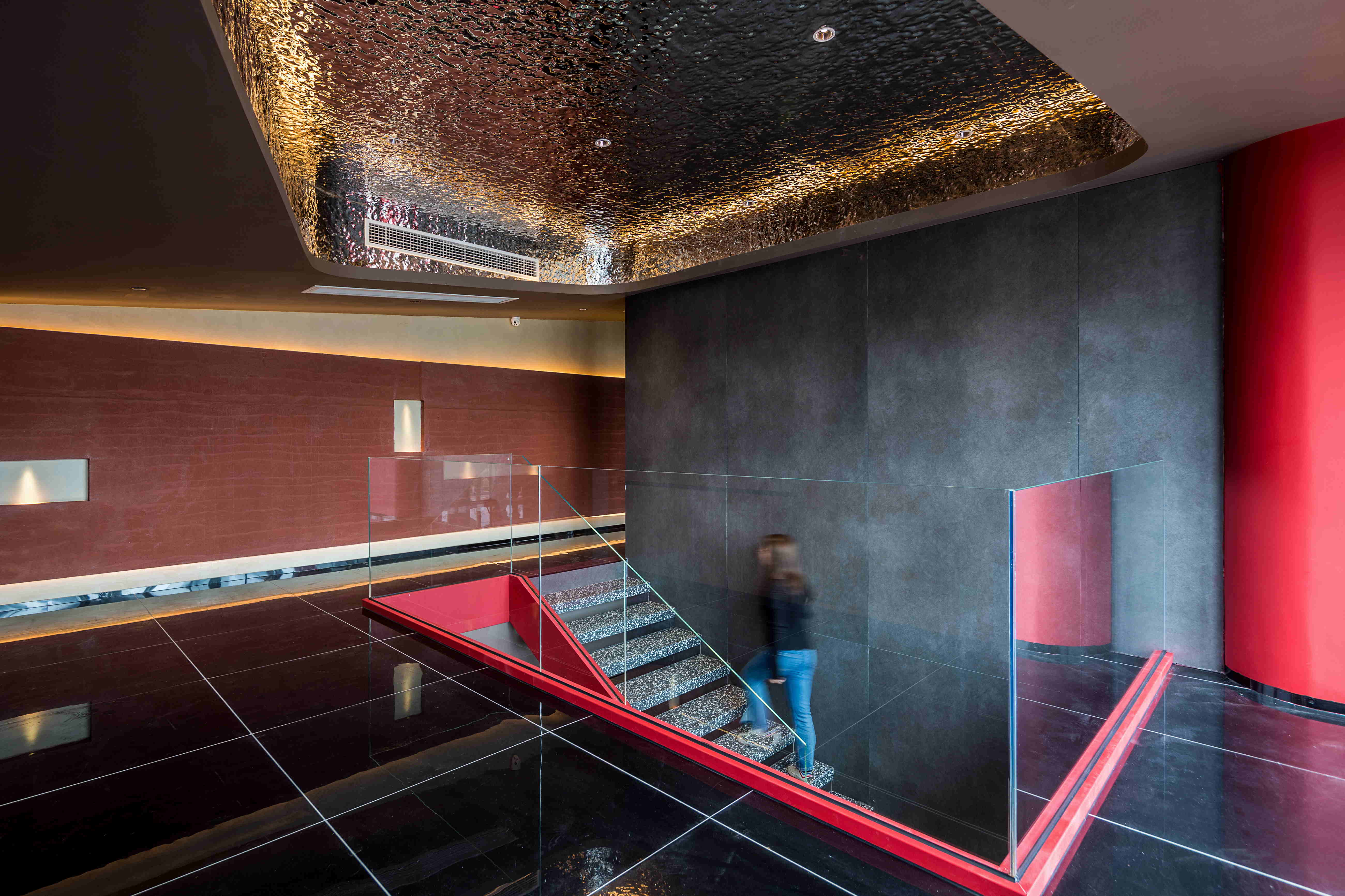楼梯做为门厅空间的大型艺术装置,设计成更具通透感的形式,玻璃内部的灯光处理渲染出扶手的线条感,红色梁结构让空间更加和谐。棱角分明及强有力的线条形式让空间更有张力。