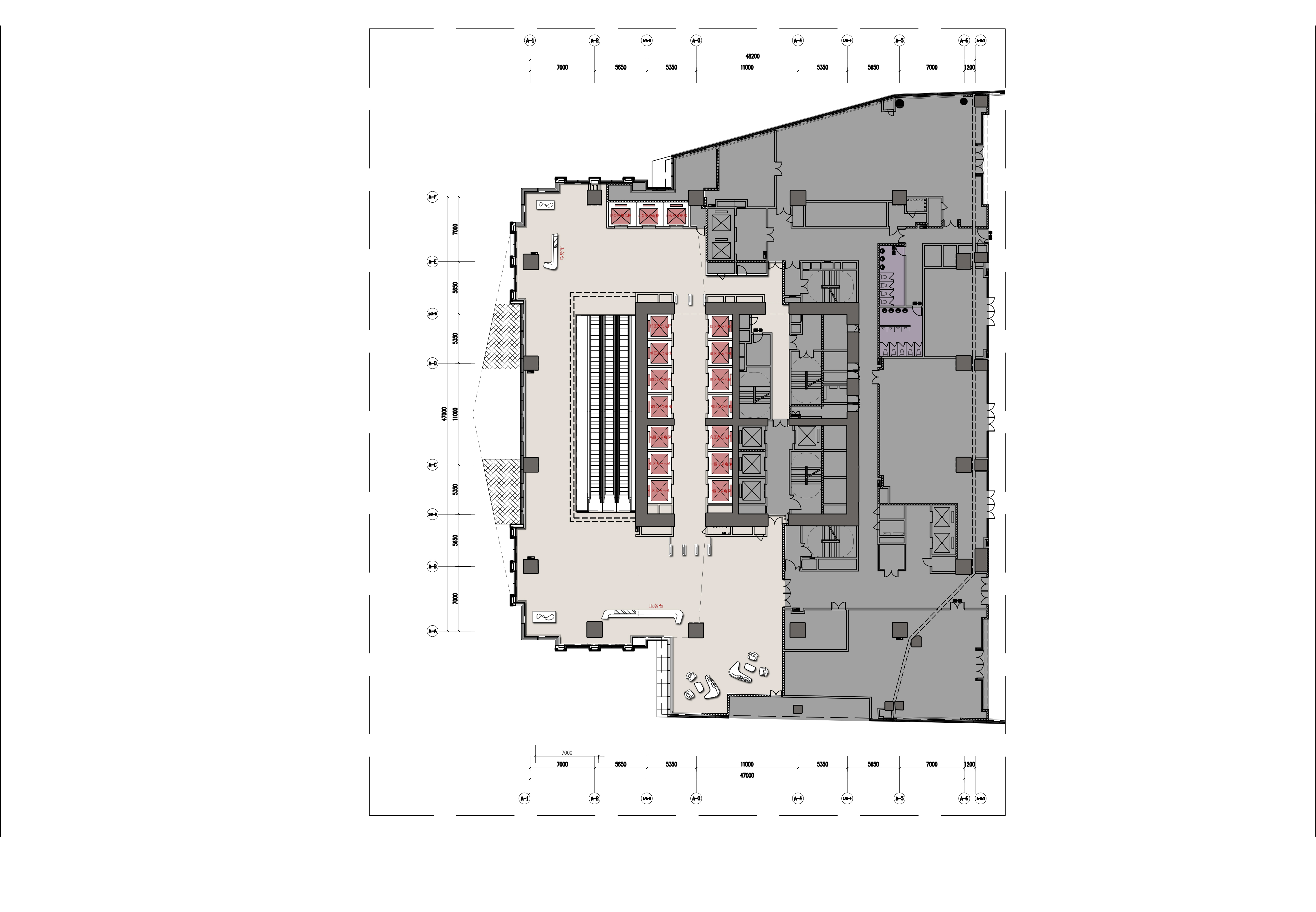 空间布局:主要接待空间由一层次大堂和三层主大堂构成,由垂直电梯和手扶电梯连接。三层大堂层高达到15米,手扶电梯连通一层空间,总的视觉高度最高可达到30米。