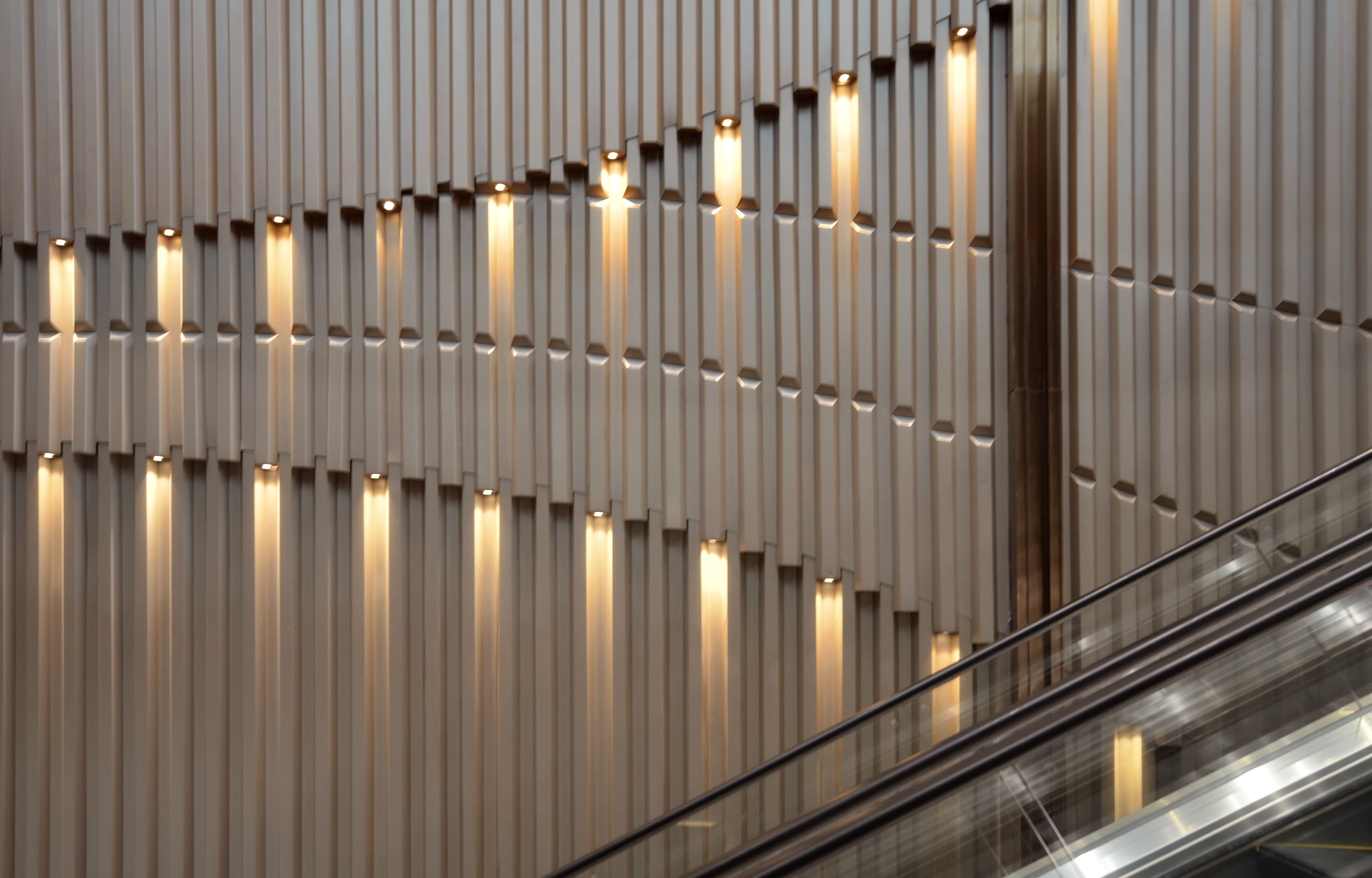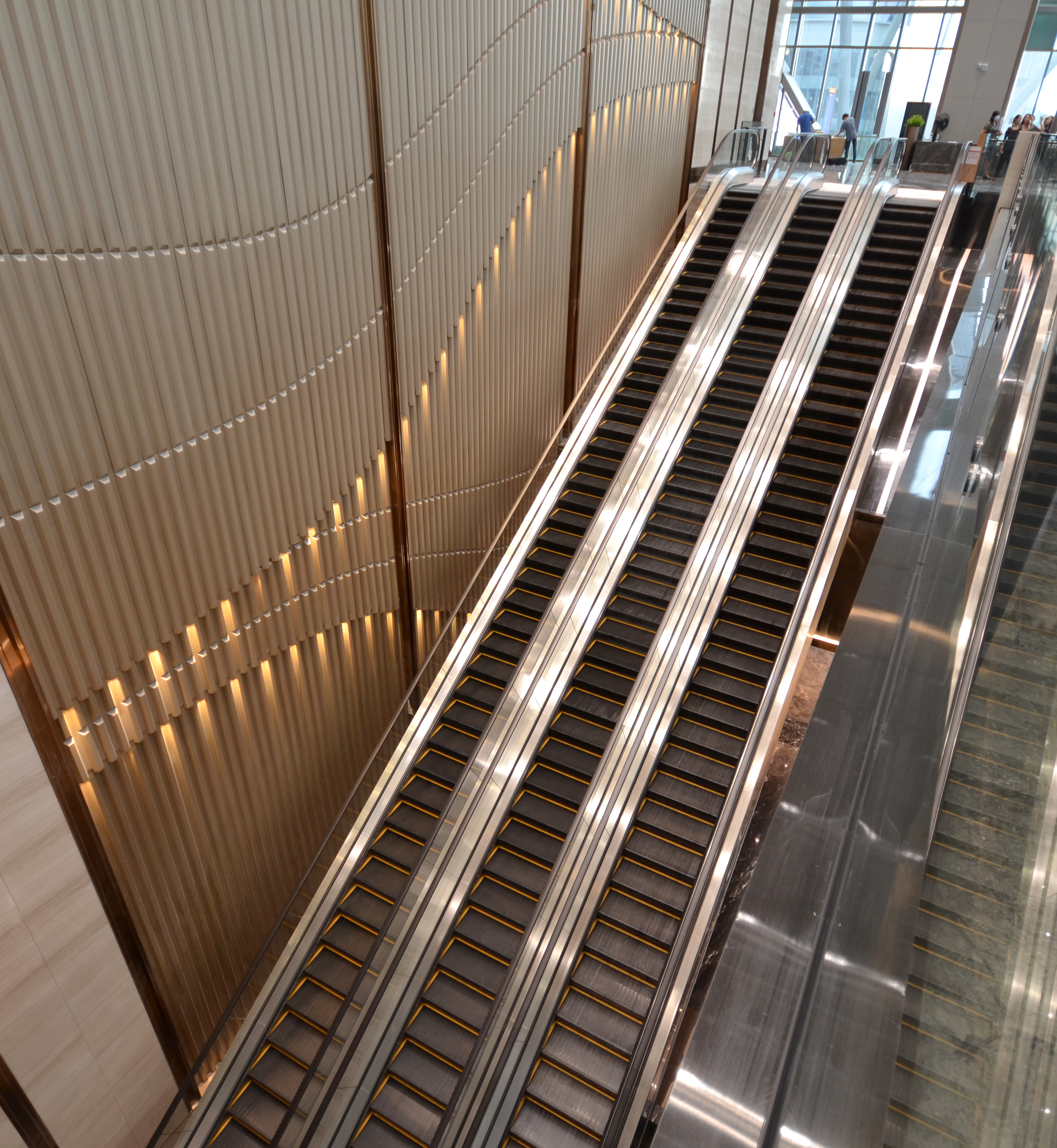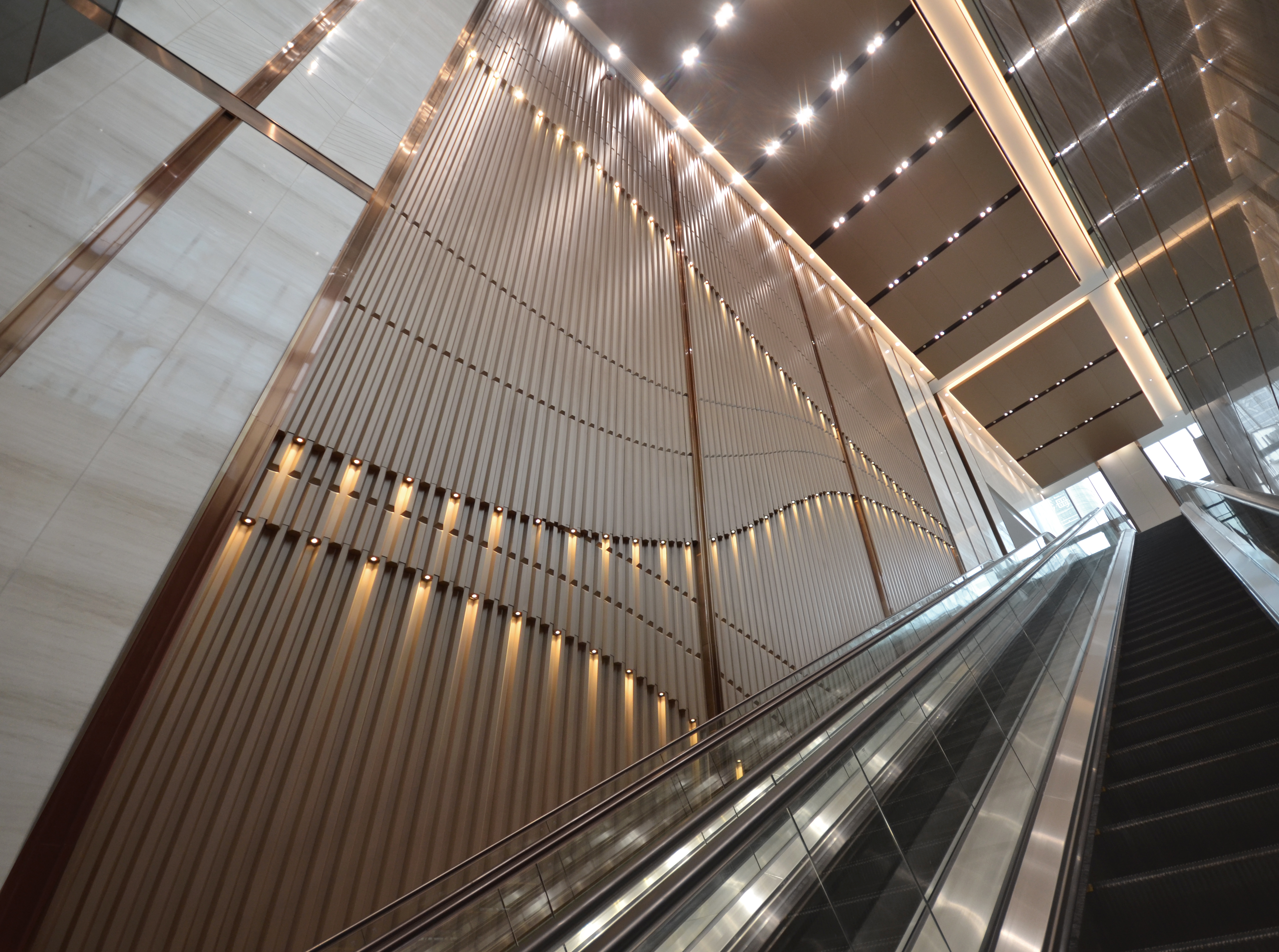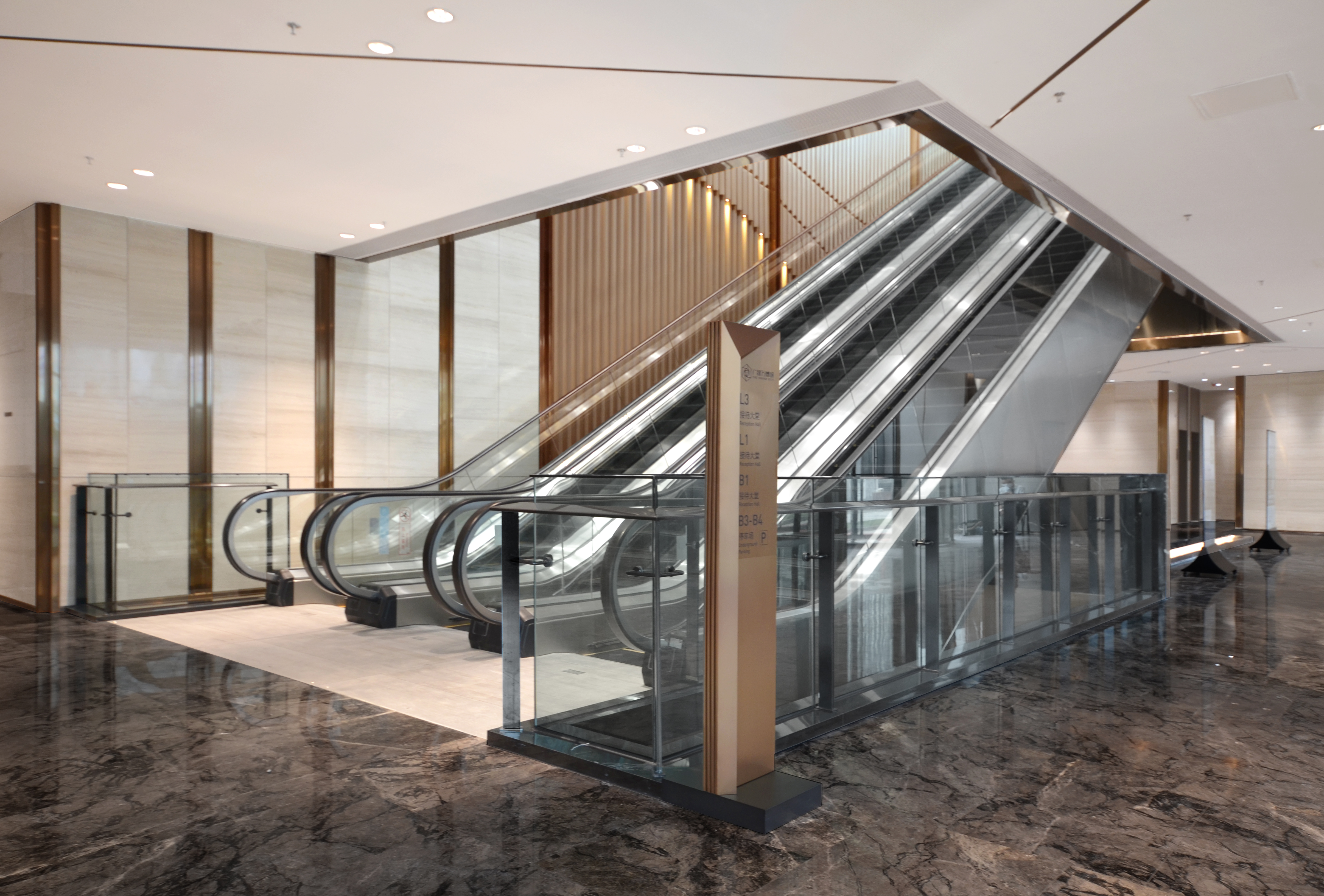 主大堂设置在三层,除了垂直电梯,还有一条超过15米高差的手扶电梯连接一层次大堂。