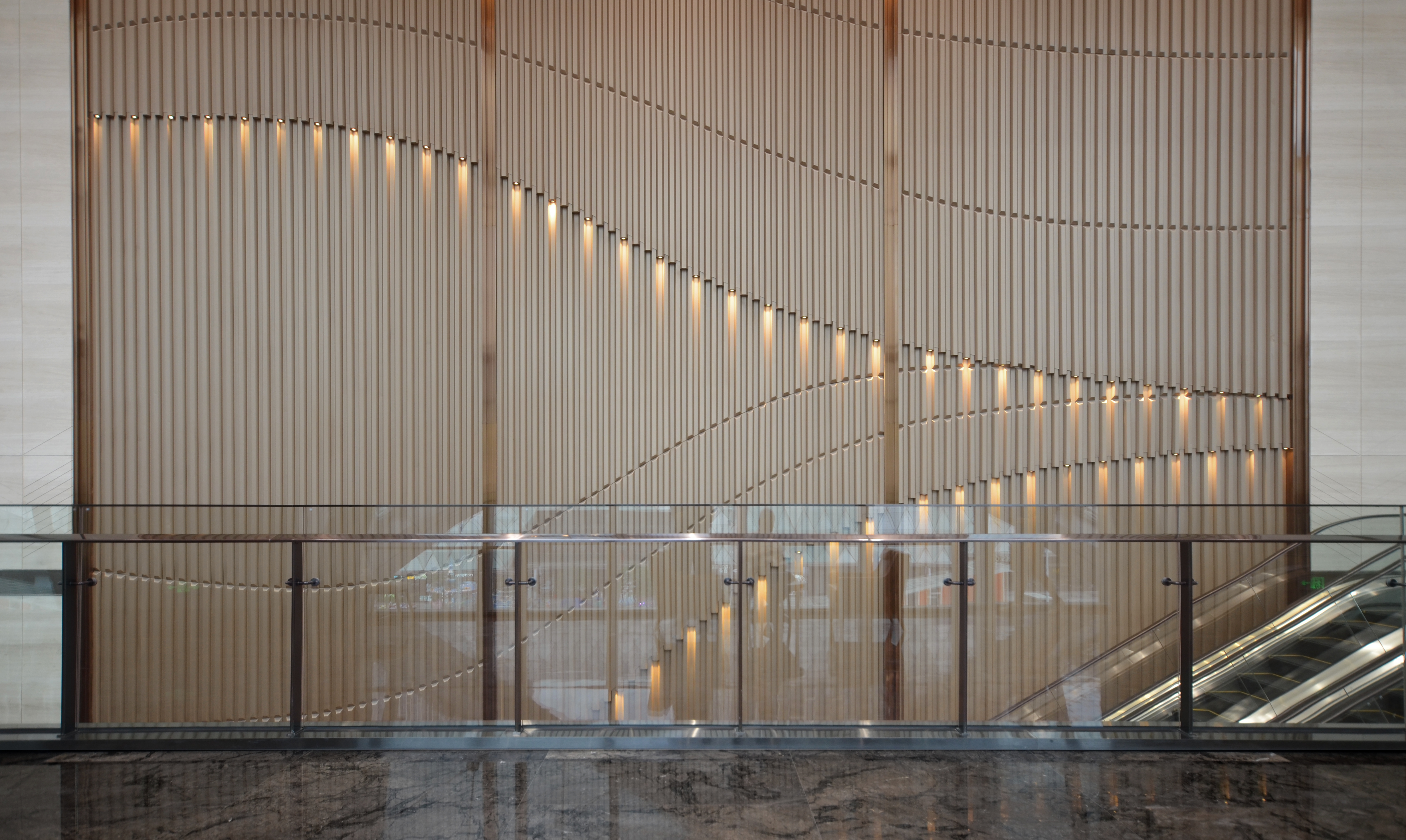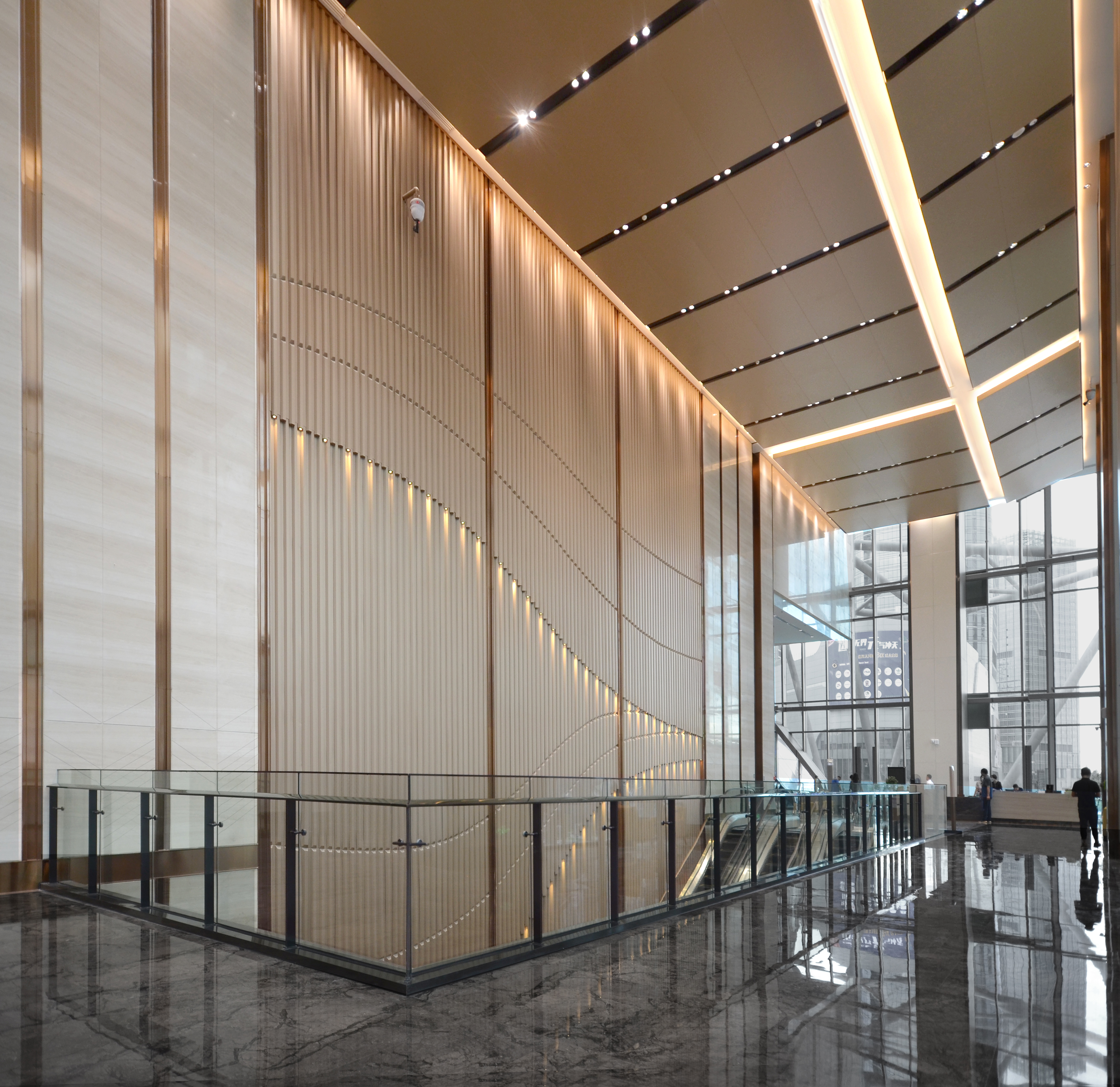 大堂主背景墙横跨一至五层空间,铝金属形体跃然而上的姿态,直指人心的力量油然而生,遵循黄金比例分割的线条,由此可见曾仕乾打破思维界限的独特个性。以极简的线条连接东方与西方、世界与广州。