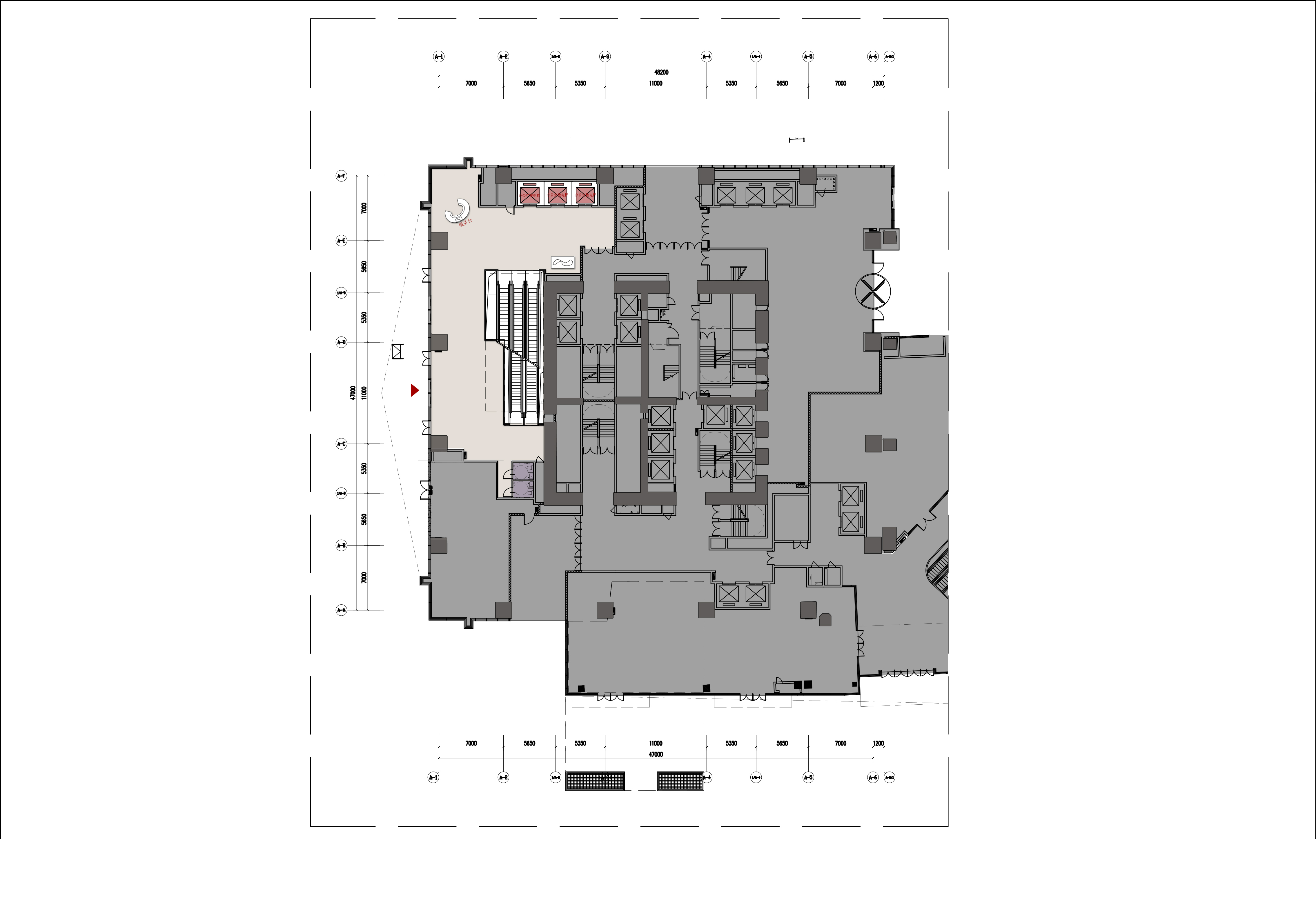 一层大堂为转换空间,是五十六层写字楼的次大堂,打破写字楼主大堂设置在首层的传统边界和单一性。