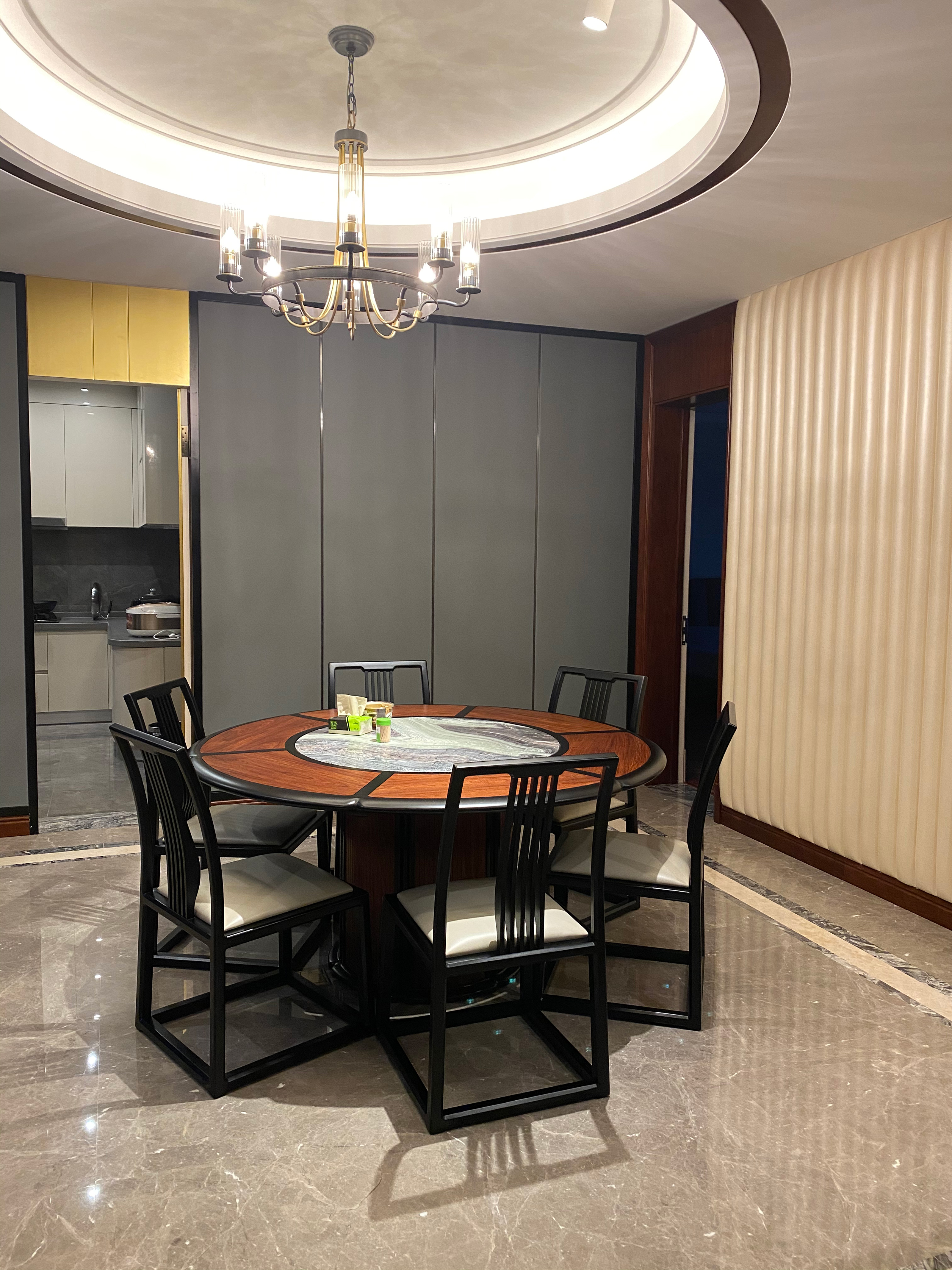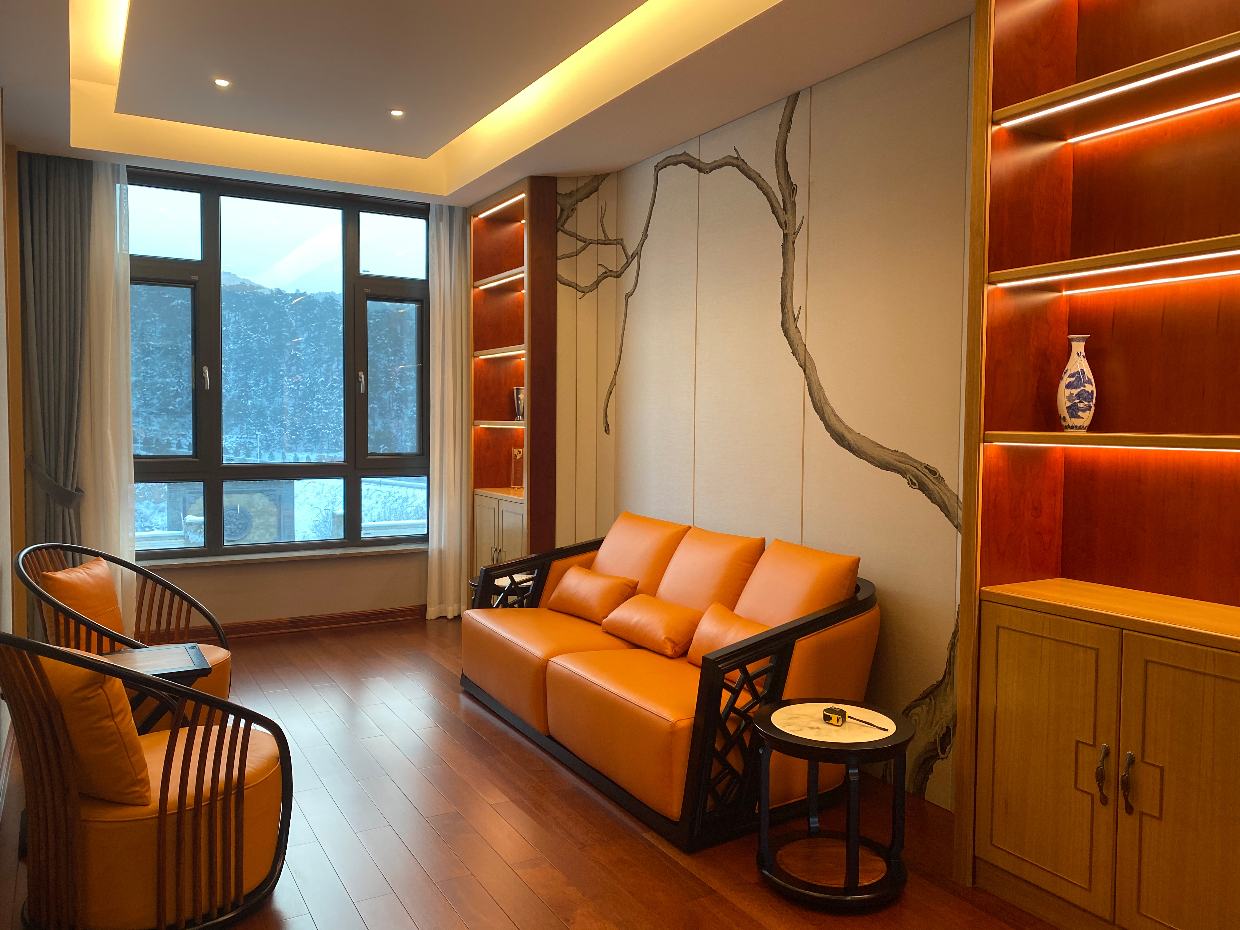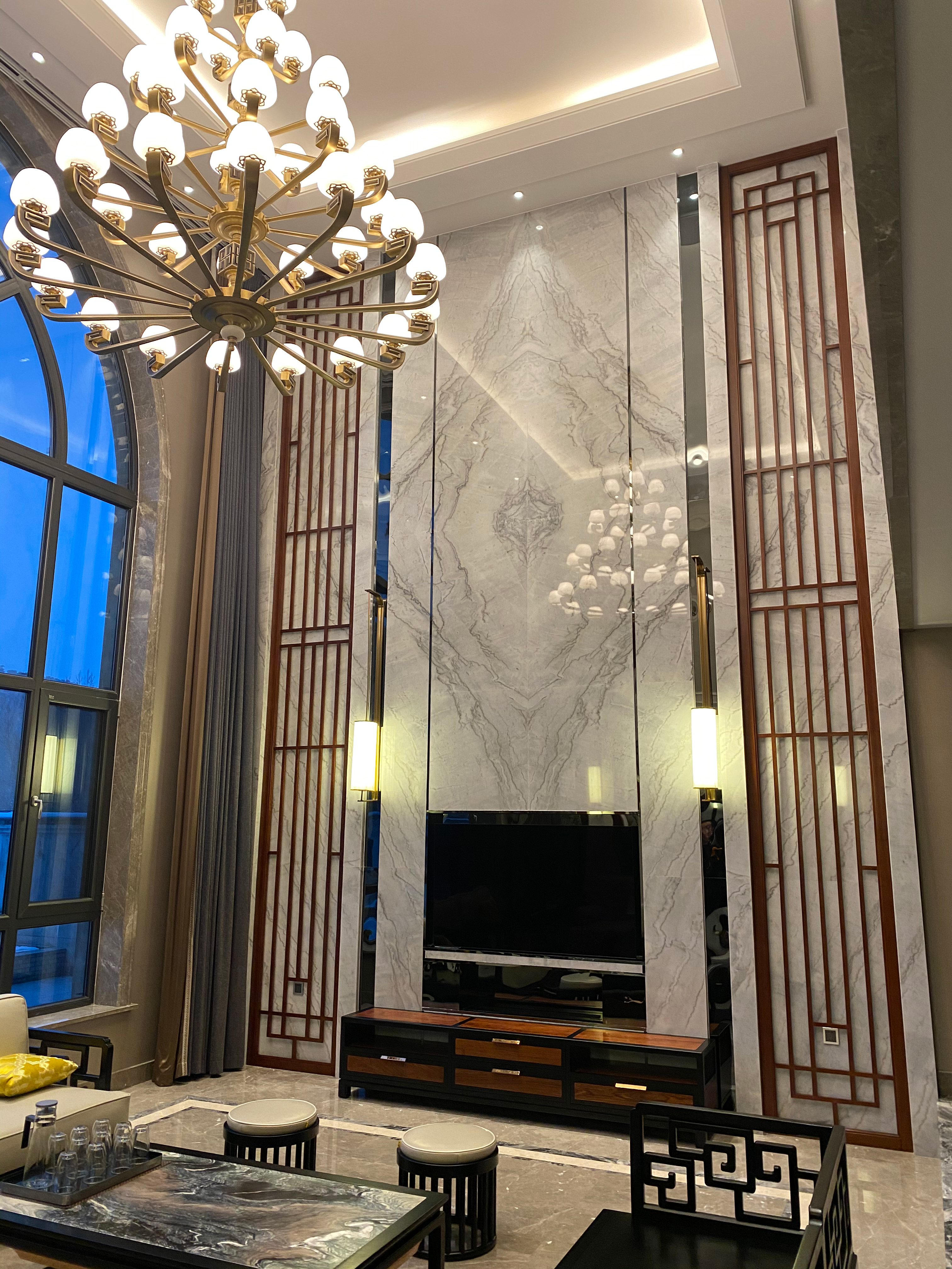 设计选材:空间中大量使用木元素,用传统的符号和元素进行抽象,提取精神意向,以传统中式线条和图案造型搭配现代材料进行创新的设计,演绎古朴的现代家居风范。