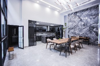 将一层空间高挑空保留,将原有高挑空四扇非标准窗口打通,扩大采光面积和通风效果;负一层采用厨房、餐饮、室内景观均分的布局,满足女业主的烘焙需求 -