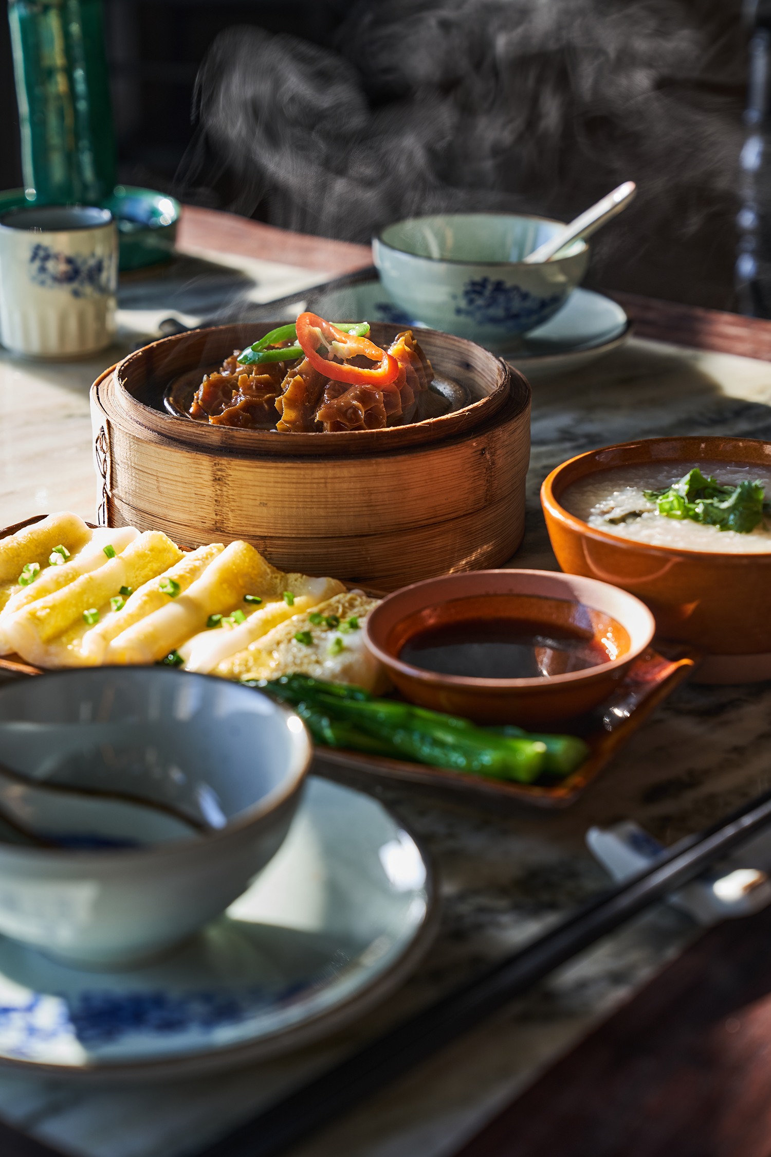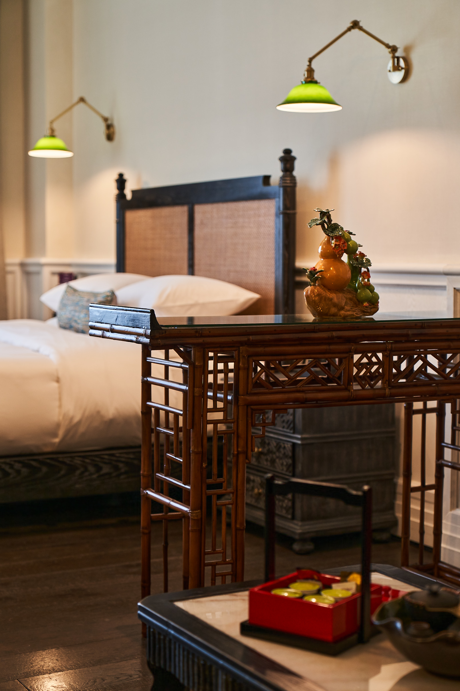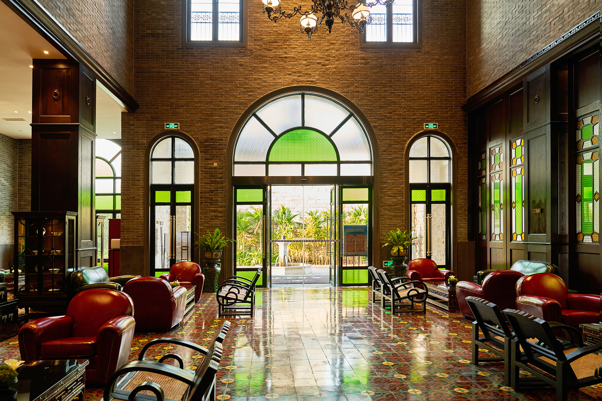 木廊、石柱、花窗、騎樓之間,又如青石磚、花地板、滿洲窗之間,甚至在花瓶和書籍的擺設,在真皮沙發、手工紅木傢俬、酸枝木和鑲嵌大理石桌面以至手工石灣陶瓷燭台之間,賓客都可以感受到濃濃的嶺南文化。 -