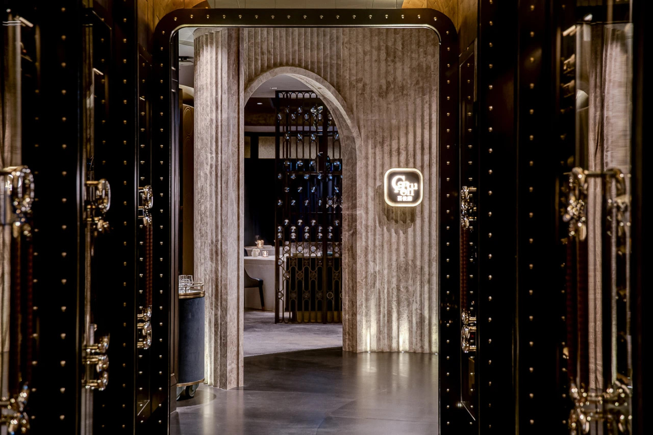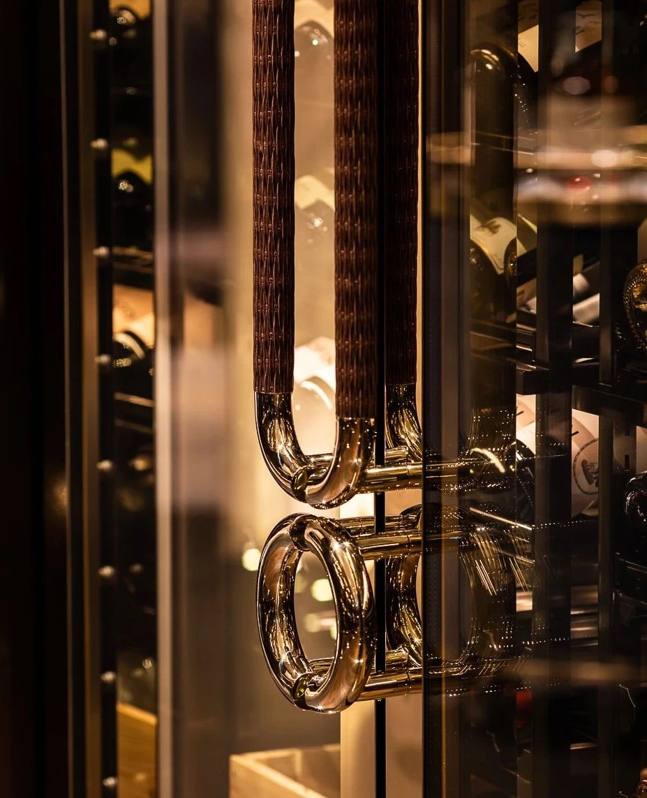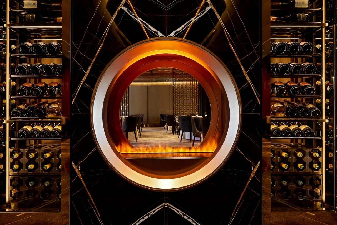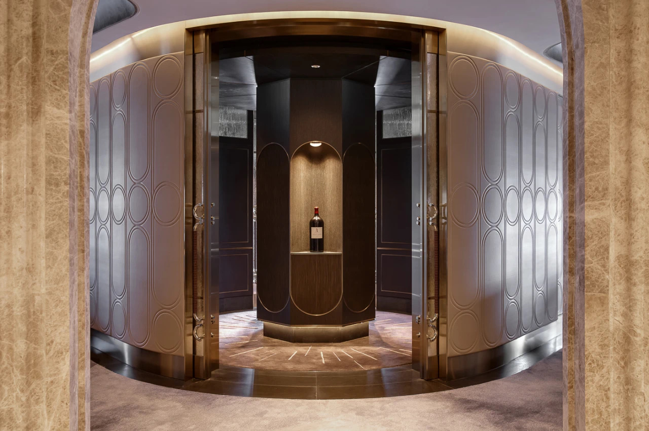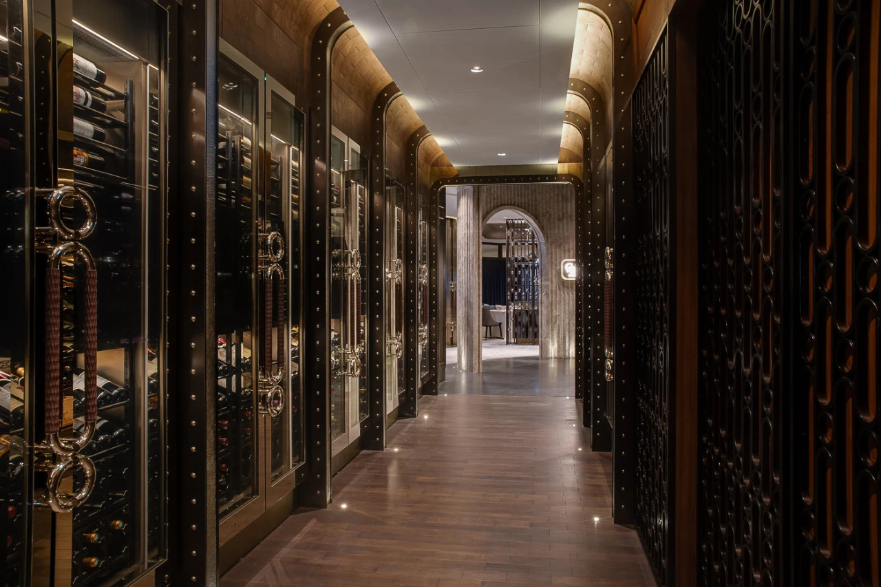 為連接酒吧與正式用餐區域的重要體驗,設計師巧妙地令賓客“必須”經過此處這長長的豪華「品酒廊」—— 走過這酒廊時,賓客們自然地沈澱心境,並過渡到尊貴與正式的情緒當中。