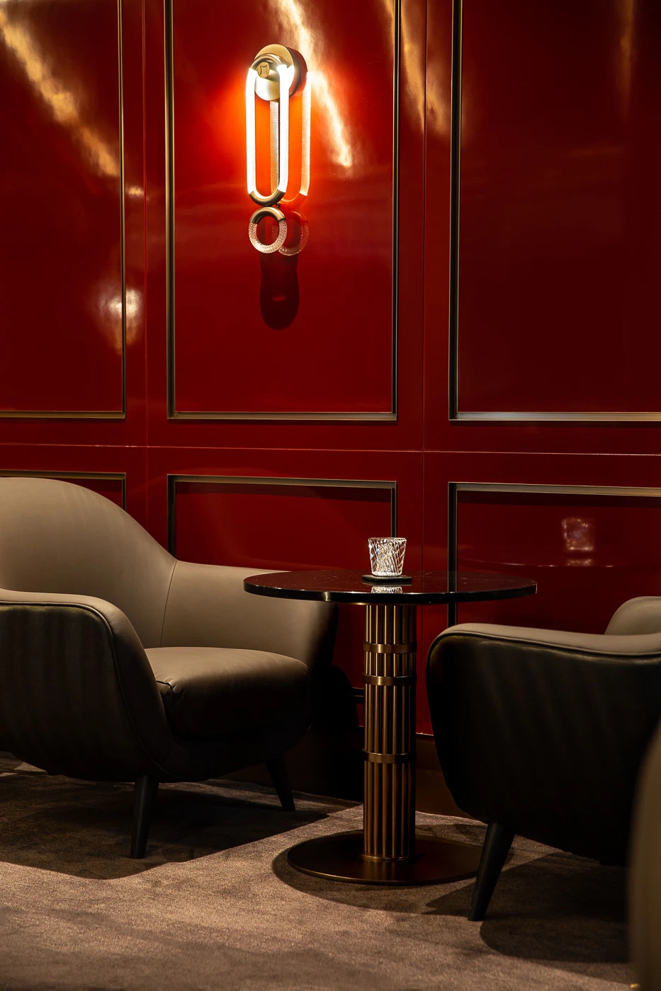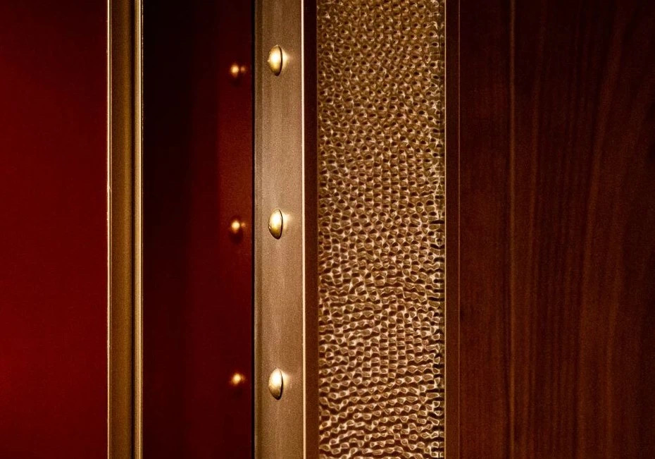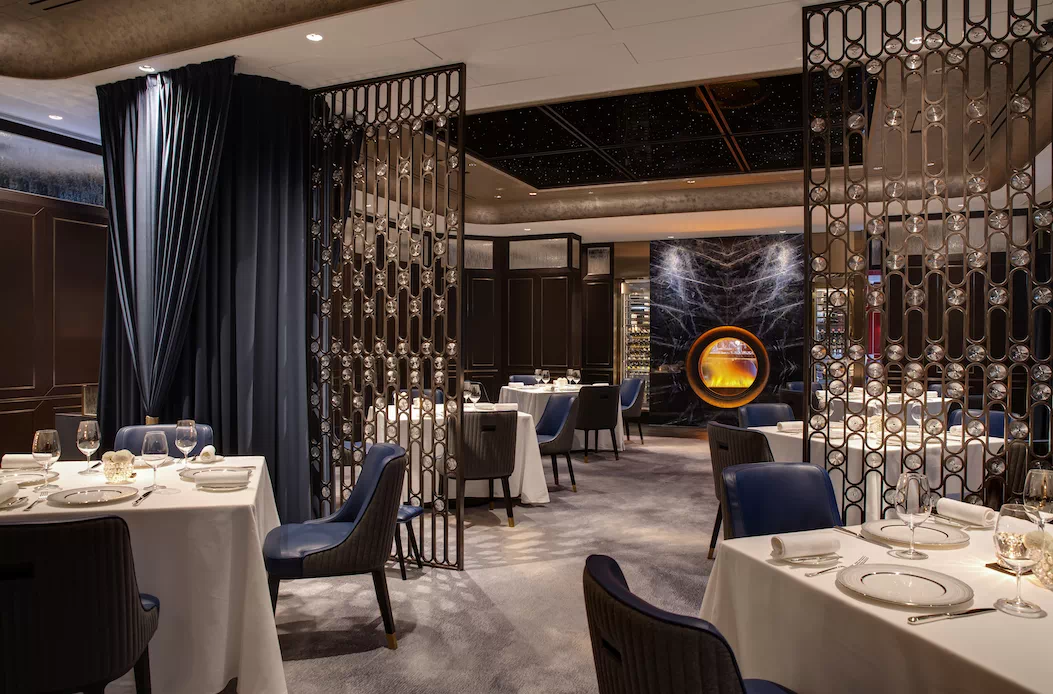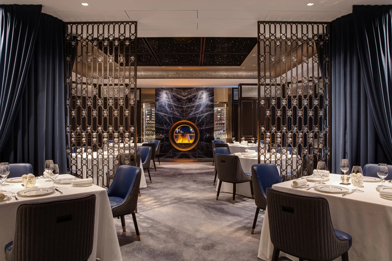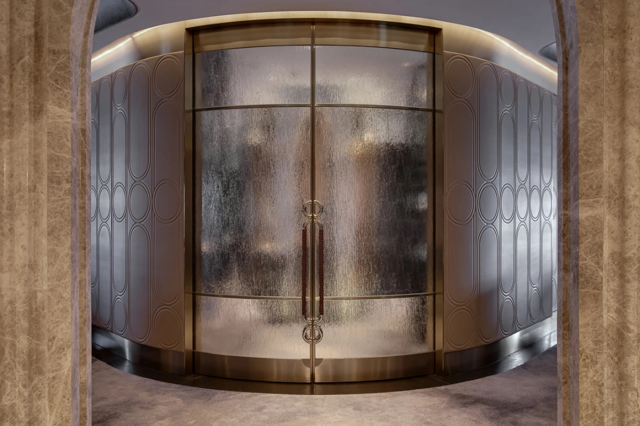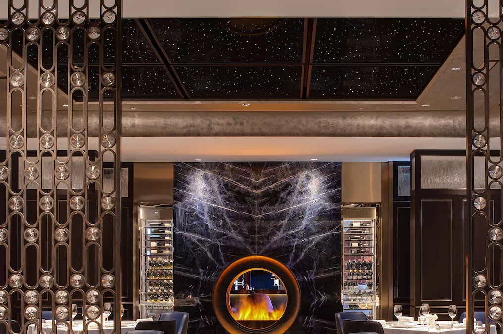 為連接酒吧與正式用餐區域的重要體驗,設計師巧妙地令賓客“必須”經過此處這長長的豪華「品酒廊」—— 走過這酒廊時,賓客們自然地沈澱心境,並過渡到尊貴與正式的情緒當中。