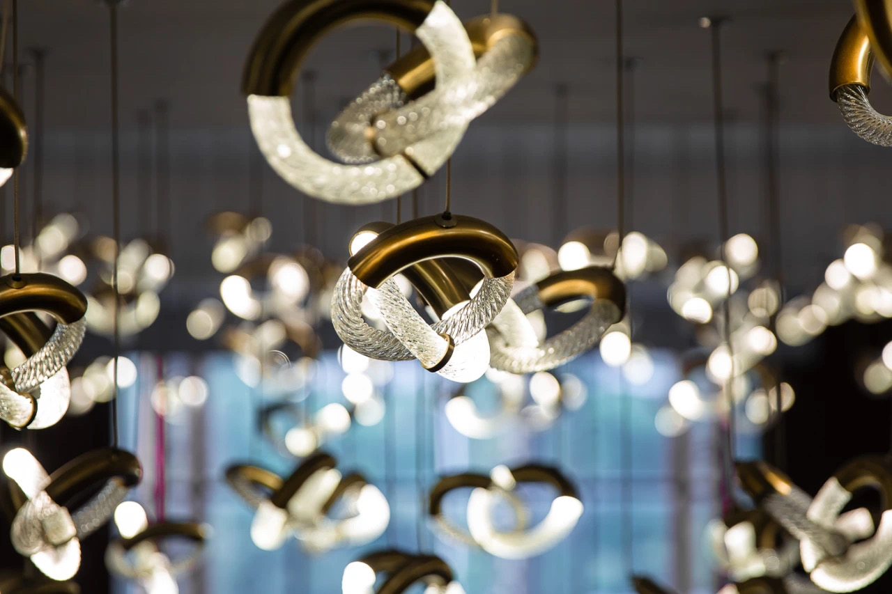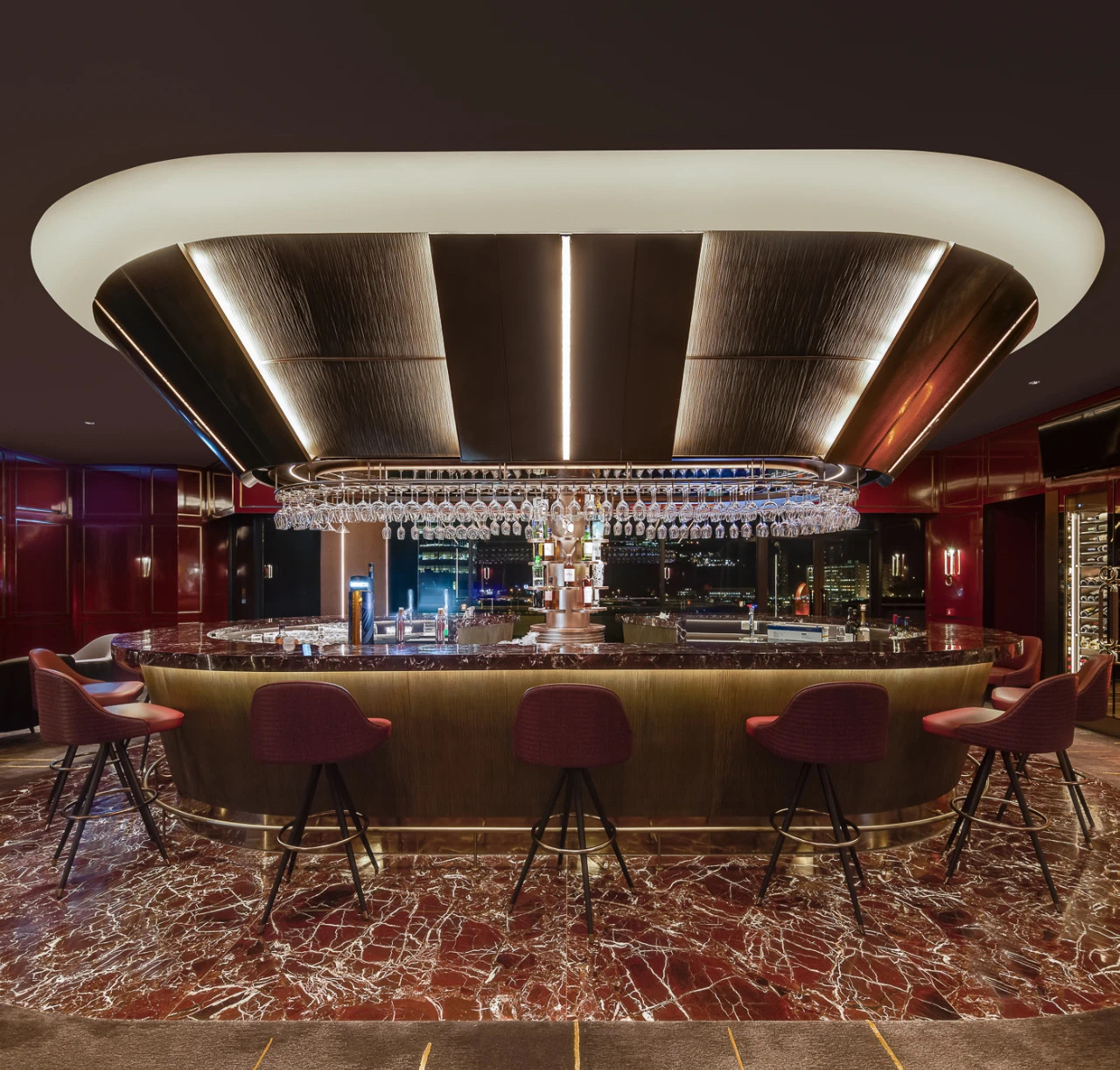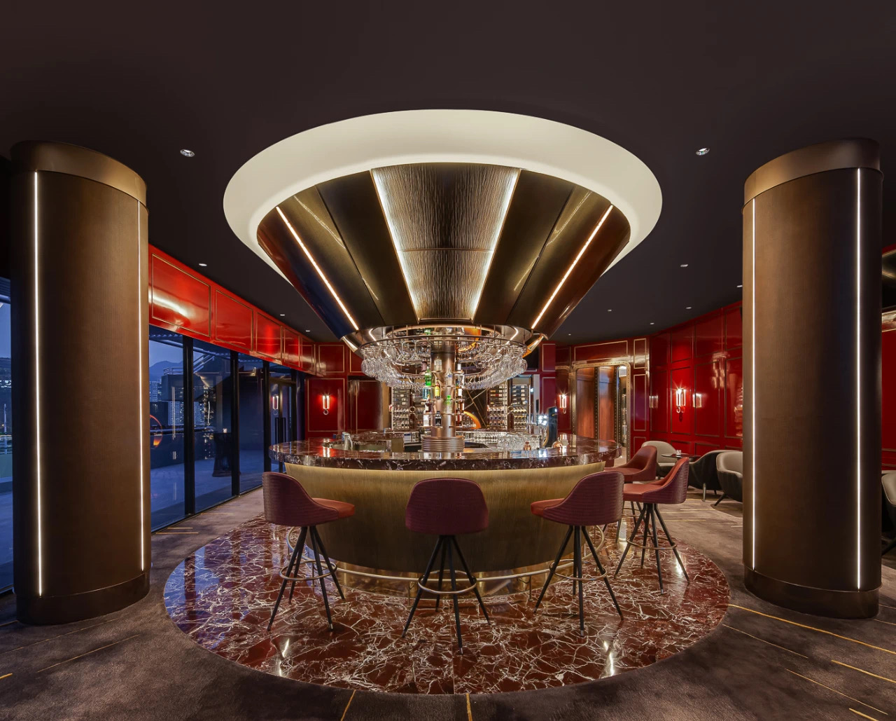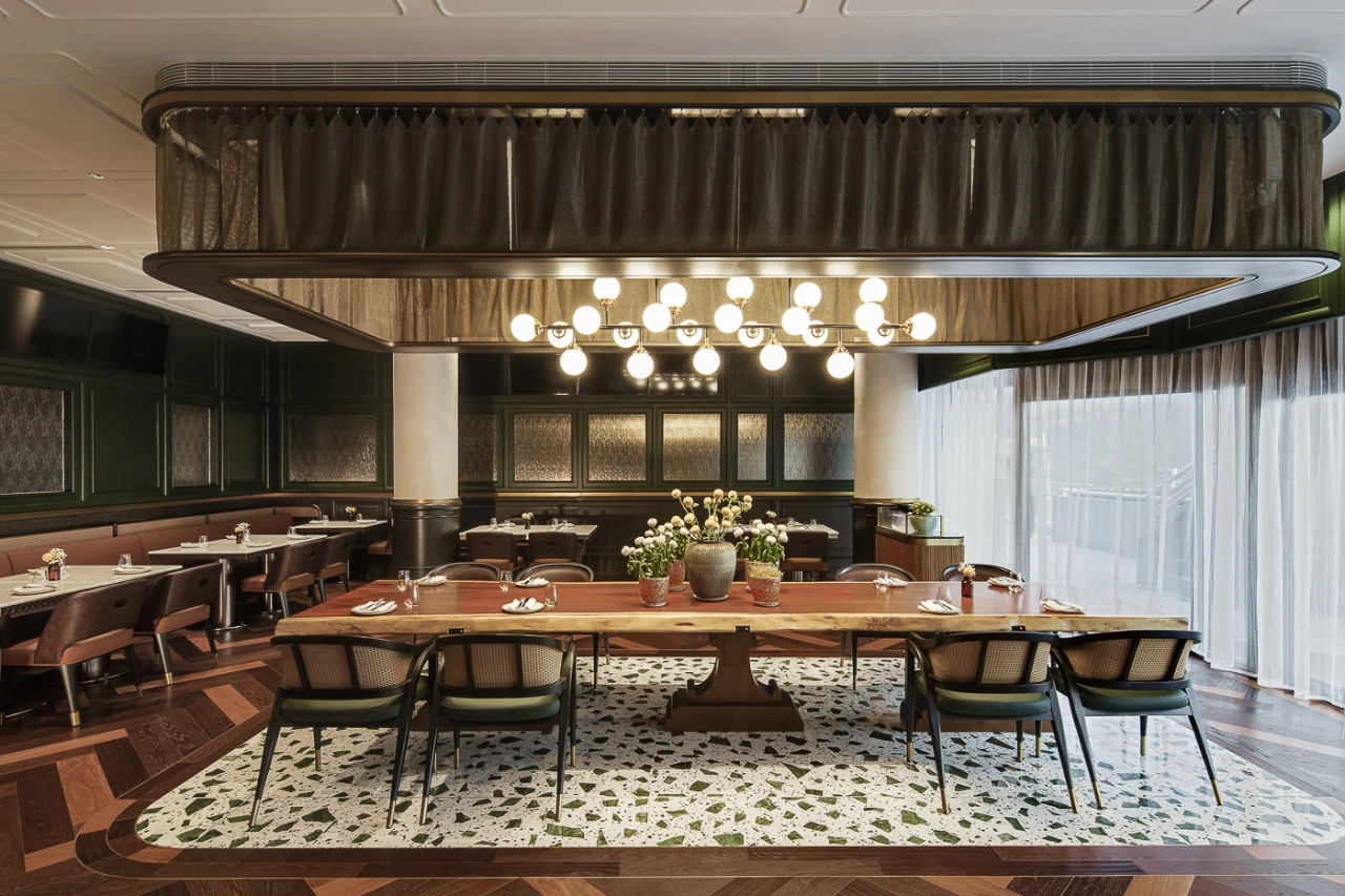 空间意境:1980 年代的傳奇名句駒 Rive Verdon(翠河)的馬主在沙田馬厩上掛上銅錢,以寓意著好運與勝利,而這個傳統幫助到我們的設計師發揮想像力,經過現代化的改造,「銅錢」元素貫穿了所有餐飲和娛樂區的設計—— 包括燈飾、把手,甚至牆壁和地板圖案。